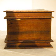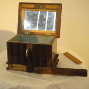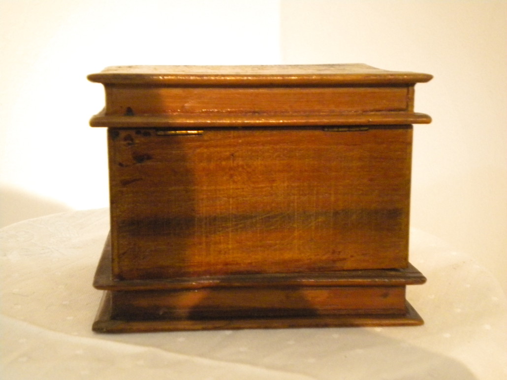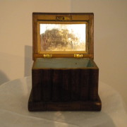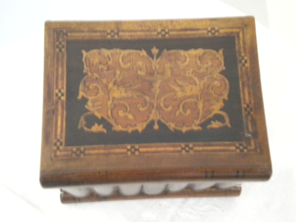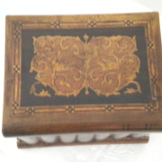 La scatola presenta un intarsio di vari legni sul coperchio, all’interno è applicato uno specchio, l’imbottitura che riveste internamente la scatola è in capitonè azzurro.