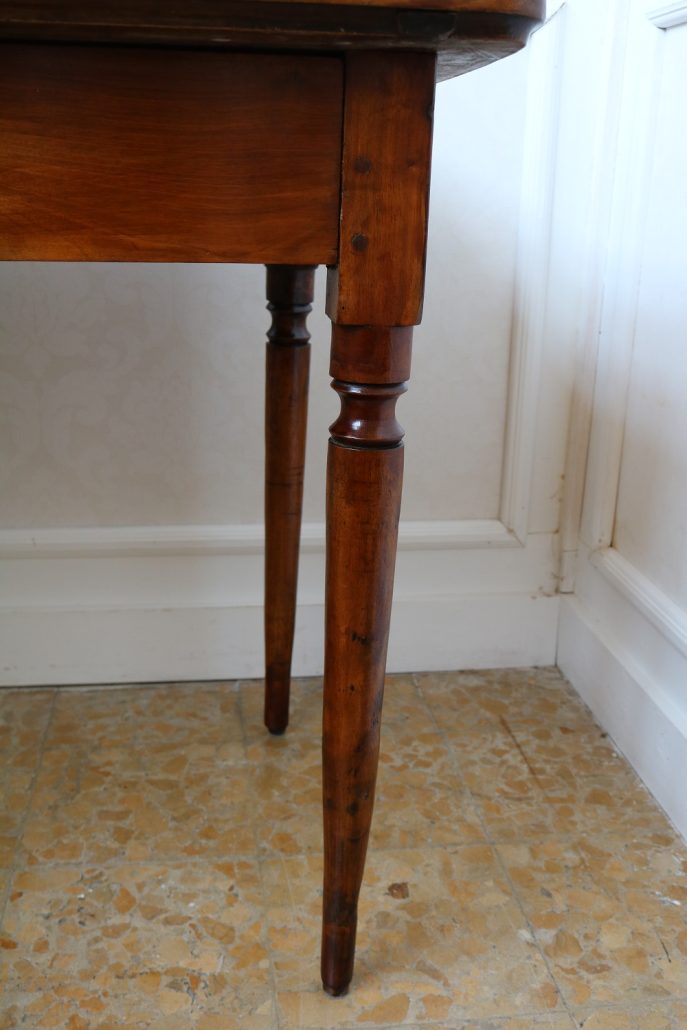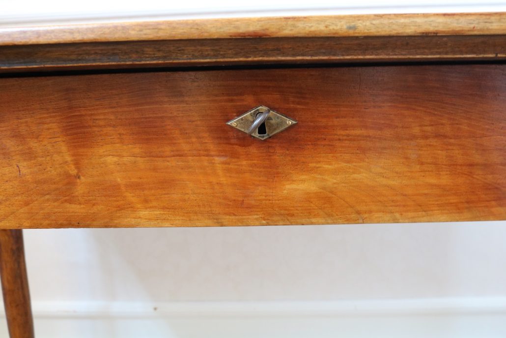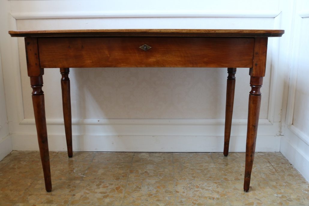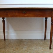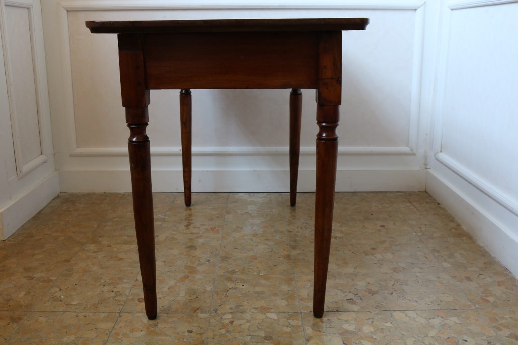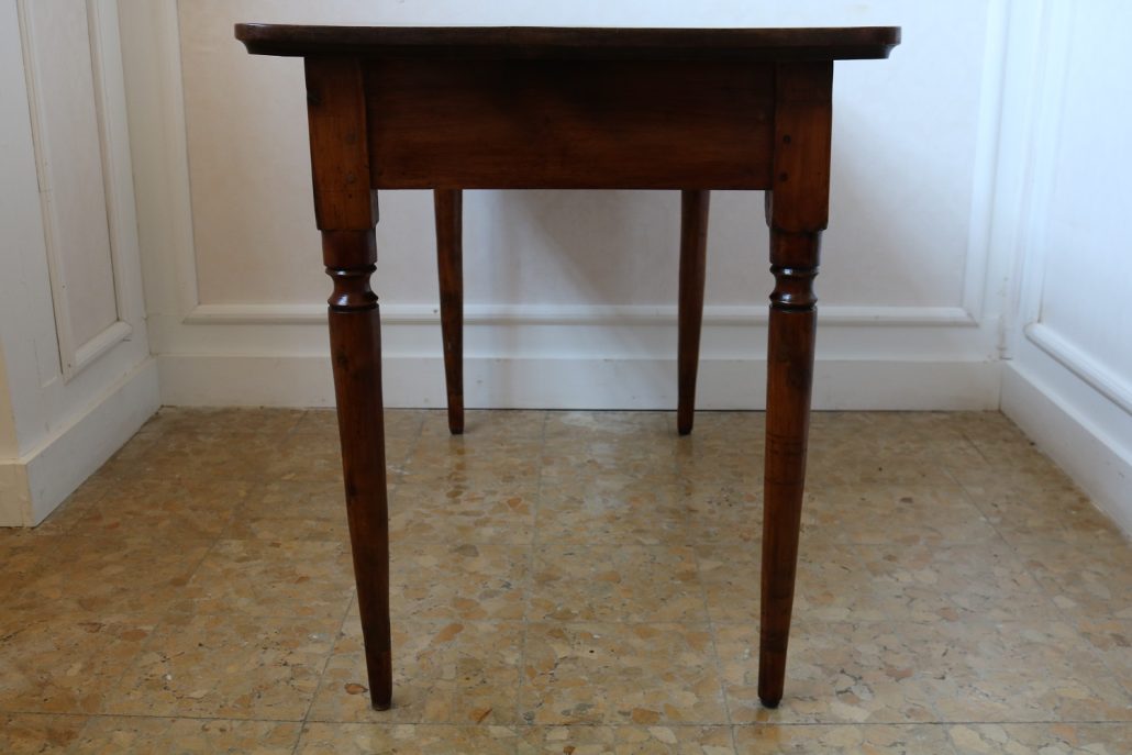 Scrittoio direttorio in noce. Quattro gambe tornite e rastremate, presentano un collarino nei pressi dell’innesto alla fascia sottopiano, dove, frontalmente, è presente un ampio cassetto munito di serratura e suddiviso in comparti al suo interno. Il piano, realizzato in un unico pezzo, presenta un’accentuata sporgenza dalla struttura e si caratterizza per gli angoli stondati, unica decorazione una discreta modanatura nella parte inferiore per alleggerire il notevole spessore. Il mobile di semplicissimo disegno, rivela una particolare ricercatezza nell’unione tra spessori notevoli e leggerezza della composizione. Le superfici, totalmente lisce, enfatizzano la bellezza della nobile essenza di noce. Questo arredo risulta quindi molto leggero e raffinato ma al contempo solido e semplice, tipiche caratteristiche dello stile direttorio sul finire del XVIII Secolo.