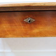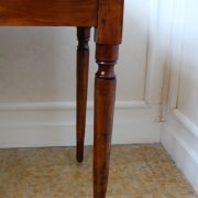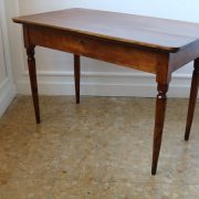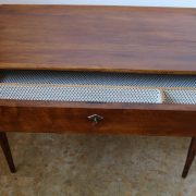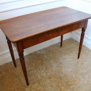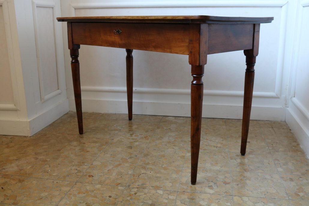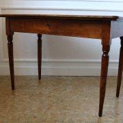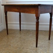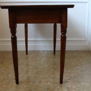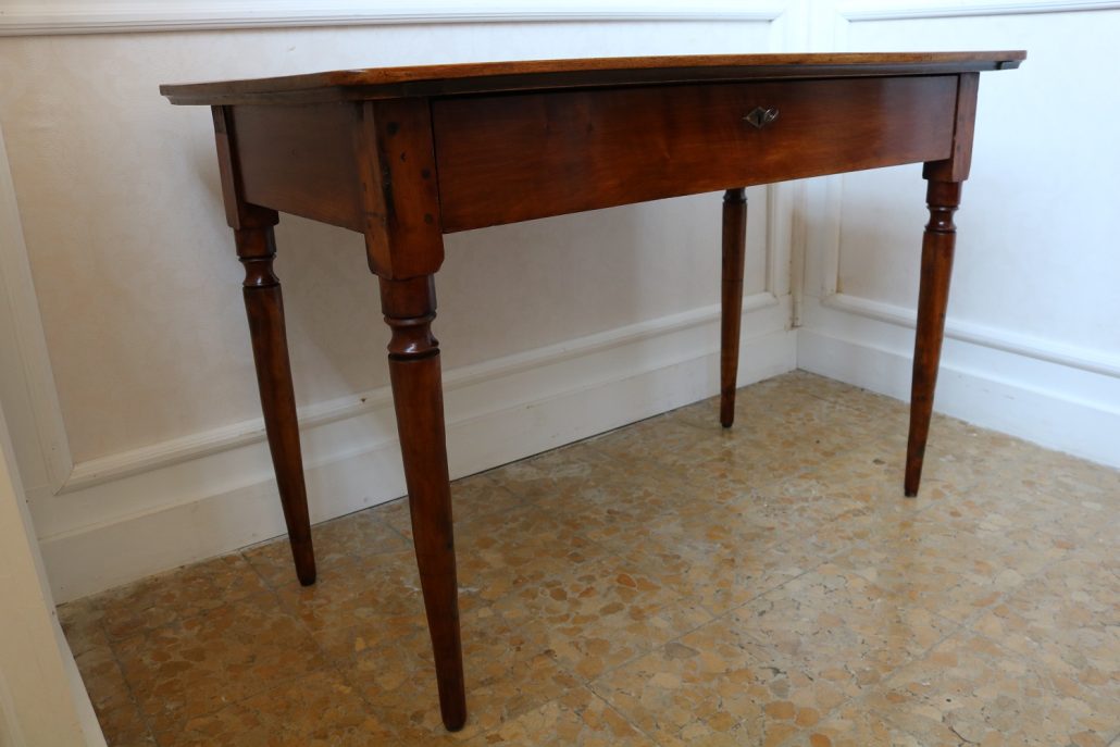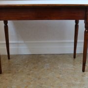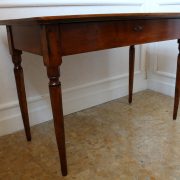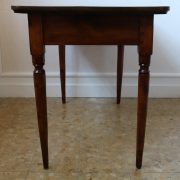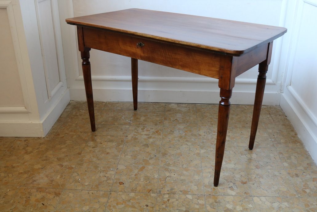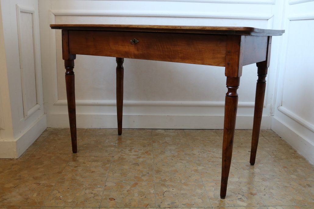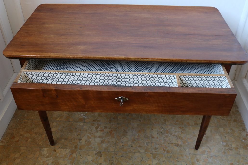 Scrittoio direttorio in noce. Quattro gambe tornite e rastremate, presentano un collarino nei pressi dell’innesto alla fascia sottopiano, dove, frontalmente, è presente un ampio cassetto munito di serratura e suddiviso in comparti al suo interno. Il piano, realizzato in un unico pezzo, presenta un’accentuata sporgenza dalla struttura e si caratterizza per gli angoli stondati, unica decorazione una discreta modanatura nella parte inferiore per alleggerire il notevole spessore. Il mobile di semplicissimo disegno, rivela una particolare ricercatezza nell’unione tra spessori notevoli e leggerezza della composizione. Le superfici, totalmente lisce, enfatizzano la bellezza della nobile essenza di noce. Questo arredo risulta quindi molto leggero e raffinato ma al contempo solido e semplice, tipiche caratteristiche dello stile direttorio sul finire del XVIII Secolo.