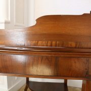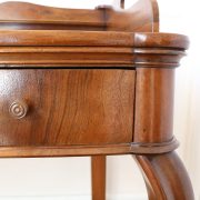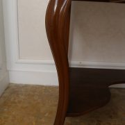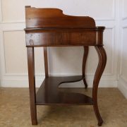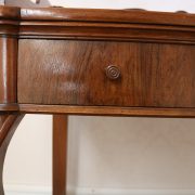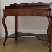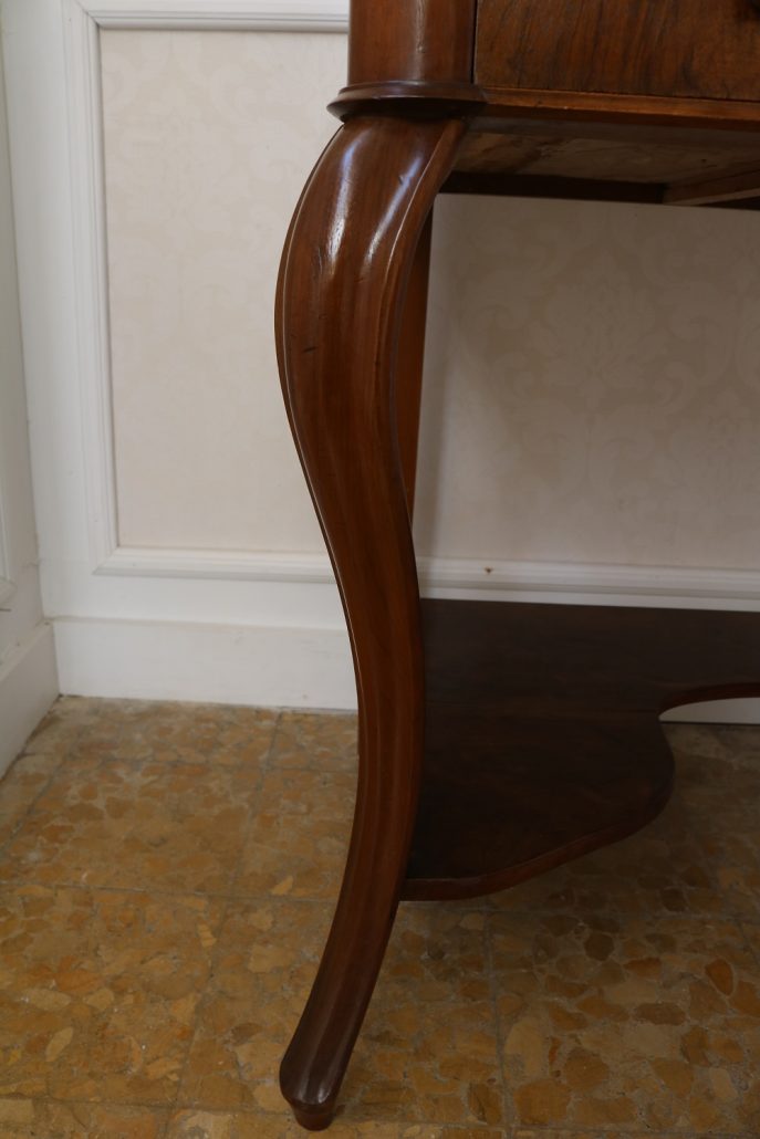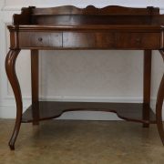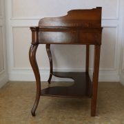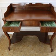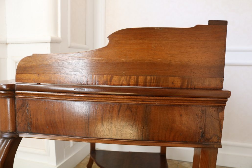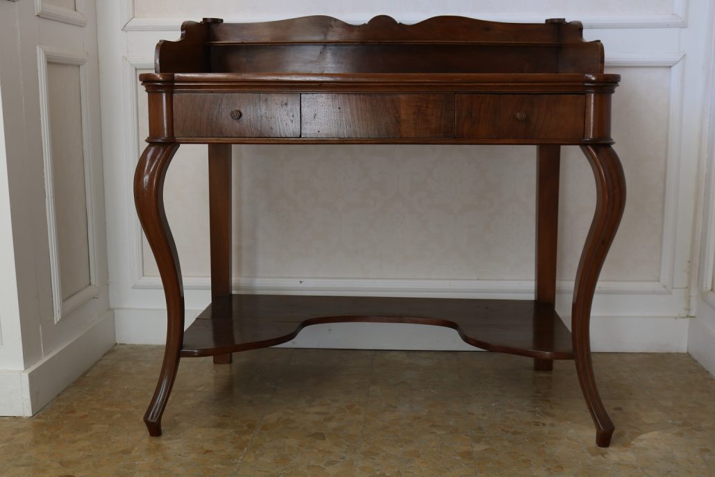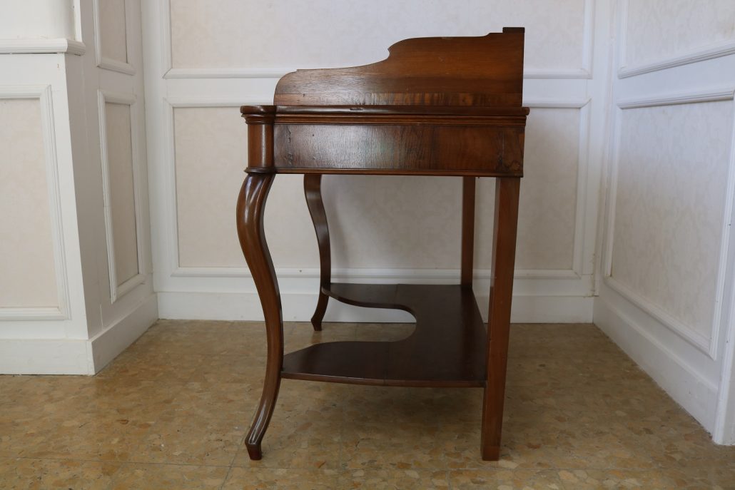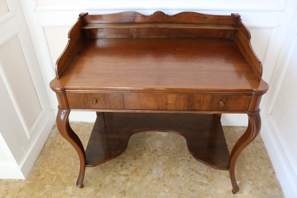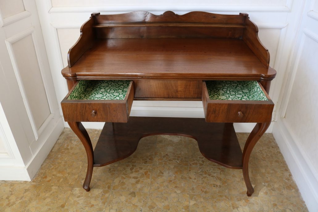 Scrittoio Luigi Filippo in noce. Sostenuto da due gambe elegantemente mosse anteriormente e rette, terminanti a plinto, posteriormente, si sviluppa un ampio piano scrittoio, dagli angoli stondati, munito di una sorta di ringhiera, sagomata e arricchita da una mensolina postere. La fascia a sostegno del piano, con una decorazione ottenuta mediante la venatura verticale, presenta due cassettini posti ai lati, muniti di pomoli, mentre un piano, unisce nella parte inferiore la gambe del mobile, lasciando libero lo spazio di manovra per chi vi è seduto. Questo arredo, di grande eleganza, accentuata dalla sinuosità delle gambe, e dalla cura dei dettagli, rivela in realtà un probabile altro utilizzo in passato, poiché la mancanza di un ulteriore cassetto nella parte centrale risulta inspiegabile se non con la supposizione della sostituzione del piano stesso, in un antico restauro, dove poteva in realtà essere presente il classico foro di collocazione della bacinella per le abluzioni giornaliere. Probabilmente, quindi, l’attuale scrittoio era in epoca passata una toilette. Il piano è comunque coevo all’arredo ed è stato eseguito con grande maestria.