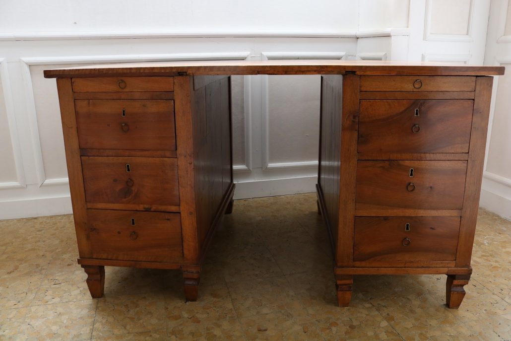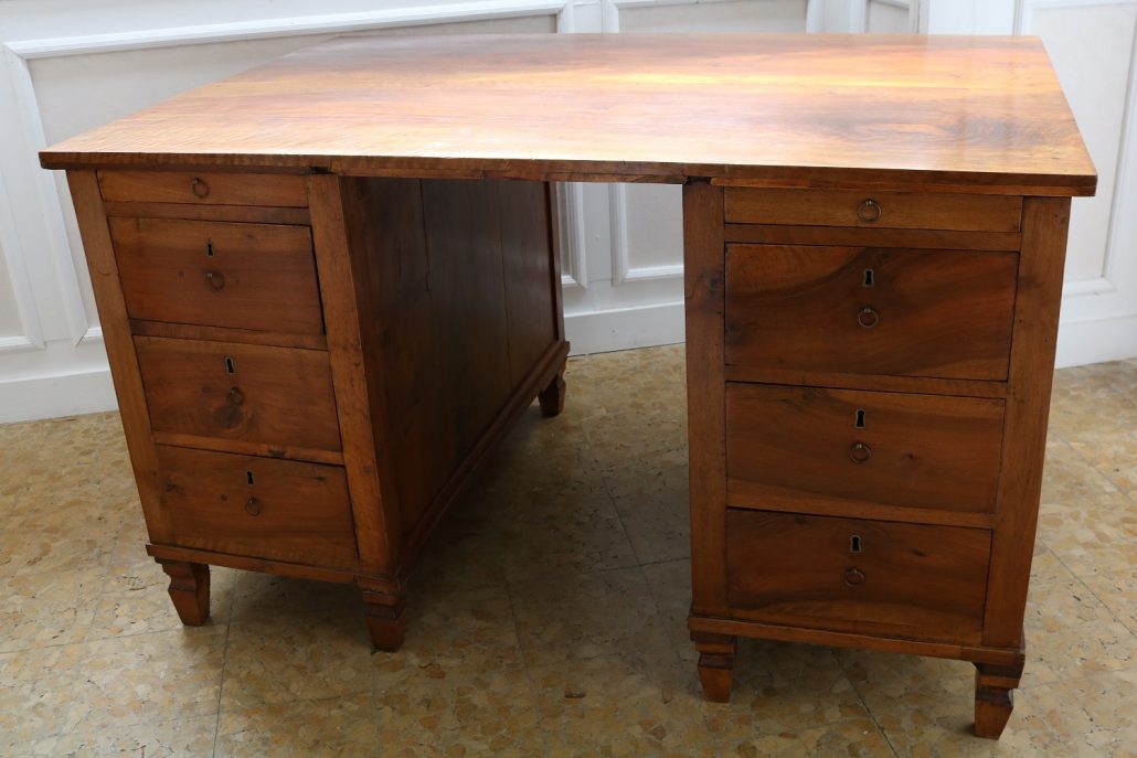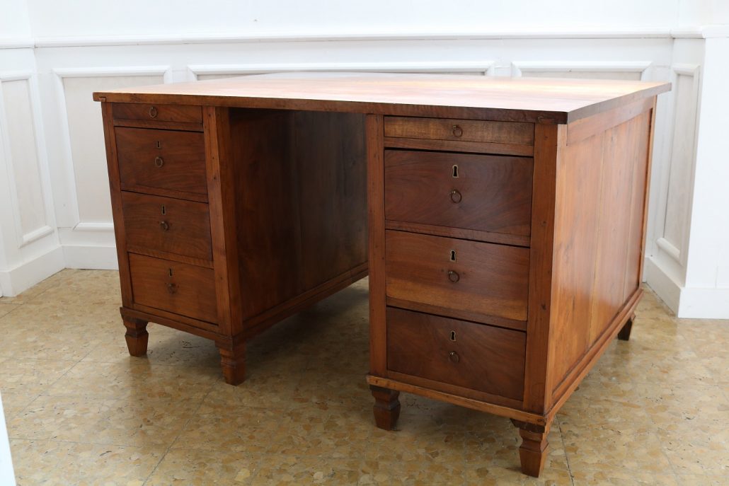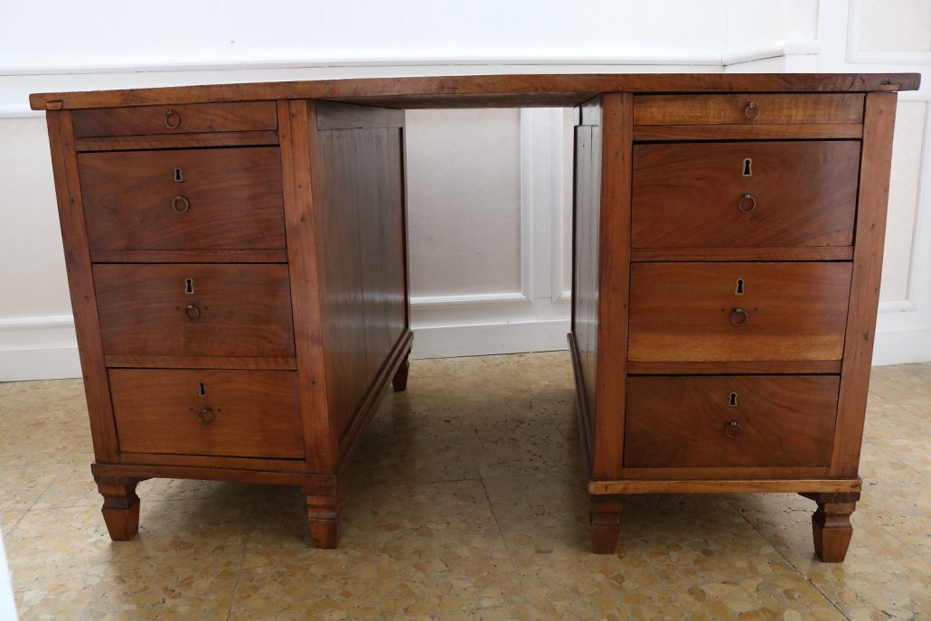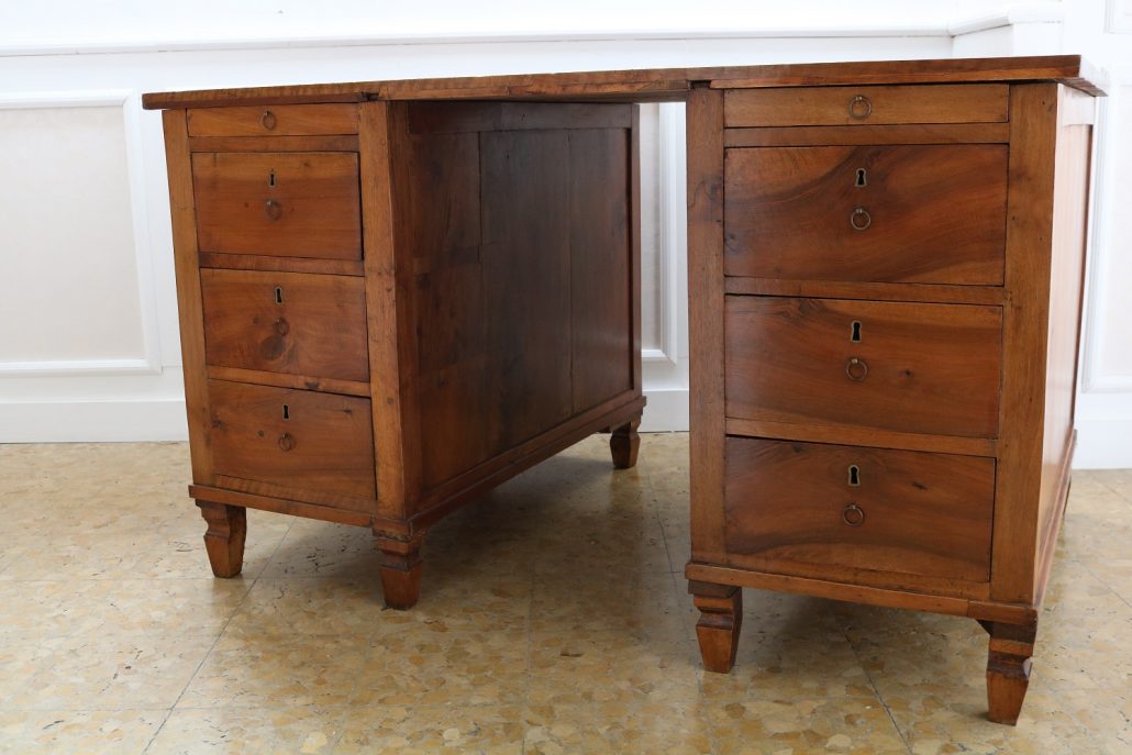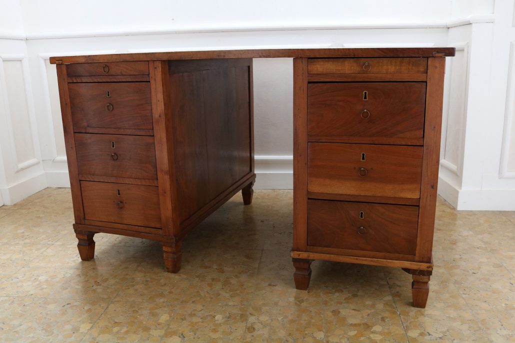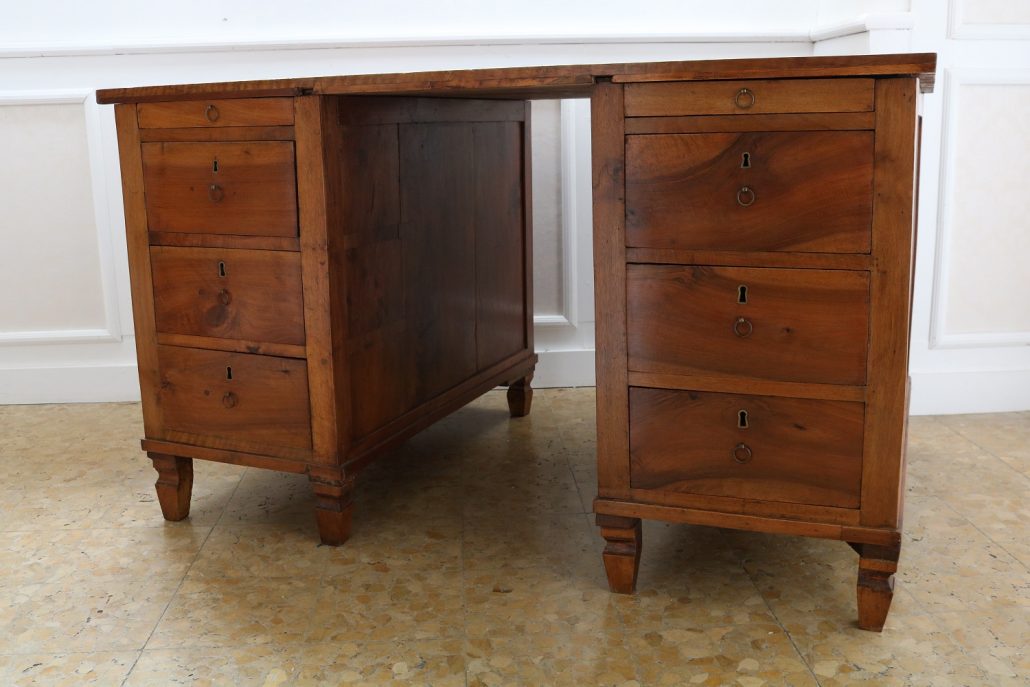 Scrivania Luigi XVI in noce. Due moduli affrontati, sorretti ogni’uno da quattro piedi a obelisco rovesciato con strozzatura, sostengono, mediante un incastro a coda di rondine, l’ampia piana costituita da due larghe plance di notevole spessore. I moduli, sono suddivisi in quattro cassetti, muniti di serratura e pendente ad anello, dei quali il primo sottopiano più piccolo. I cassetti sono presenti su ambo i lati della scrivania, avanti e dietro in modo da consentirne un uso doppio, o comunque costituire un decoro estetico, ed una maggiore praticità in confronto ad avere cassetti solo su di un lato. I fianchi di notevole spessore,presentano una larga cornice di di sezione molto semplice, che ne segue il profilo. Il noce utilizzato, di notevole sezione viene messo in risalto dalle grandi superfici, quasi prive di decorazione, in modo che la bella venatura, esalti l’assetto architettonico delle forme. Anche la scelta della bocchette, in ottone incassate, semplicissime nella loro forma, seguono la volontà di semplicità ed eleganza.