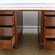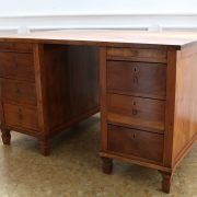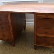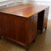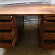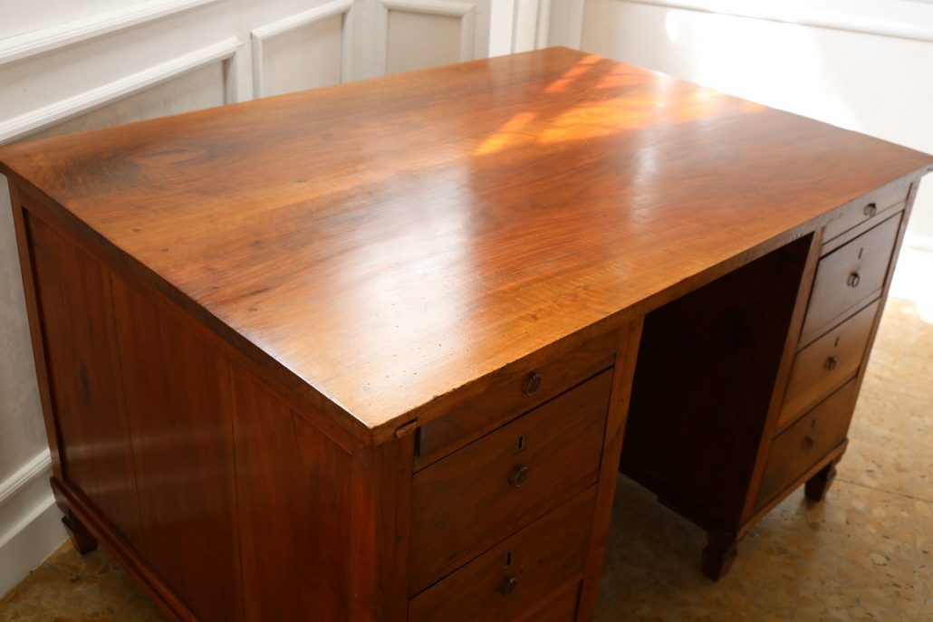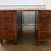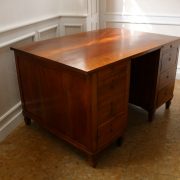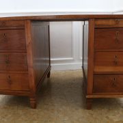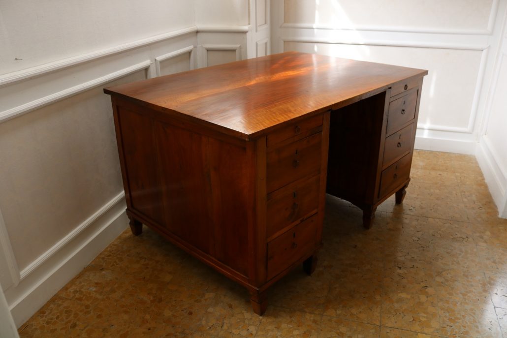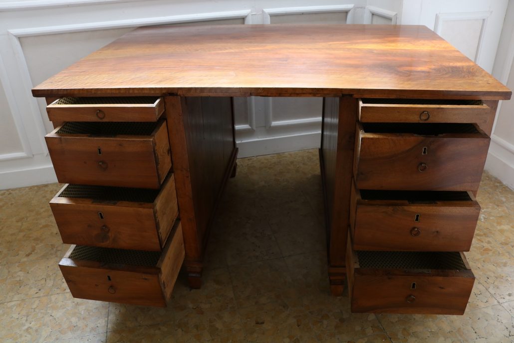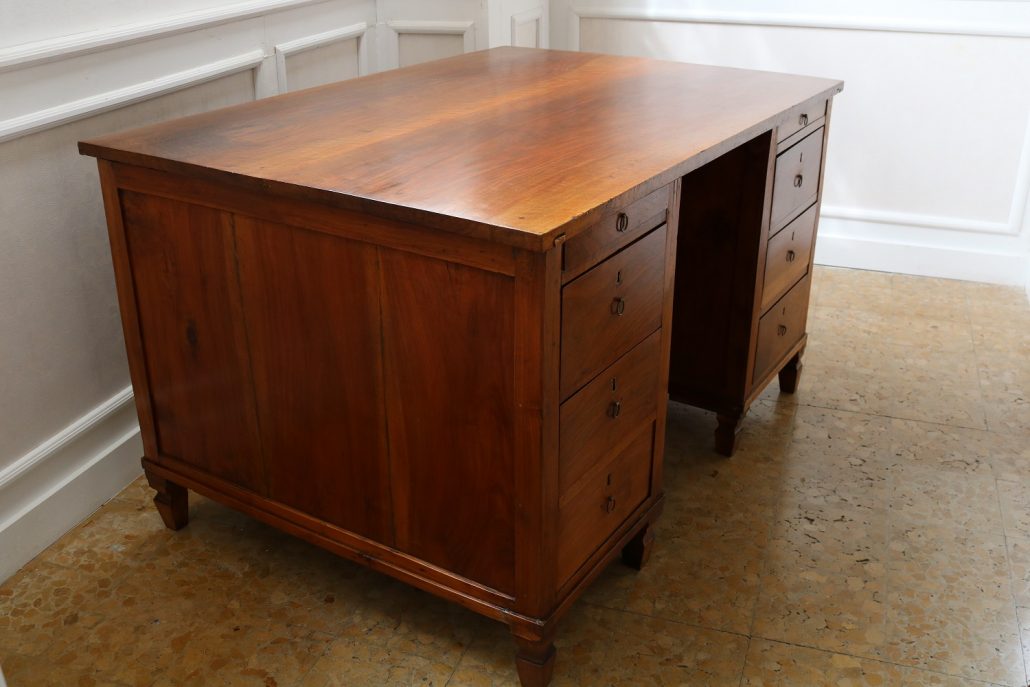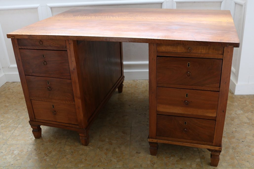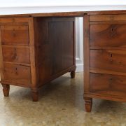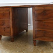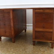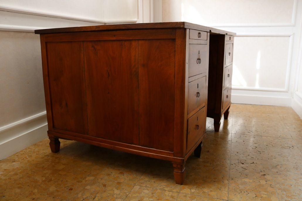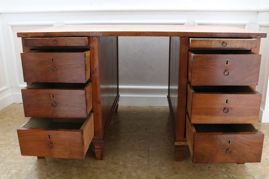 Scrivania Luigi XVI in noce. Due moduli affrontati, sorretti ogni’uno da quattro piedi a obelisco rovesciato con strozzatura, sostengono, mediante un incastro a coda di rondine, l’ampia piana costituita da due larghe plance di notevole spessore. I moduli, sono suddivisi in quattro cassetti, muniti di serratura e pendente ad anello, dei quali il primo sottopiano più piccolo. I cassetti sono presenti su ambo i lati della scrivania, avanti e dietro in modo da consentirne un uso doppio, o comunque costituire un decoro estetico, ed una maggiore praticità in confronto ad avere cassetti solo su di un lato. I fianchi di notevole spessore,presentano una larga cornice di di sezione molto semplice, che ne segue il profilo. Il noce utilizzato, di notevole sezione viene messo in risalto dalle grandi superfici, quasi prive di decorazione, in modo che la bella venatura, esalti l’assetto architettonico delle forme. Anche la scelta della bocchette, in ottone incassate, semplicissime nella loro forma, seguono la volontà di semplicità ed eleganza.
