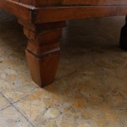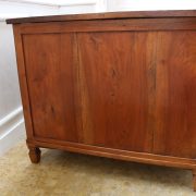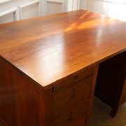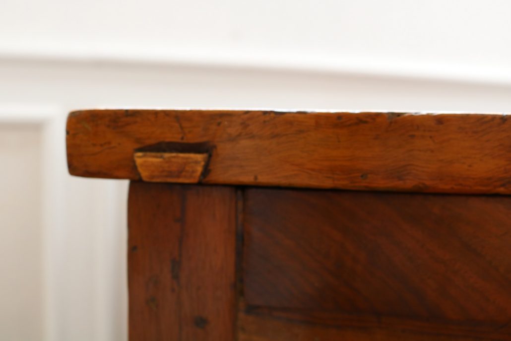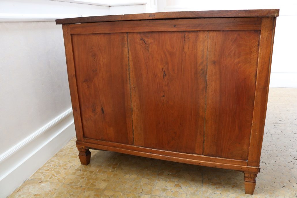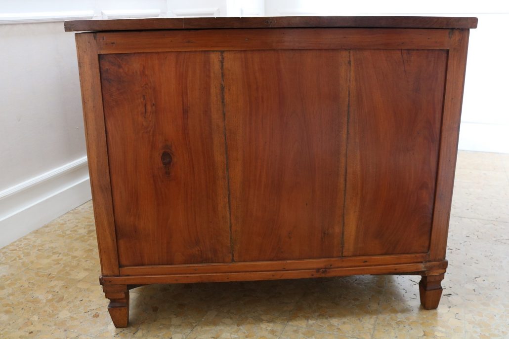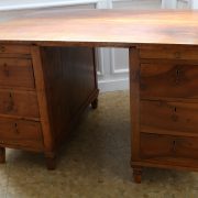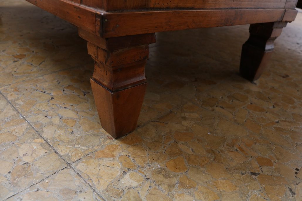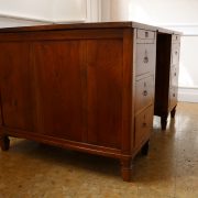 L’arredo, si presenta quindi sobrio ed elegante, la struttura di notevoli dimensioni, viene alleggerita mediante un sapiente uso delle proporzioni. Le generose misure, consentono un utilizzo doppio comodo e pratico e come citato sopra, la presenza dei cassetti sui due lati rende gradevole l’impatto visivo anche utilizzandola come grande scrivania da centro. Lo stile Luigi XVI, evidente nella decorazione dei piedi, nelle belle proporzioni, nella ricerca della massima comodità, daterebbe il mobile alla seconda metà del XVIII Secolo, ma il sistema costruttivo ne sposta la datazione ai primissimi anni del XIX Secolo.