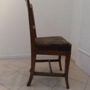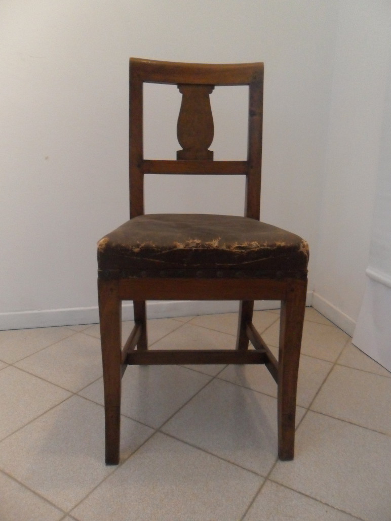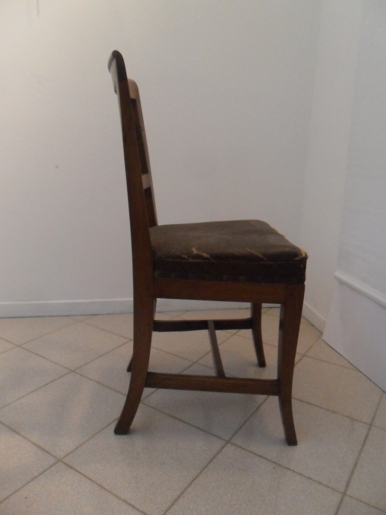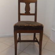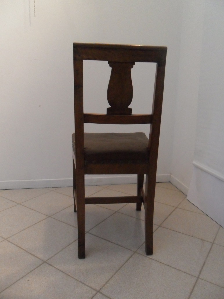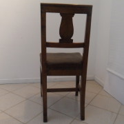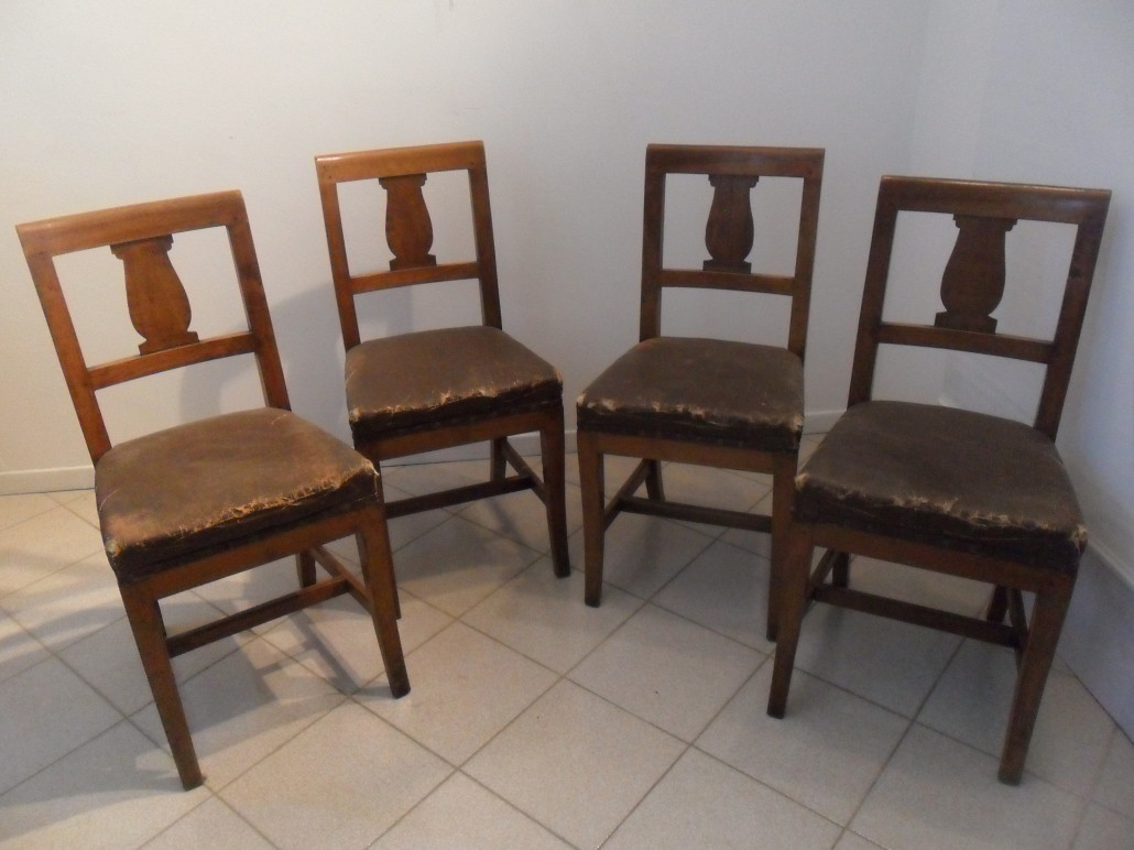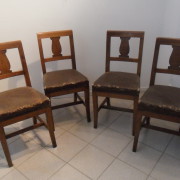 Gruppo di 4 sedie in noce massello impero, schienale a giorno con cartella semplice, sedile imbottito, gambe leggermente mosse.