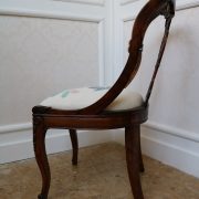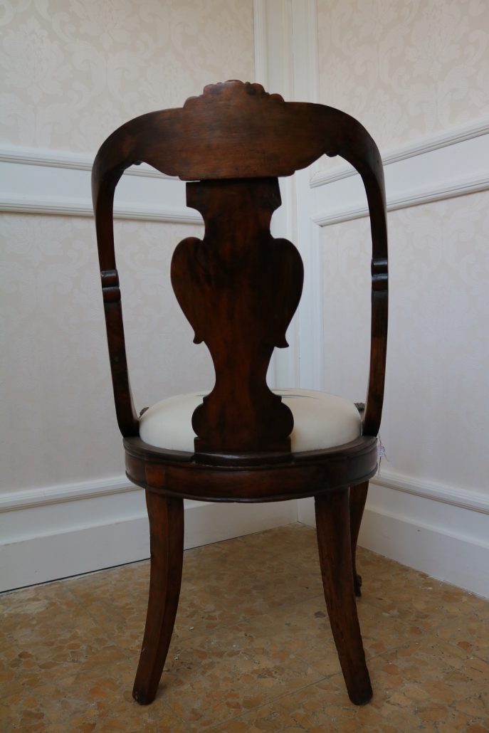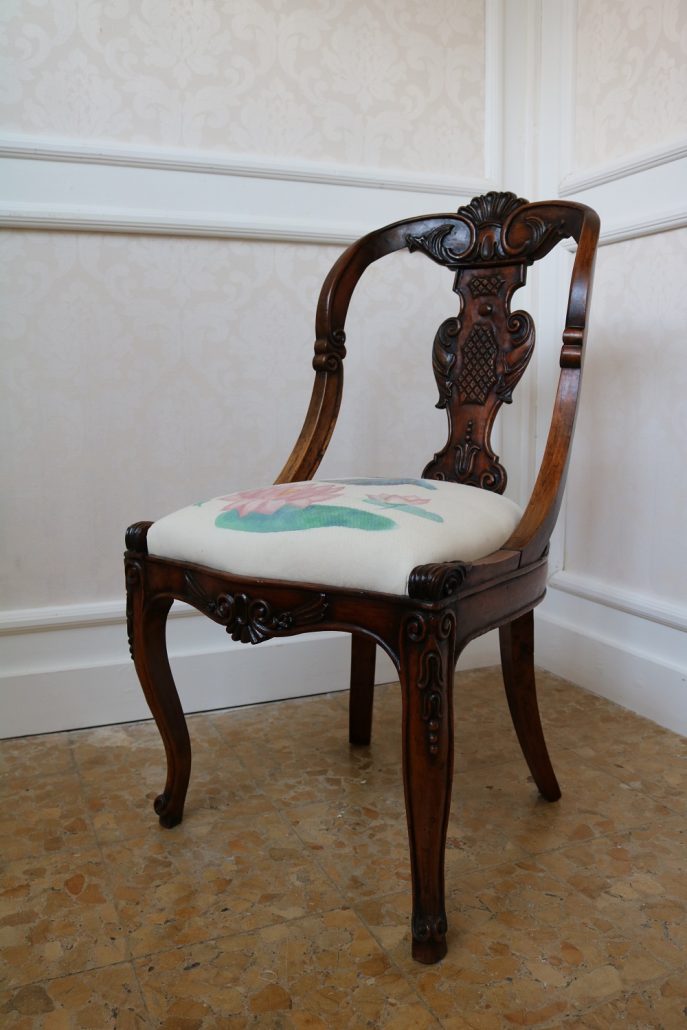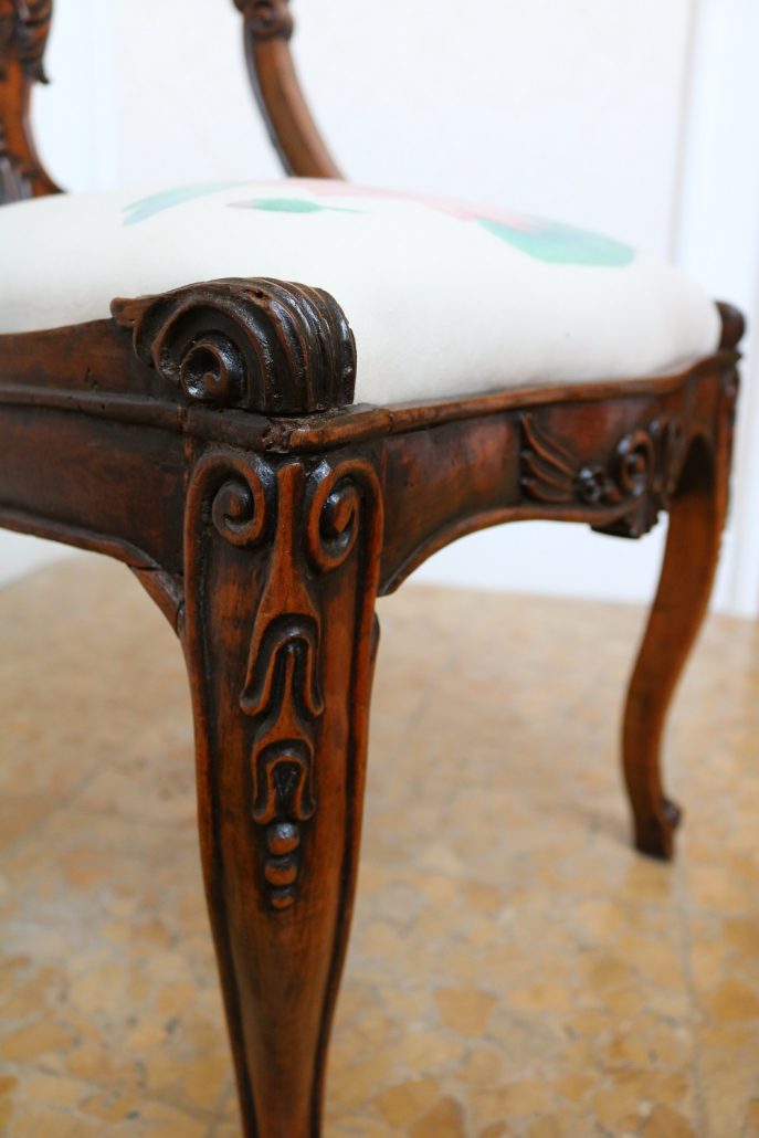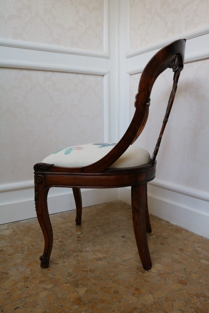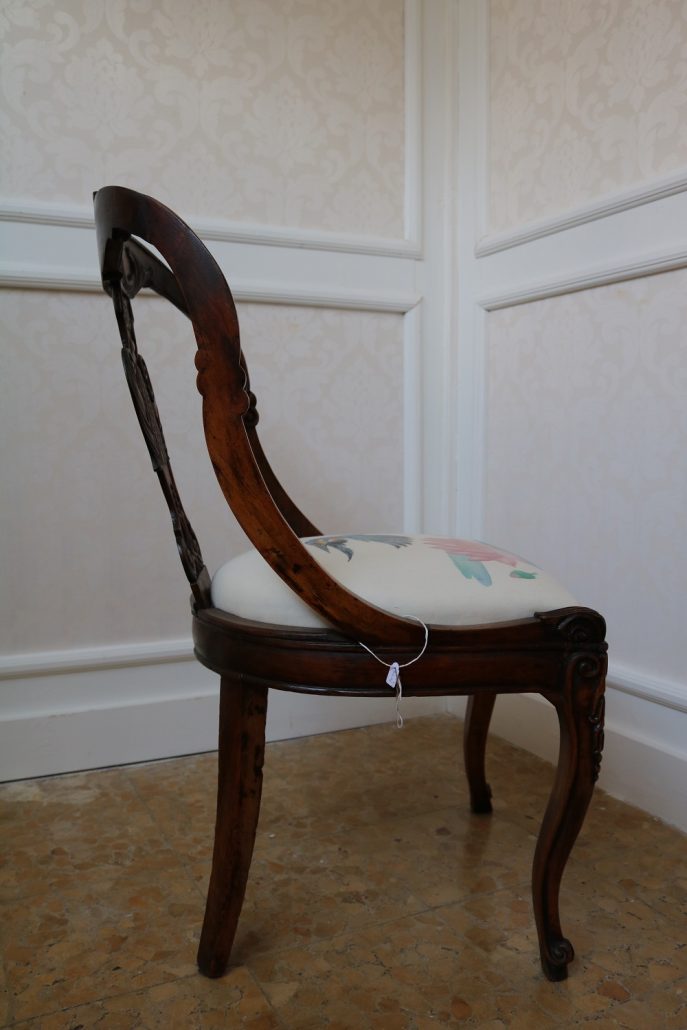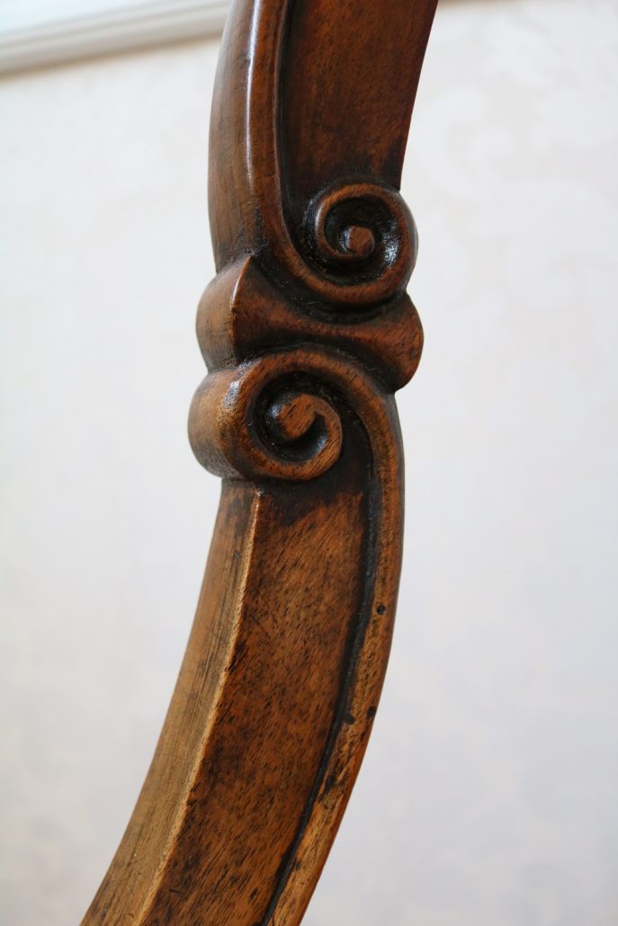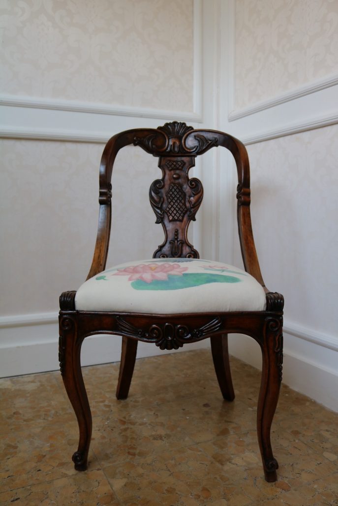 Sedia “a gondola” in noce. Seduta di raffinatissima eleganza. Due gambe anteriori mosse, poggianti su zoccolo, si innestano alla cintura del sedile, mosso anche esso, e riccamente intagliata con volute , foglie, riserve. Gambe posteriori a sciabola. Dal sedile, imbottito e rivestito con un tessuto dipinto a mano raffigurante un colibri con ninfea, si sviluppa lo schienale, a giorno, composto da due esili volute, arricchito da una cartella centrale finemente intagliata a motivi fogliacei e geometrici. La sedia, di squisito gusto alquanto ricercato e raffinato, sembra ancora appartenere, nell’apparato decorativo, all’ornato settecentesco, dove l’eleganza era data dalla ricercatezza, dalla raffinatezza delle minute decorazioni, dalla leggiadria delle linee esili, mosse e sempre in perfette proporzioni. Il modello, invece, “a gondola”, rientra nel più classico periodo dell’impero. Modello di grandissimo successo e proposto in svariati disegni e fatture. Questa sedia di grande comodità e di innovativa forma, venne proposta anche dopo il declino dell’Impero, nella Restaurazione per scomparire brevemente sotto il Luigi Filippo e ricomparire poi nel Secondo Impero.