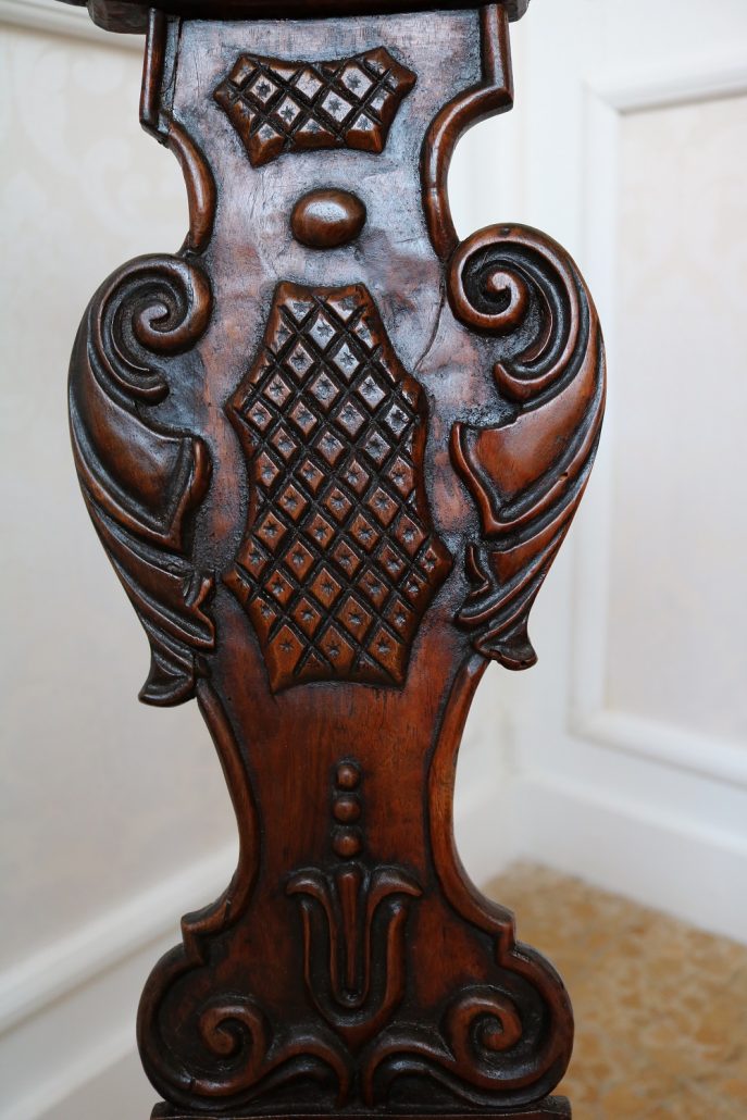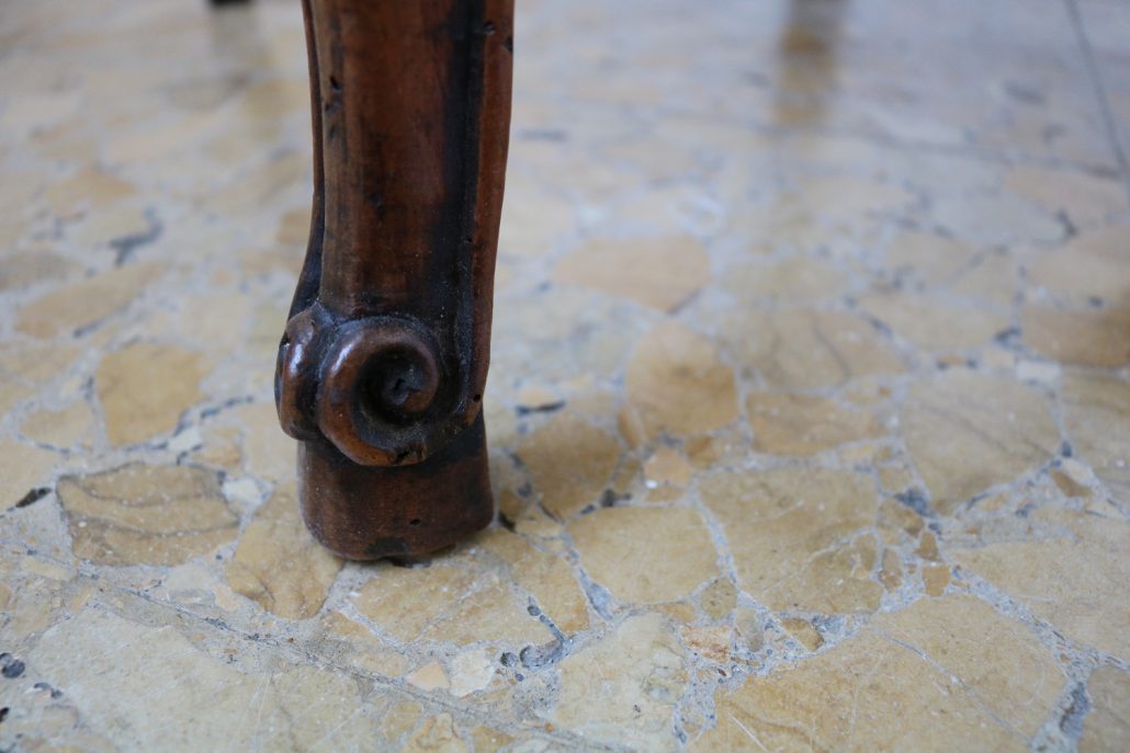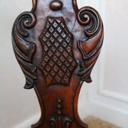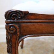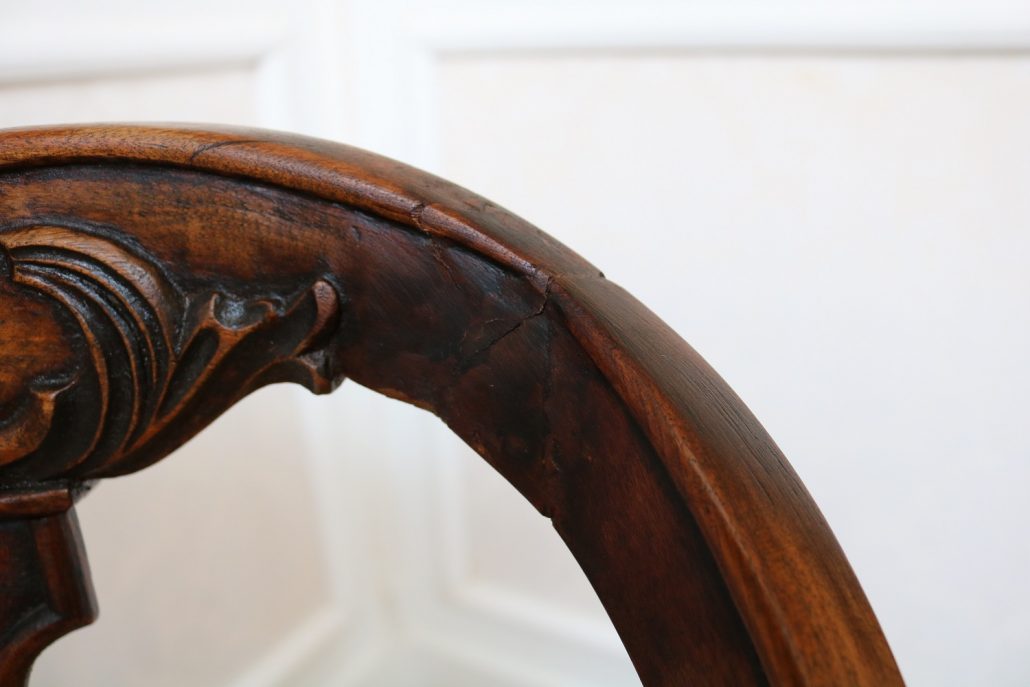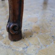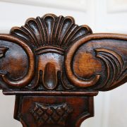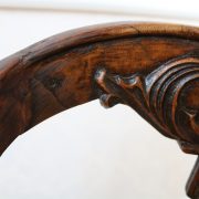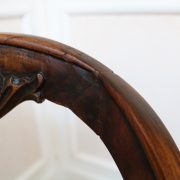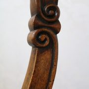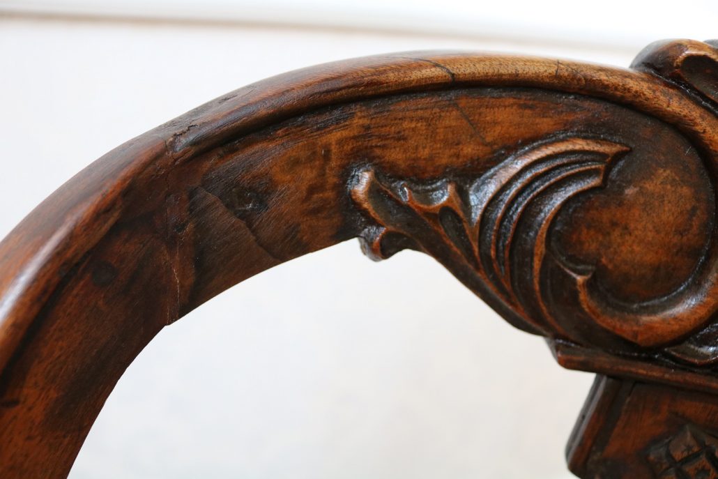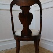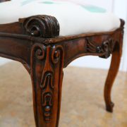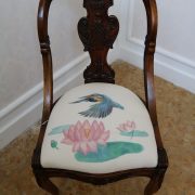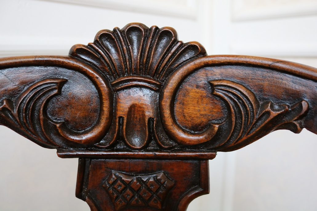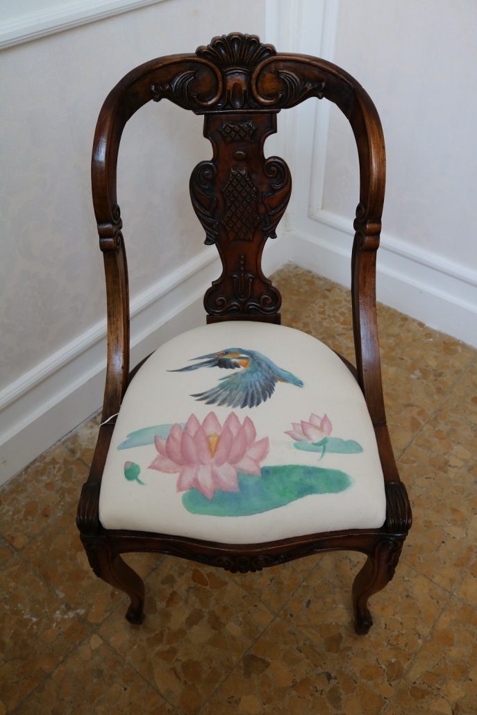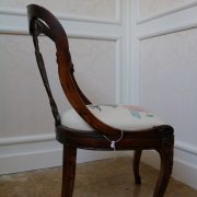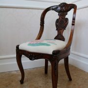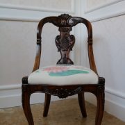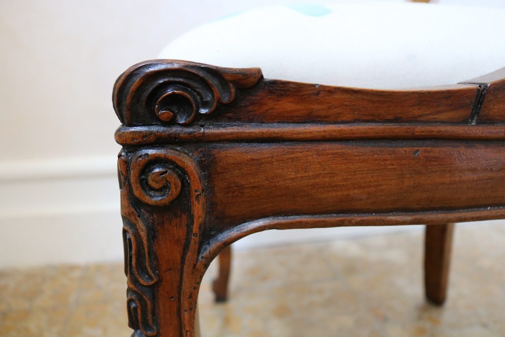 Sedia “a gondola” in noce. Seduta di raffinatissima eleganza. Due gambe anteriori mosse, poggianti su zoccolo, si innestano alla cintura del sedile, mosso anche esso, e riccamente intagliata con volute , foglie, riserve. Gambe posteriori a sciabola. Dal sedile, imbottito e rivestito con un tessuto dipinto a mano raffigurante un colibri con ninfea, si sviluppa lo schienale, a giorno, composto da due esili volute, arricchito da una cartella centrale finemente intagliata a motivi fogliacei e geometrici. La sedia, di squisito gusto alquanto ricercato e raffinato, sembra ancora appartenere, nell’apparato decorativo, all’ornato settecentesco, dove l’eleganza era data dalla ricercatezza, dalla raffinatezza delle minute decorazioni, dalla leggiadria delle linee esili, mosse e sempre in perfette proporzioni. Il modello, invece, “a gondola”, rientra nel più classico periodo dell’impero. Modello di grandissimo successo e proposto in svariati disegni e fatture. Questa sedia di grande comodità e di innovativa forma, venne proposta anche dopo il declino dell’Impero, nella Restaurazione per scomparire brevemente sotto il Luigi Filippo e ricomparire poi nel Secondo Impero.