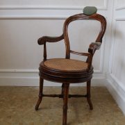 Sedia girevole in legno di faggio. Rara seduta dalle linee mosse composta da quattro gambe rastremate unite da traverse, sedile girevole dalla forma circolare in paglia di Vienna, schienale a giorno con un elegante movimento terminante con piccolo poggiatesta. Due braccioli con parte imbottita terminano a ricciolo e si innestano al sedile tramite due elementi che riprendono la decorazione delle gambe. La sedia, di grande comodità riprende stilemi costruttivi dello stile thonet ma in una sorta di ibridazione mantiene linee e decorazioni ancora appartenenti al precedente stile Luigi Filippo.