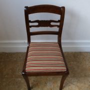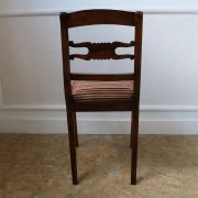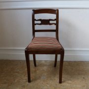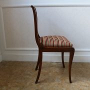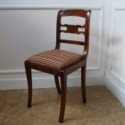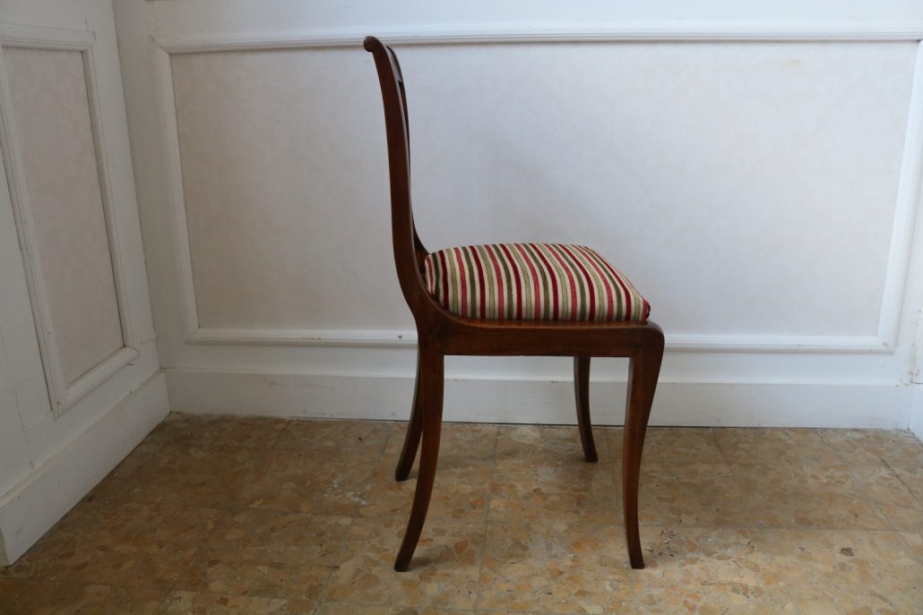 Sedia impero, in noce. Arredo caratterizzato da linee sinuose e superfici lisce. Quattro gambe, “a sciabola”, sostengono un sedile in tessuto. Lo schienale formato da due montanti che si sviluppano in continuità alle gambe posteriori e terminanti a ricciolo sono uniti da una cartella sagomata a motivo geometrico contrapposto e centrato da una sorta di listelli verticali uniti tra loro, ottenuto con la tecnica dell’ intagliato. Nella parte inferiore dello schienale un altro traverso, semplicissimo, rafforza la composizione. L’arredo di estrema eleganza, risulta leggero e raffinato, la superfice liscia esalta la nobile essenza di noce.