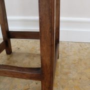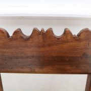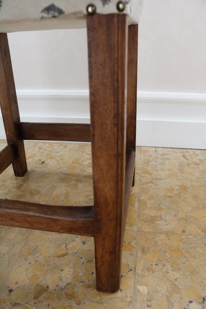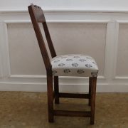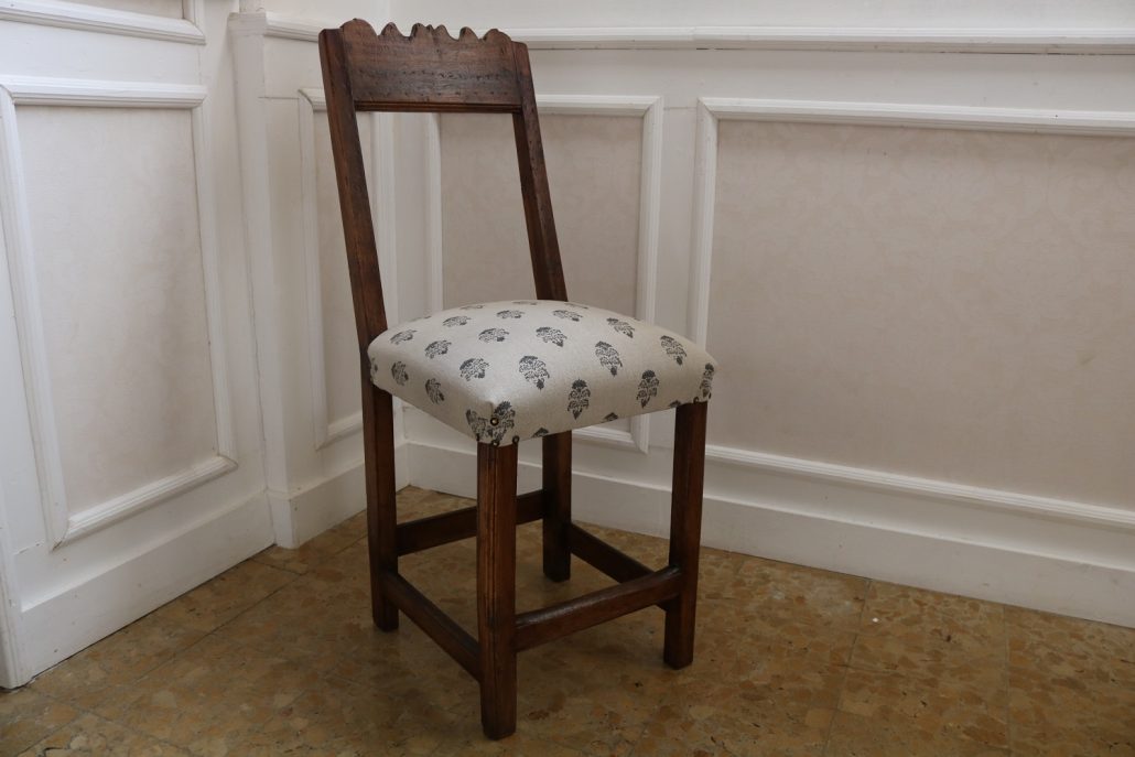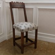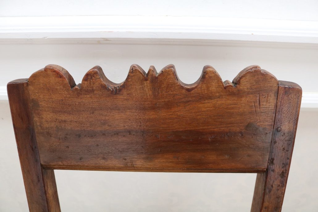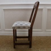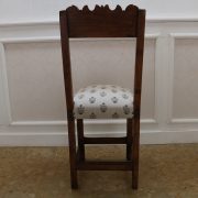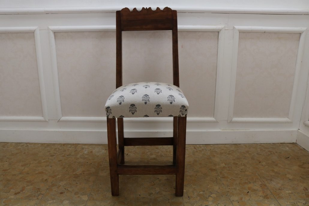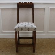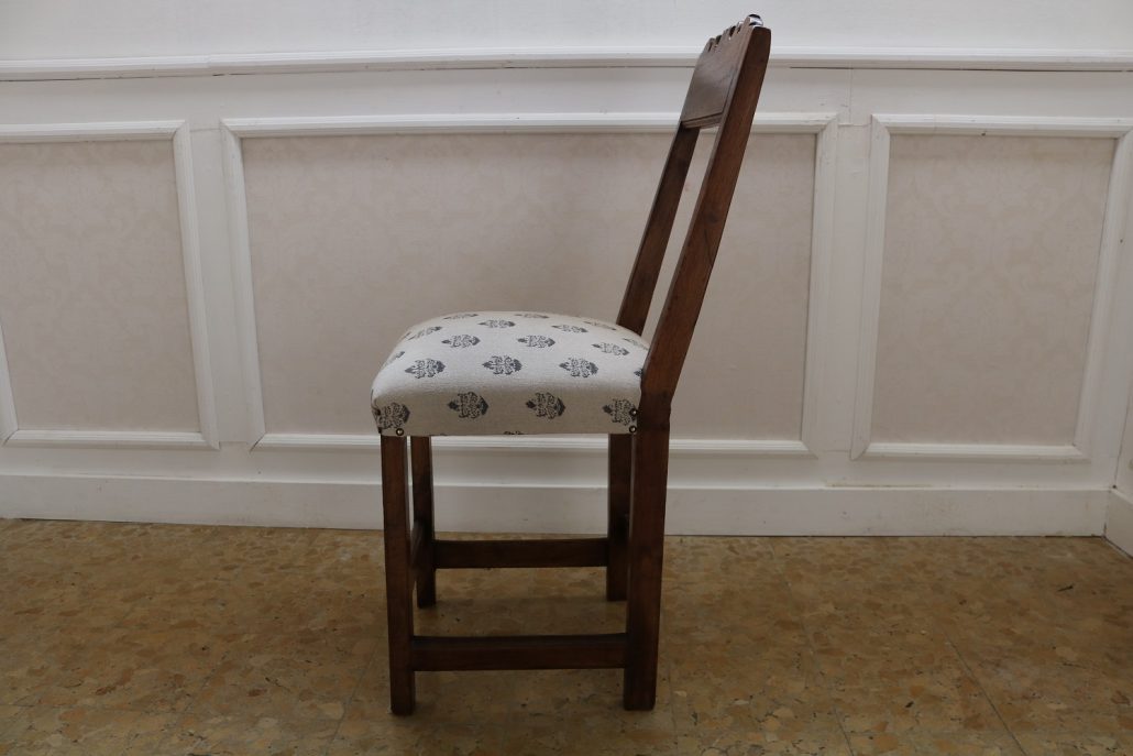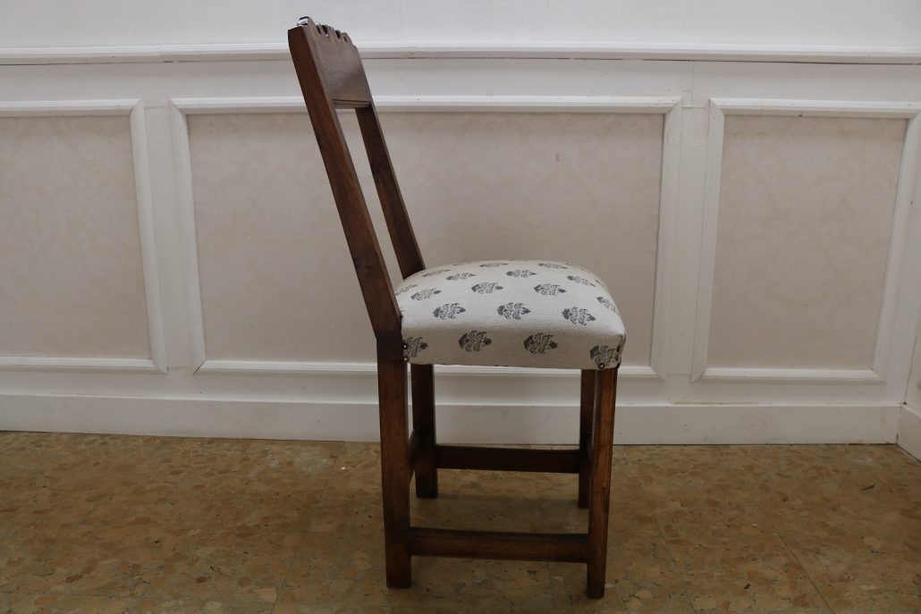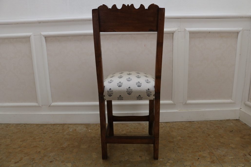 Sedia del primo settecento, in noce. Quattro gambe, unite con traversi, si sviluppano verticalmente sostenendo un ampio sedile imbottito. Lo schienale, a giorno, presenta la continuità delle gambe posteriori unite nella parte superiore da un traverso riccamente decorato da una fratinatura. Unica altra decorazione presente la si trova sulle gambe e lo schienale, dove i profili esterni sono leggermente stondati. La sedia di belle proporzioni presenza un disegno essenziale, sobrio ma alquanto elegante. L’austerità, ancora legata agli stilemi del secolo precedente inizia, in questo modello, a ingentilirsi e alleggerirsi.