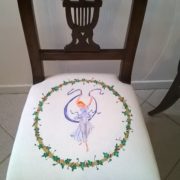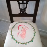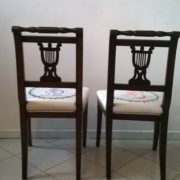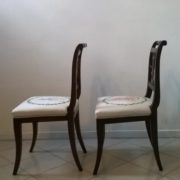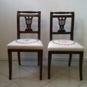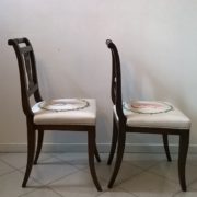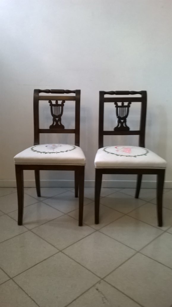 Coppia di sedie neoclassiche in noce massello caratterizzate da una linea sinuosa ed elegante ed impreziosite nella cartella dello schienale da una sagoma di lira traforata. Sedile imbottito e rivestito in cotone bianco dipinto a mano raffiguranti danzatrici ispirate a disegni di Canova.