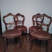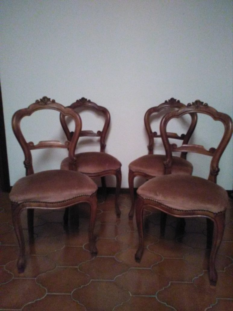 Gruppo di quattro sedie in stile Luigi Filippo in noce massello. Linee mosse, schienale a giorno con decorazioni intagliate rocaille, sedile imbottito e gambe anteriori desinenti a ricciolo.