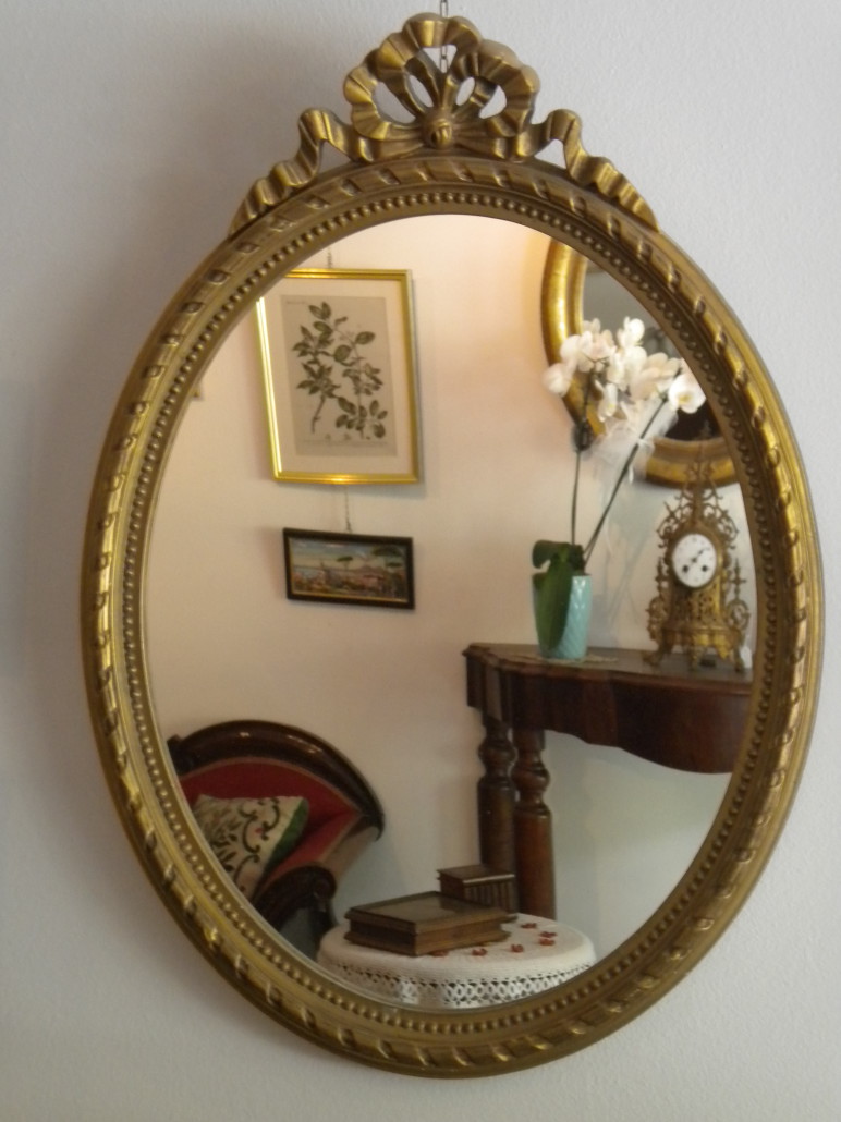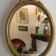 Specchiera dorata di forma ovale Luigi XVI in legno e gesso. Decorazioni a nastro