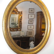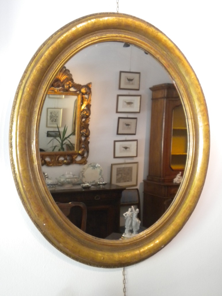 Specchiera tonda in oro zecchino con decorazioni floreali e palmette.