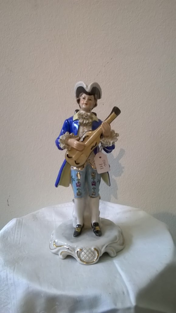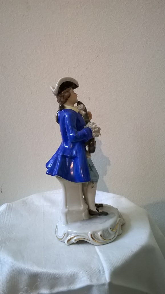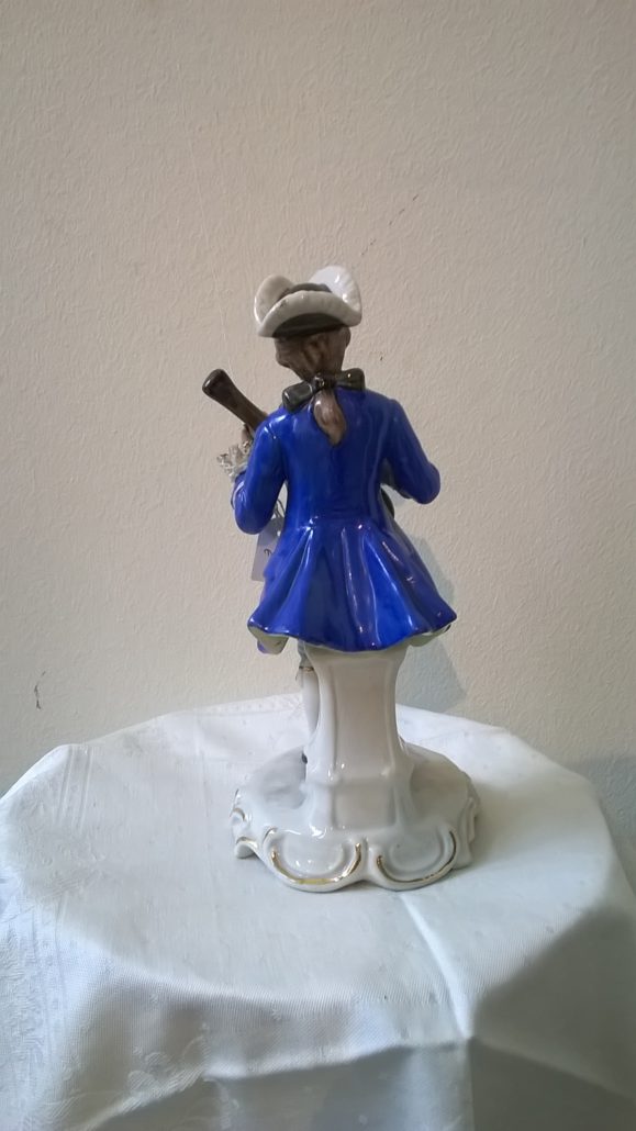 Statuina “musicista” in abiti settecenteschi in ceramica policroma, in perfette condizioni.