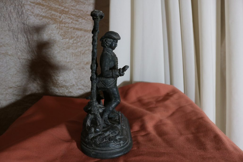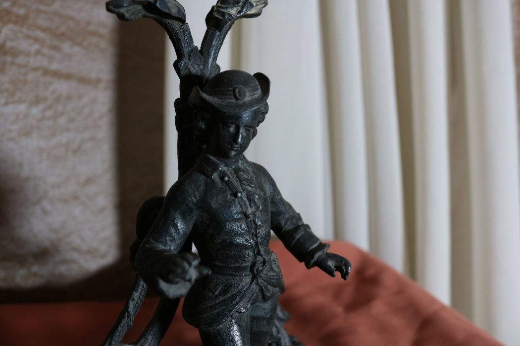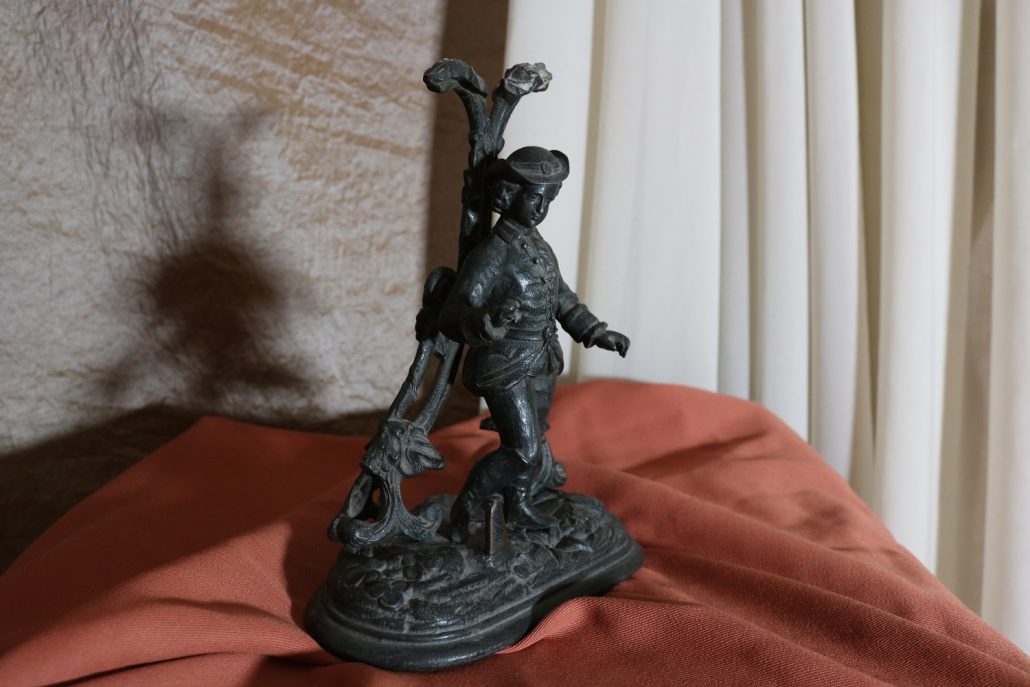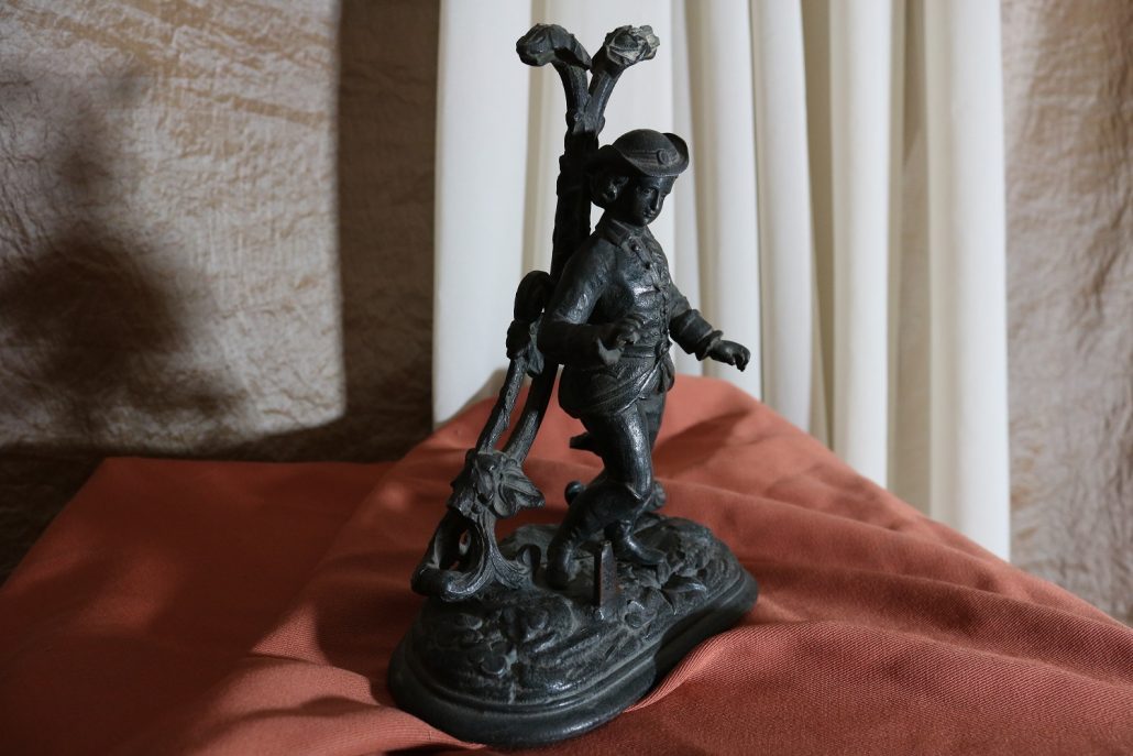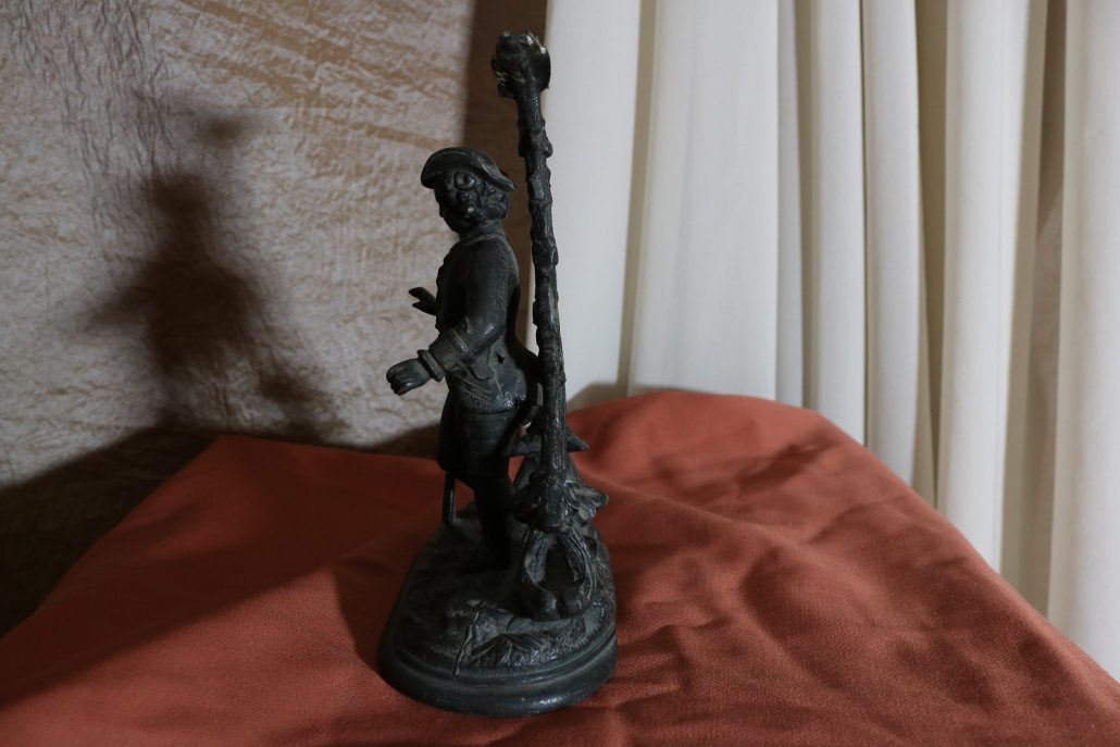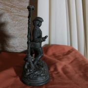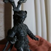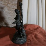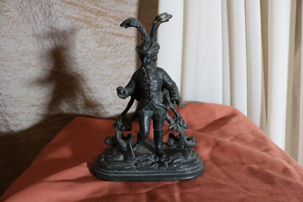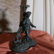 Statuina in metallo raffigurante un soldato in abiti settecenteschi nei pressi di un elemento barocco composto da due racemi incrociati. Il giovane è rappresentato in un momento di riposo, con il calcio del fucile appoggiato a terra su cui sembra appoggiare il proprio peso. Di bella fattura, purtroppo parte del fucile è andata persa .