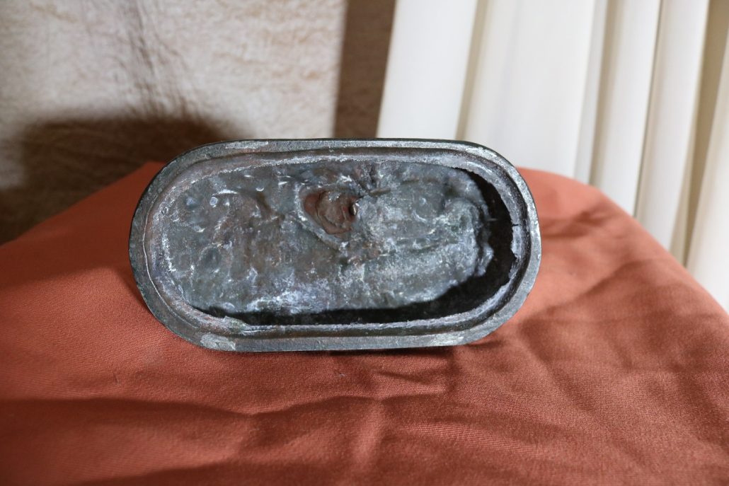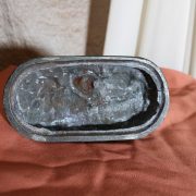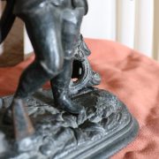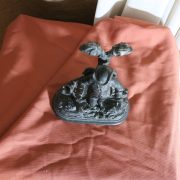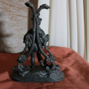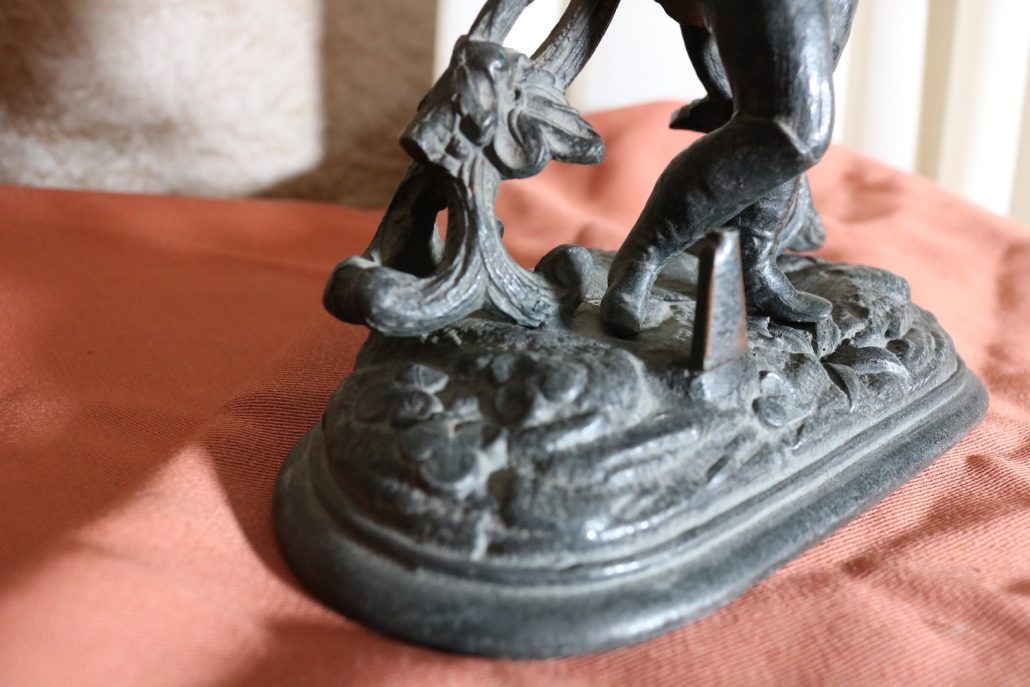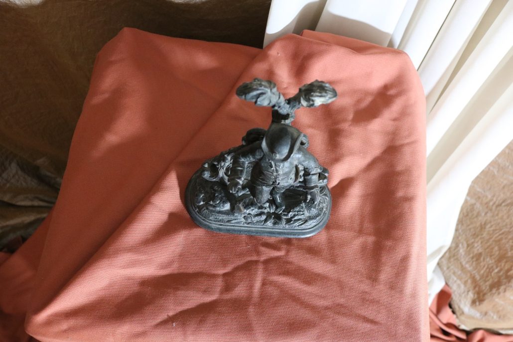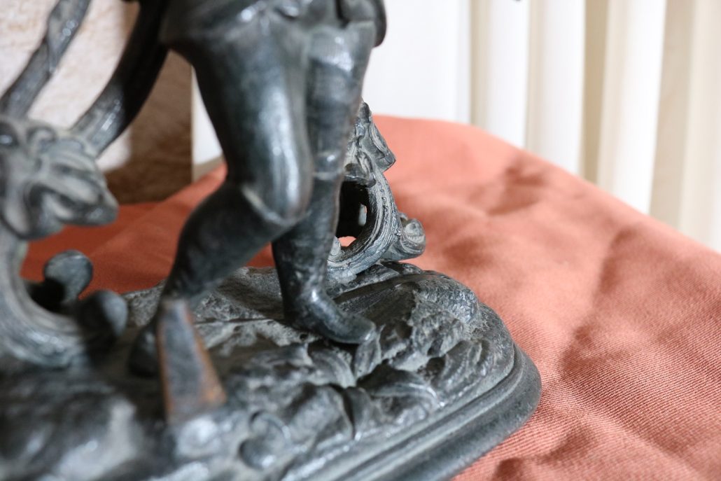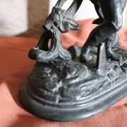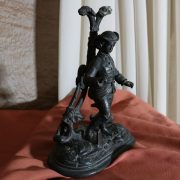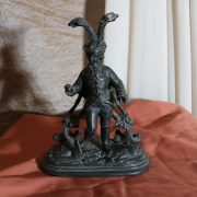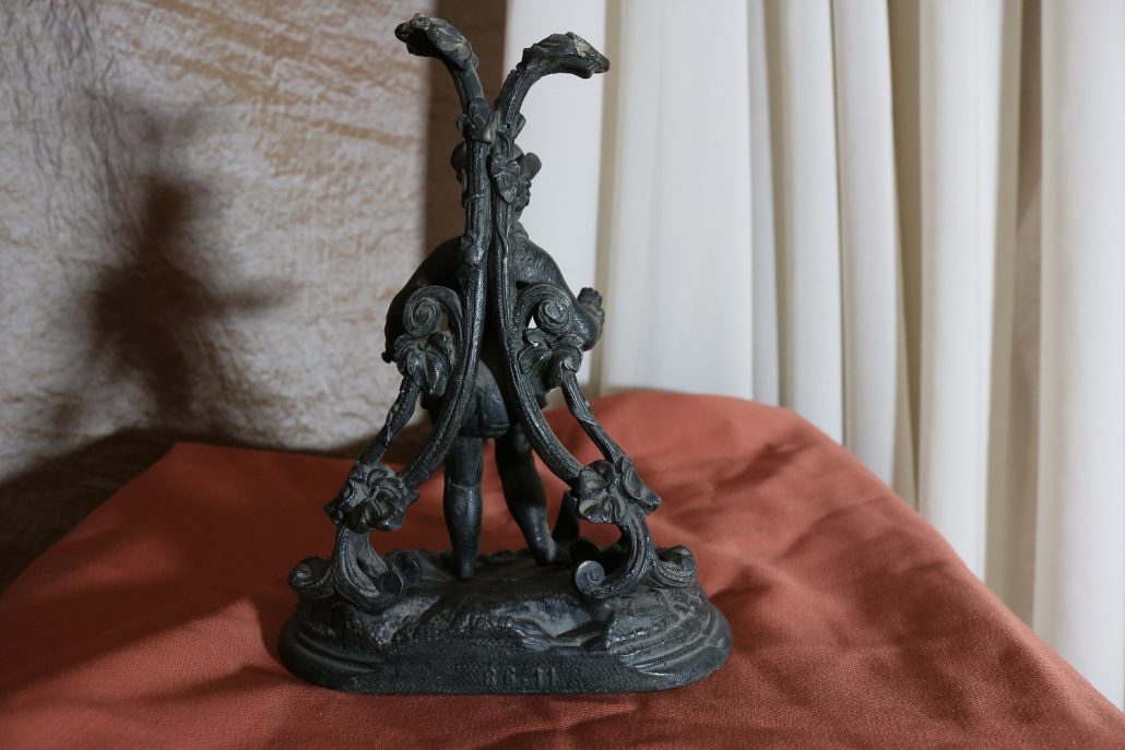 Statuina in metallo raffigurante un soldato in abiti settecenteschi nei pressi di un elemento barocco composto da due racemi incrociati. Il giovane è rappresentato in un momento di riposo, con il calcio del fucile appoggiato a terra su cui sembra appoggiare il proprio peso. Di bella fattura, purtroppo parte del fucile è andata persa .