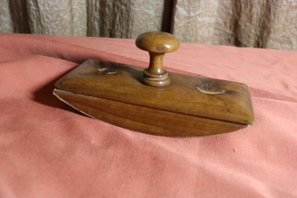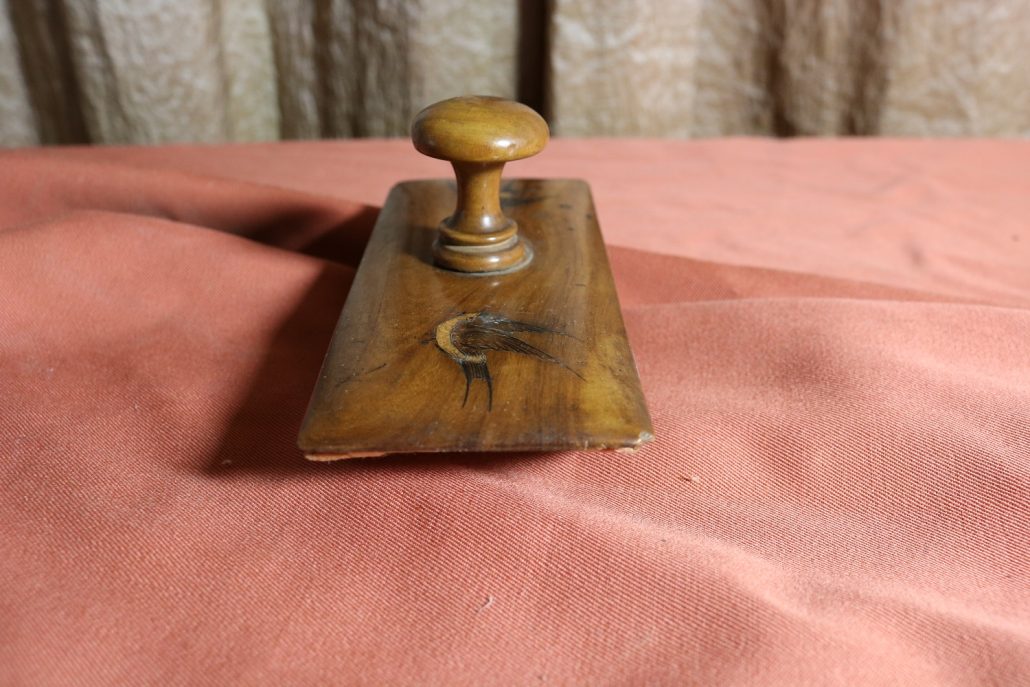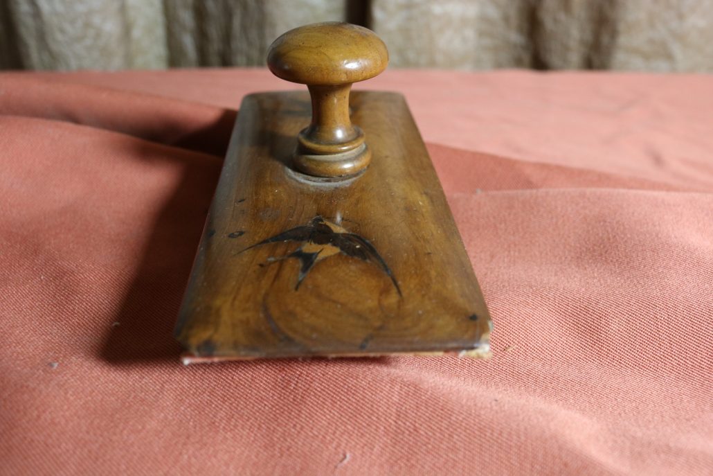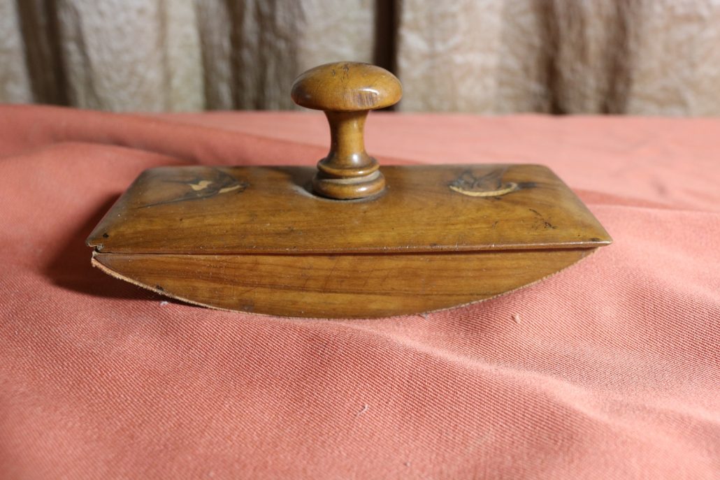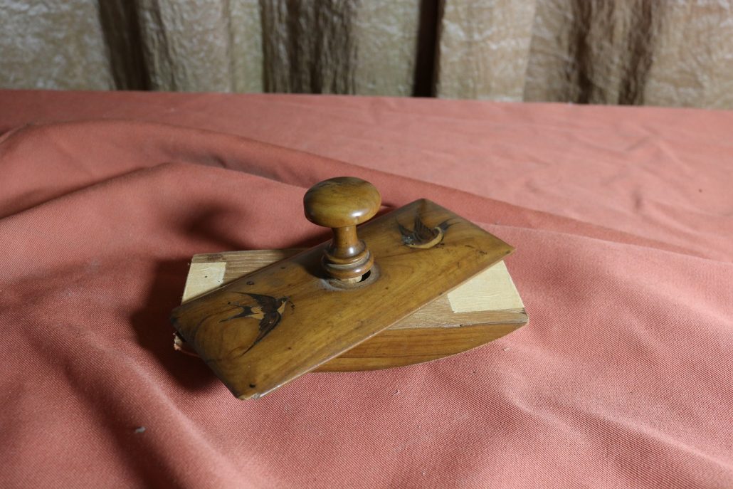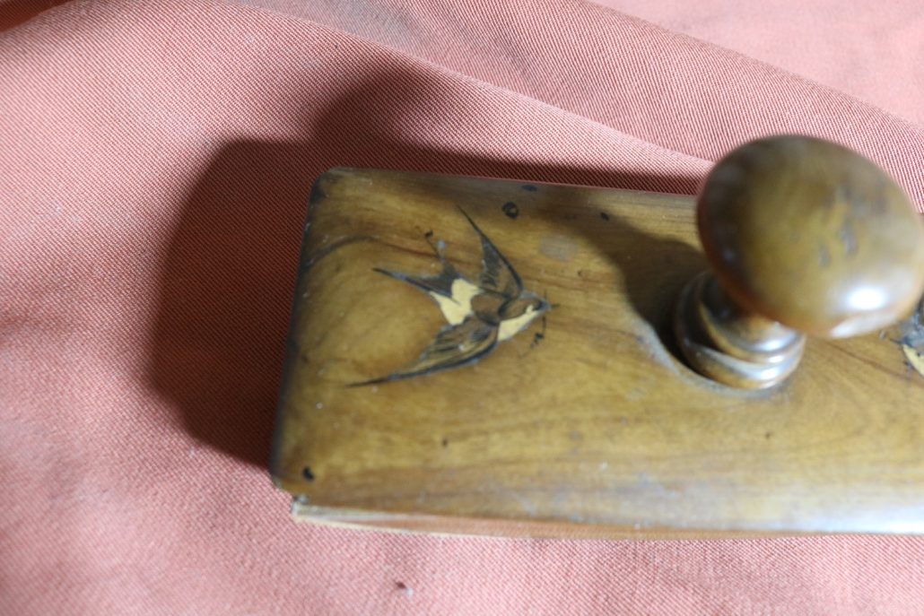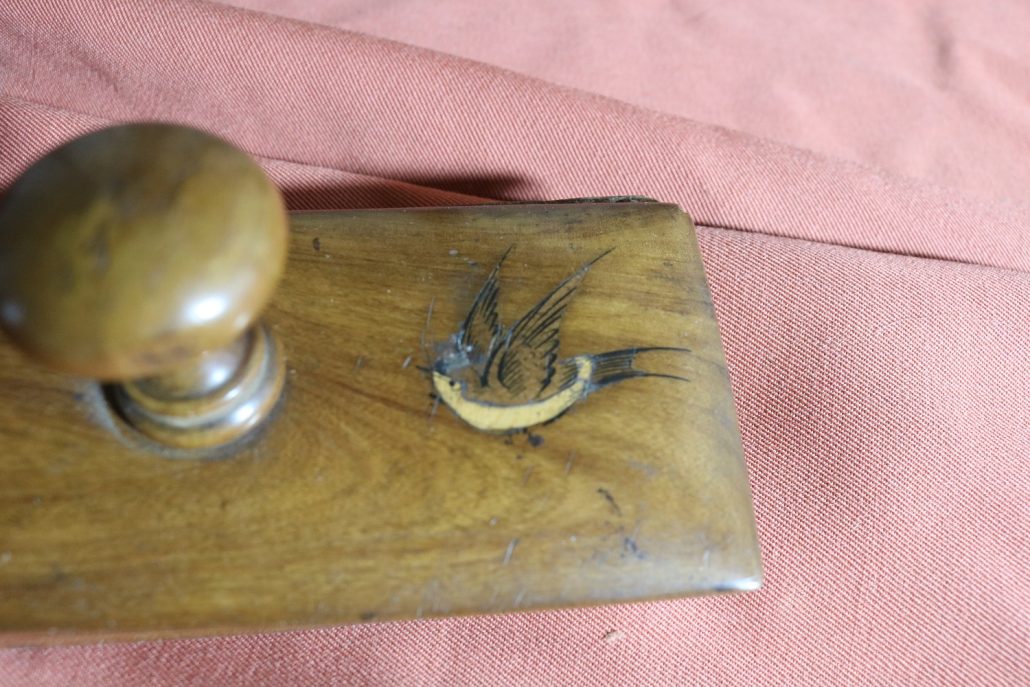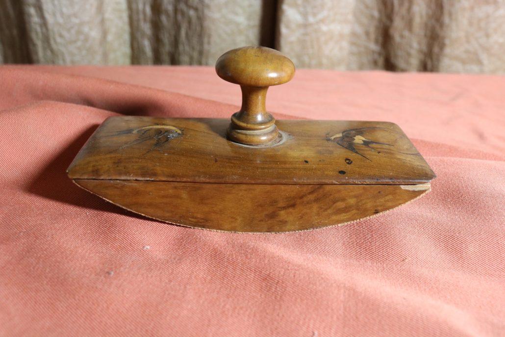 Dalla forma a mezzaluna questo oggetto presenta un pomolo in legno e sulla superficie una graziosa decorazione a intarsio raffigurante due rondini intente al volo.