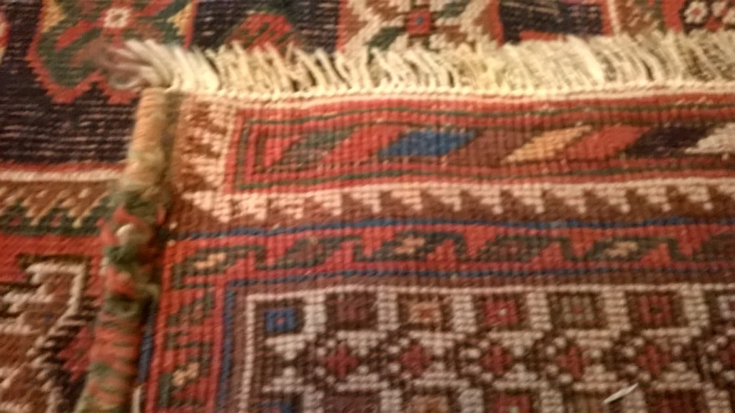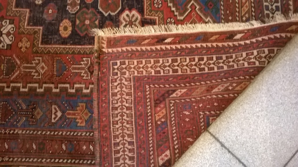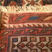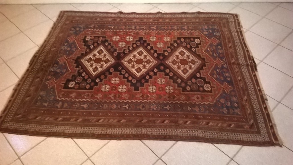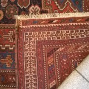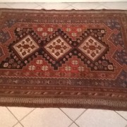 Tappeto in lana e cotone annodato a mano. Su campo rosso scuro risaltano tre riserve chiare con motivi geometrici, una larga fascia azzurra delimita il campo rosso ed è a sua volta delimitata da più ordini di fasce.