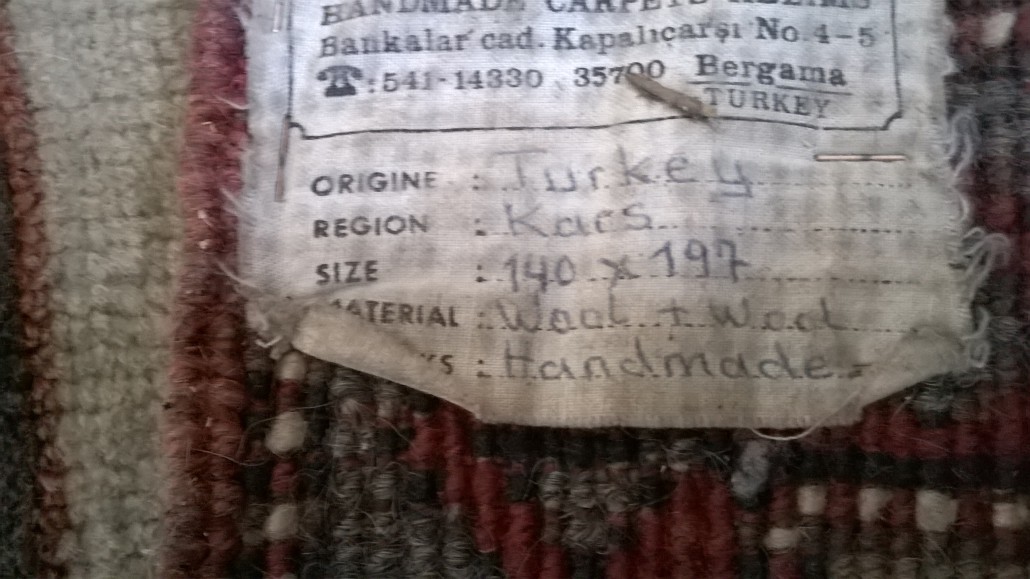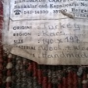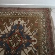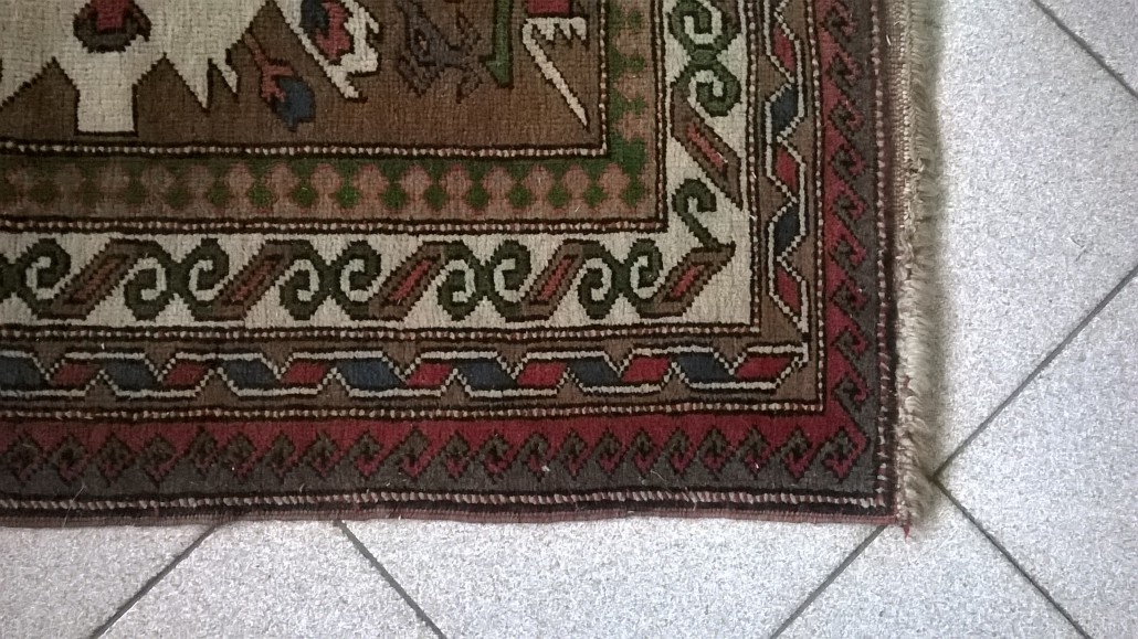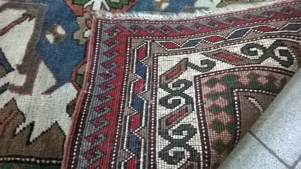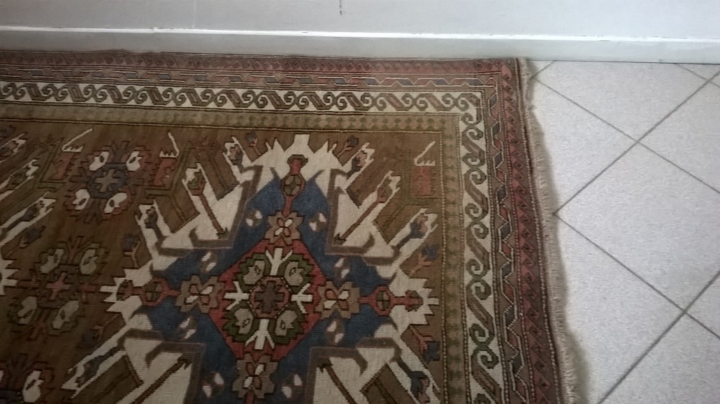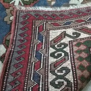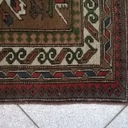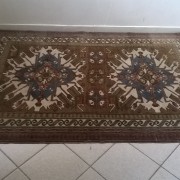 Tappeto in lana e cotone a motivi geometrici sui toni del rosso scuro con parti in bianco e blu