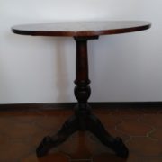 Tavolino tondo in noce. Piano tendo lastronato in radica di noce quadripartita. Balaustro centrale tripode.