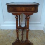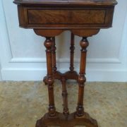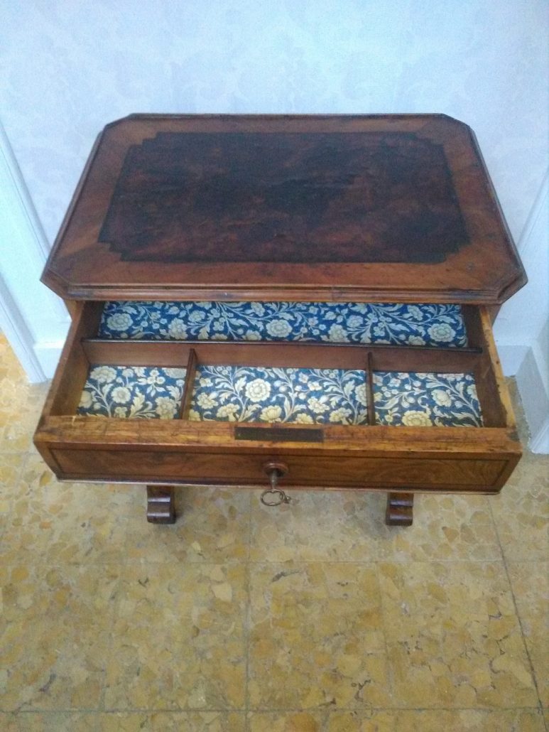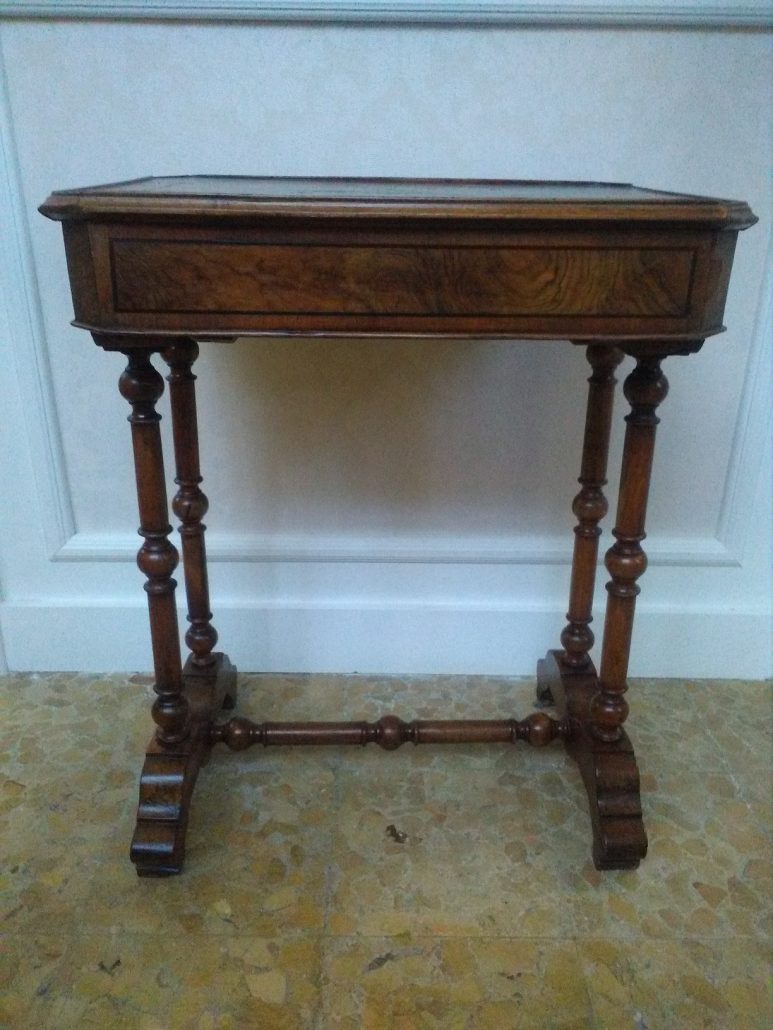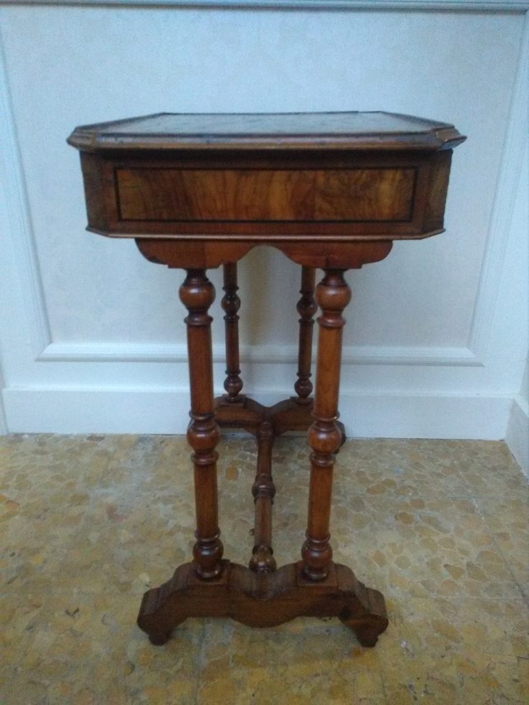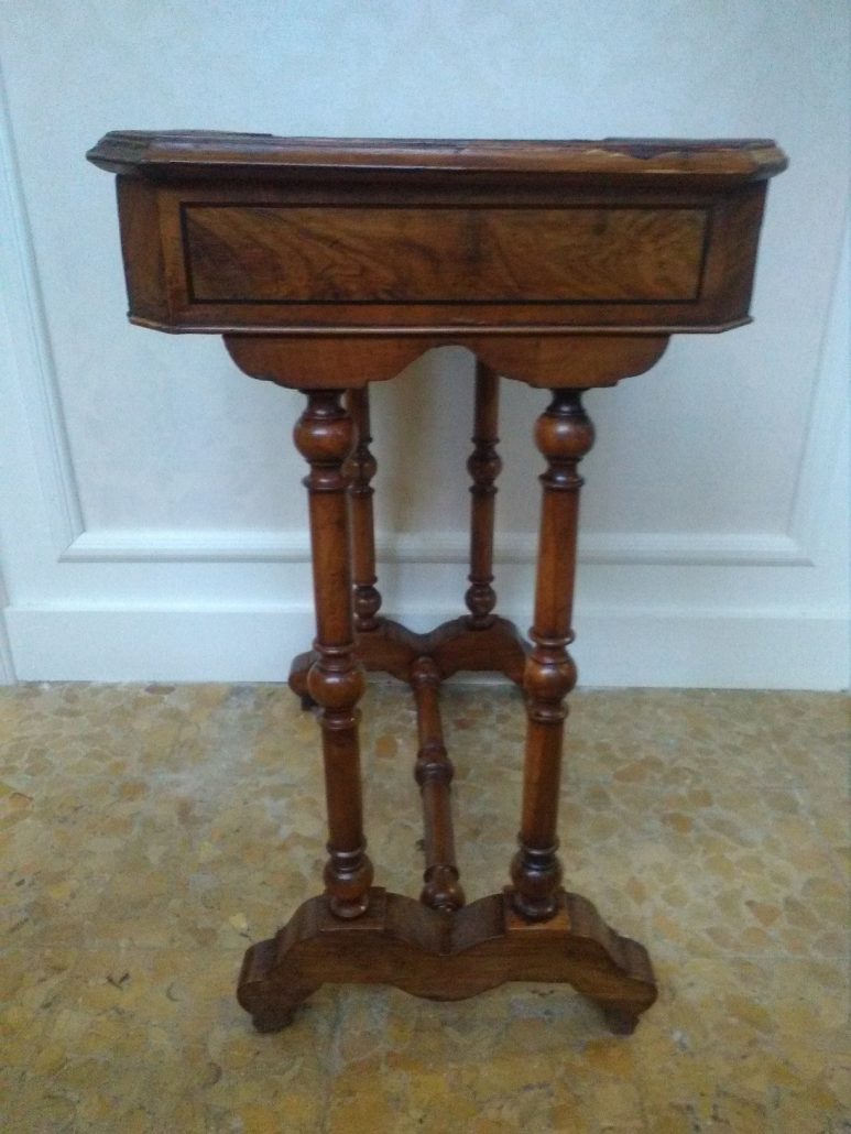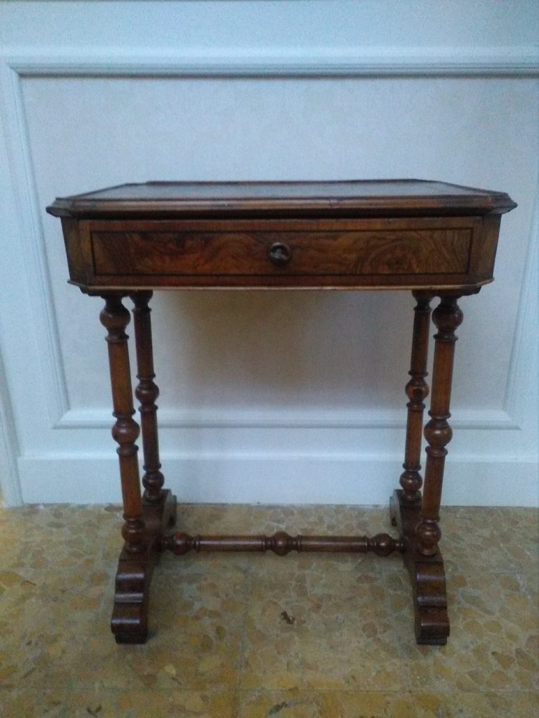 Tavolino da lavoro in noce. Piccolo arredo costituito da quattro gambe tornite, poggianti su due piedi sagomati uniti da un traverso, anche esso tornito. Piano scantonato, con una grande campitura centrale in radica di noce filettata in ebano, il piano è bordato da una cornicetta modanata. La fascia sotto piano presenta la medesima decorazione con radica di noce e filettatura in ebano. Frontalmente è presente un cassettino, munito di serratura, suddiviso al suo interno in comparti.