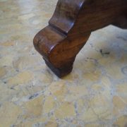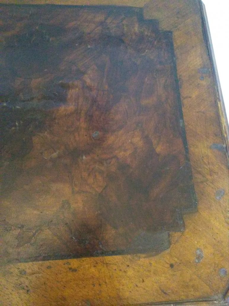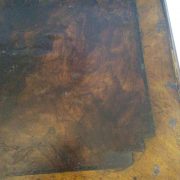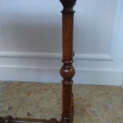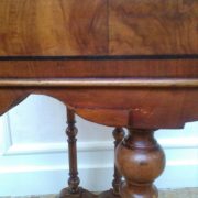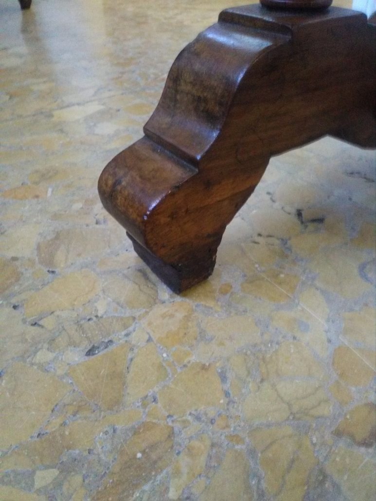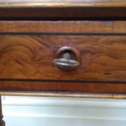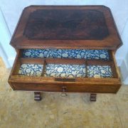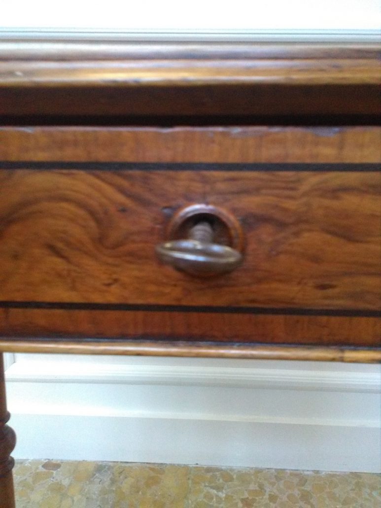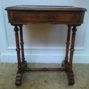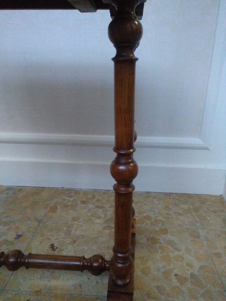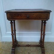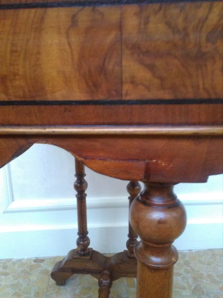 Tavolino da lavoro in noce. Piccolo arredo costituito da quattro gambe tornite, poggianti su due piedi sagomati uniti da un traverso, anche esso tornito. Piano scantonato, con una grande campitura centrale in radica di noce filettata in ebano, il piano è bordato da una cornicetta modanata. La fascia sotto piano presenta la medesima decorazione con radica di noce e filettatura in ebano. Frontalmente è presente un cassettino, munito di serratura, suddiviso al suo interno in comparti.