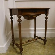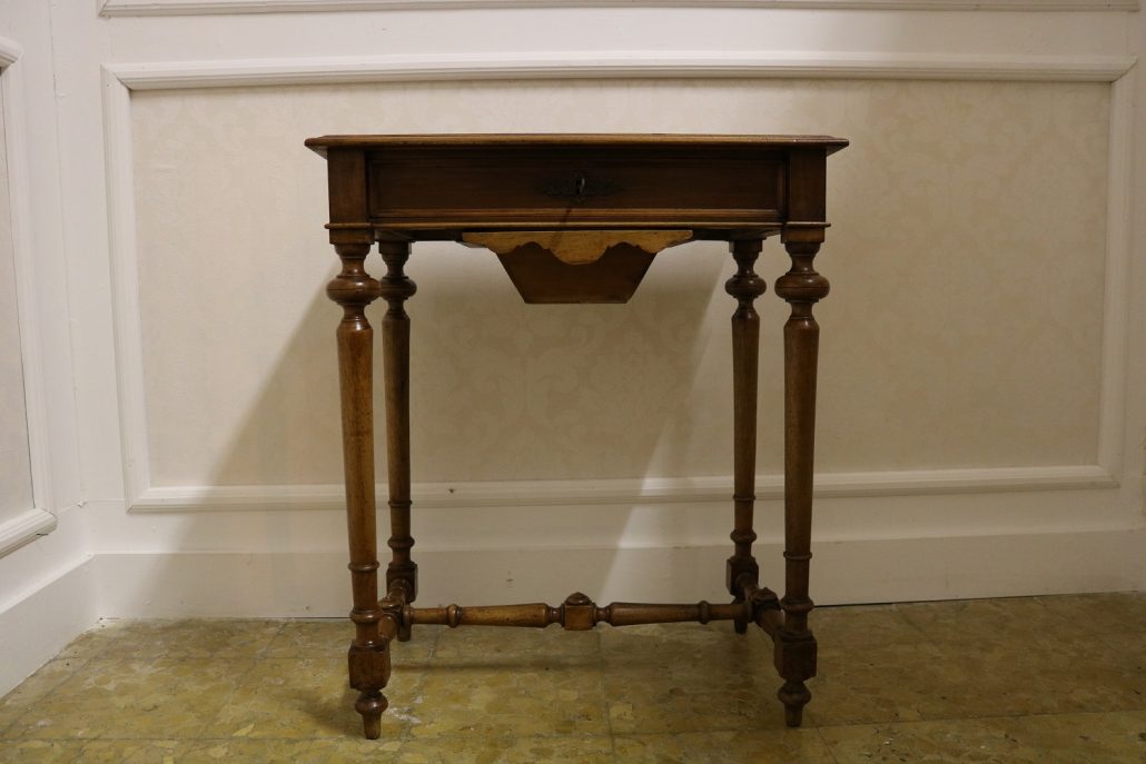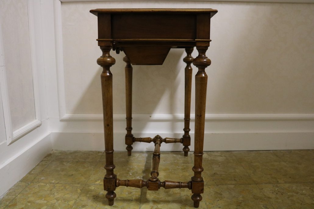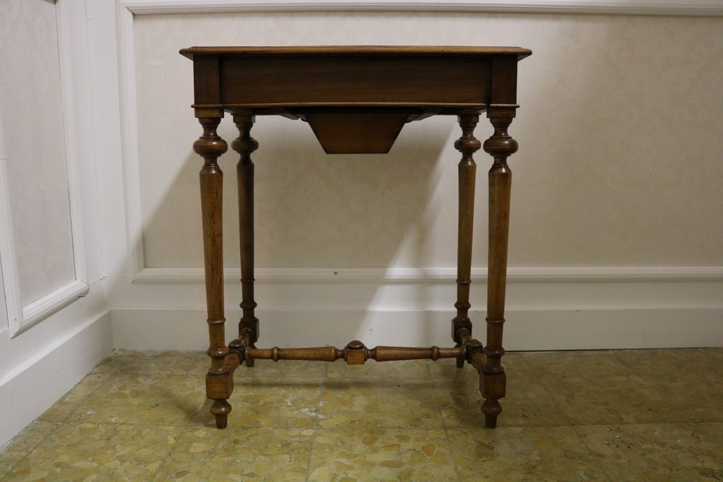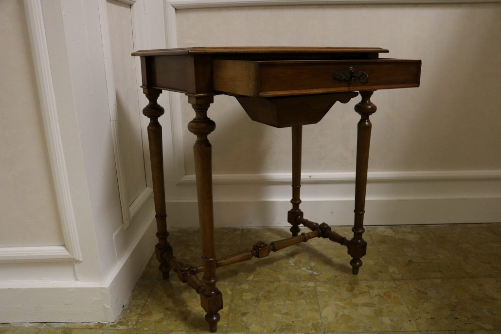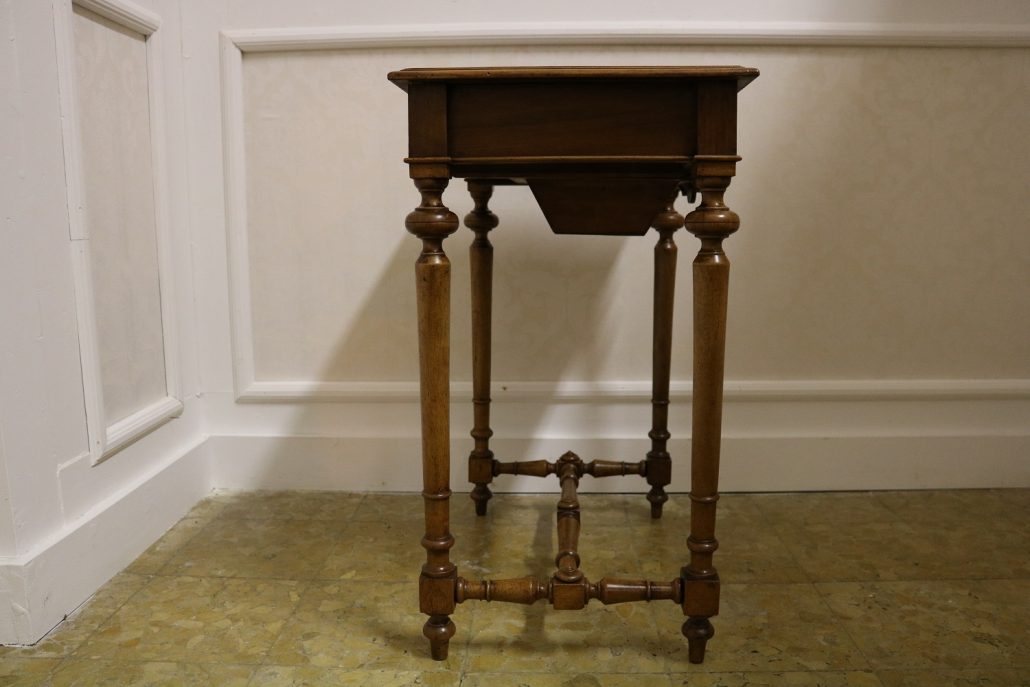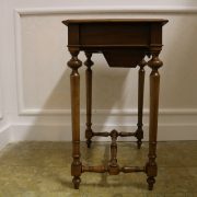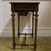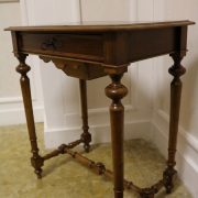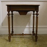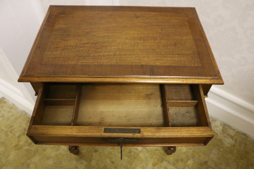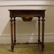 Tavolino in noce biondo. Arredo costituito da quattro gambe tornite, unite nella parte inferiore da traverso tornito anche esso, cassetto nella fascia sotto piano, munito di serratura suddiviso in scomparti e cassetto “cestello” sotto la fascia. piano aggettante con riserva centrale. Il tavolino, di ridotte dimensioni, nella sua semplicità mette in evidenza la bella tinta ambrata del noce biondo.