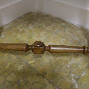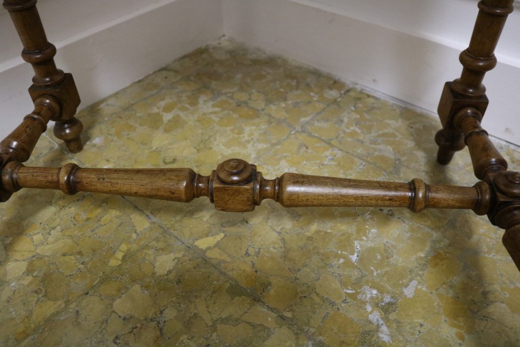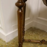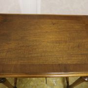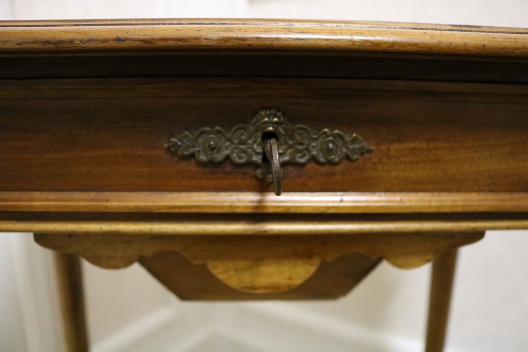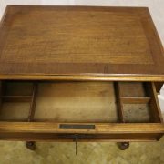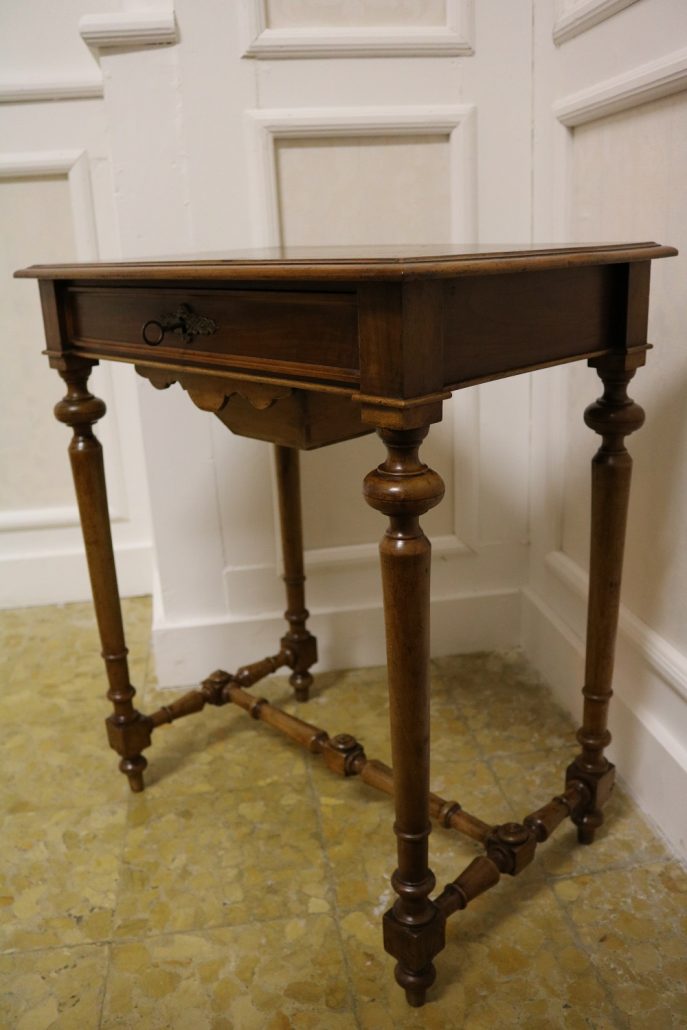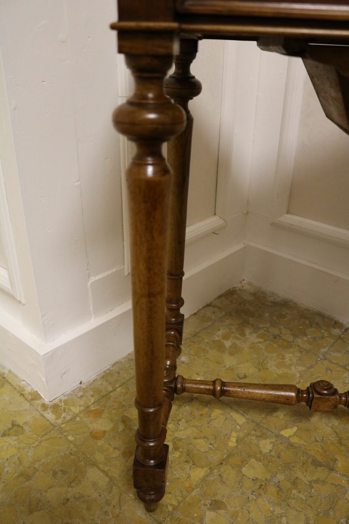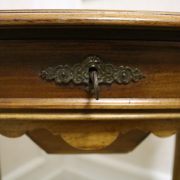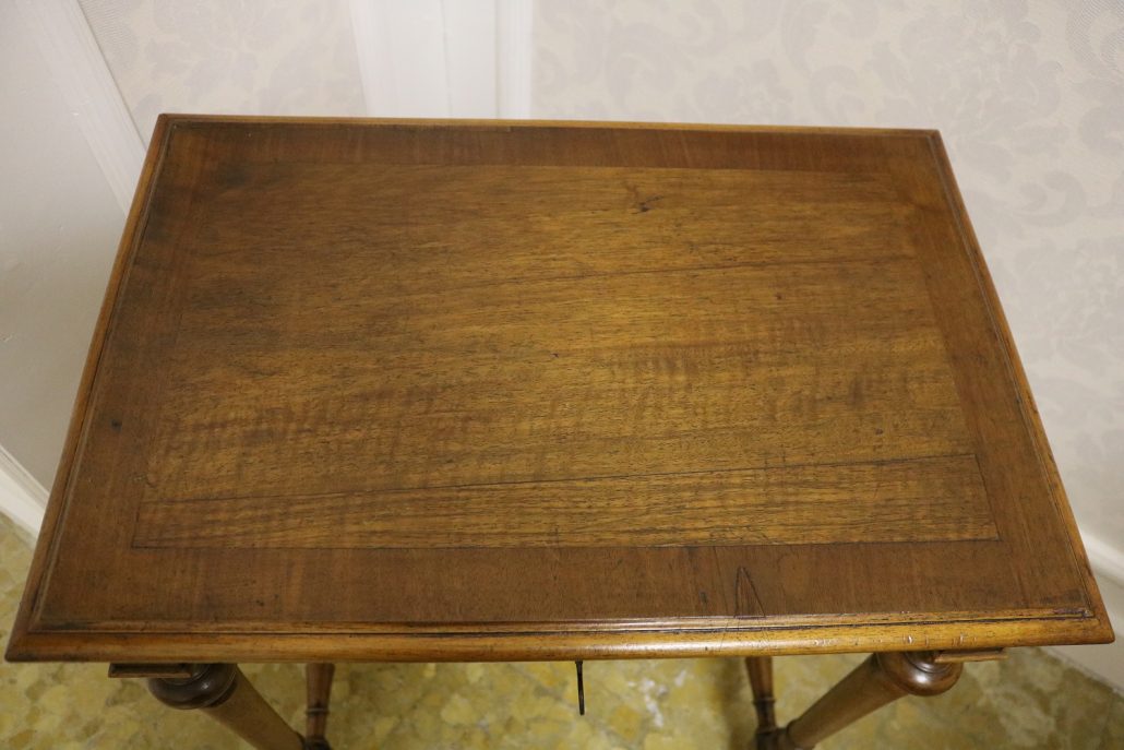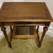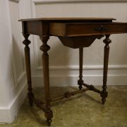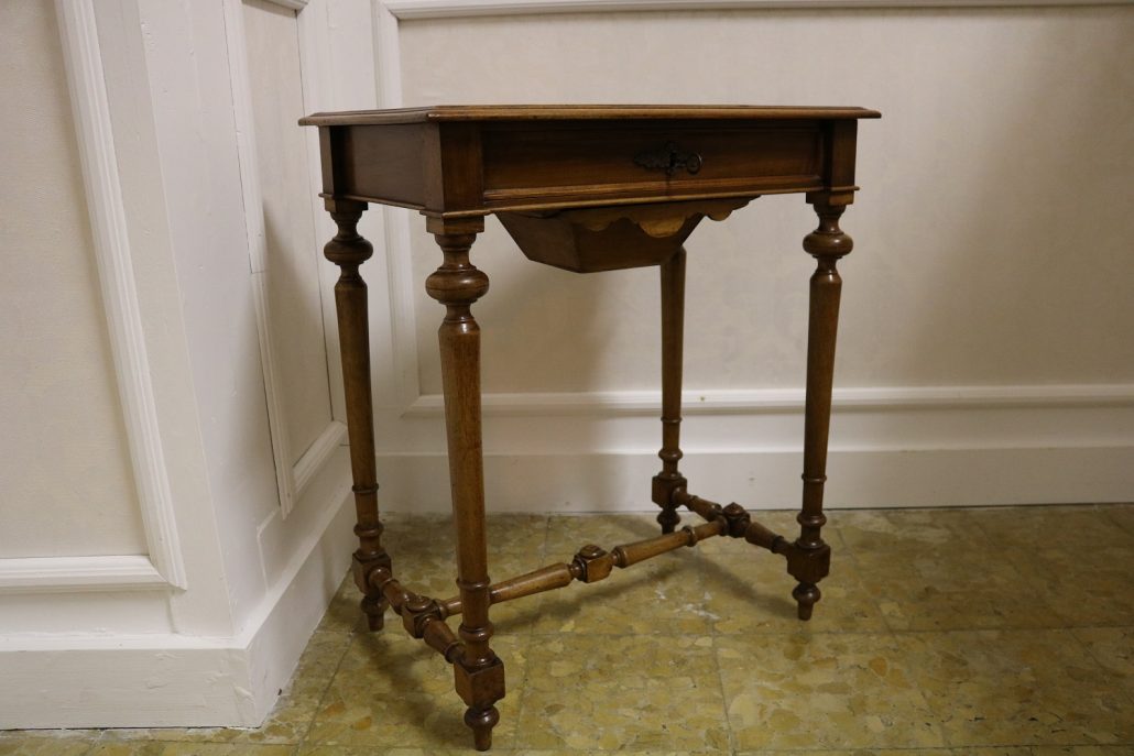 Tavolino in noce biondo. Arredo costituito da quattro gambe tornite, unite nella parte inferiore da traverso tornito anche esso, cassetto nella fascia sotto piano, munito di serratura suddiviso in scomparti e cassetto “cestello” sotto la fascia. piano aggettante con riserva centrale. Il tavolino, di ridotte dimensioni, nella sua semplicità mette in evidenza la bella tinta ambrata del noce biondo.
