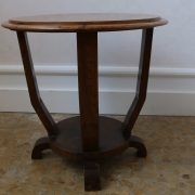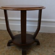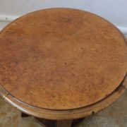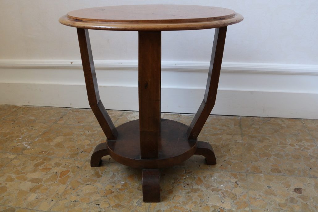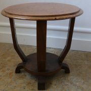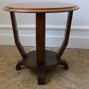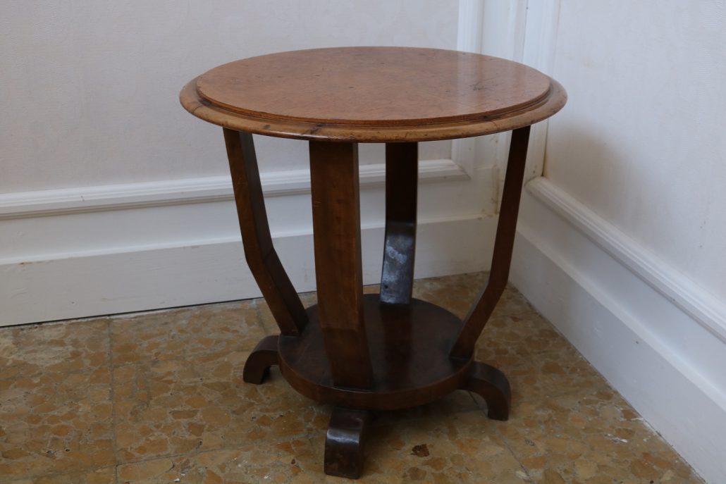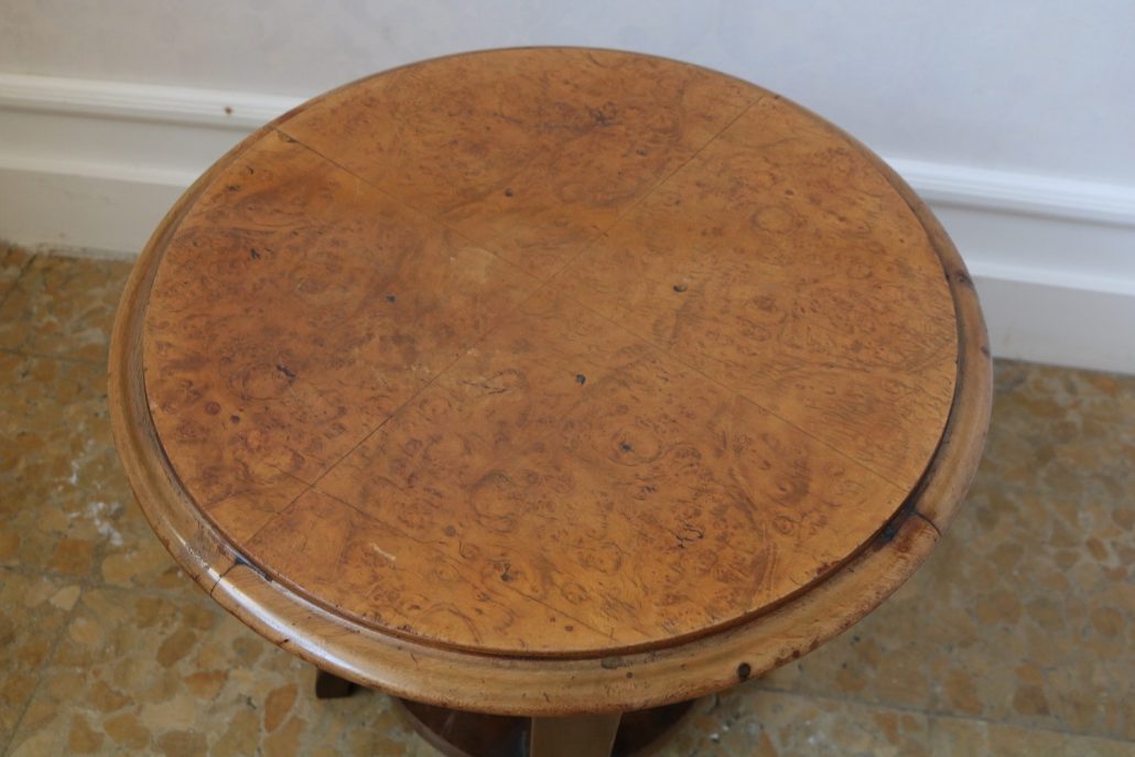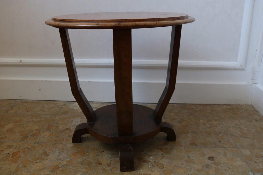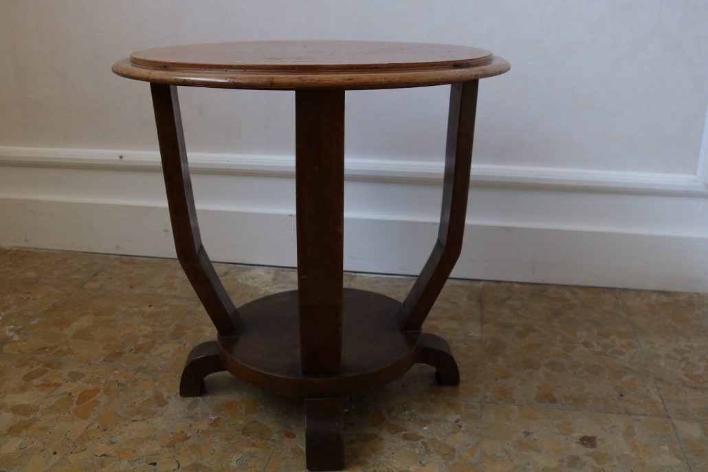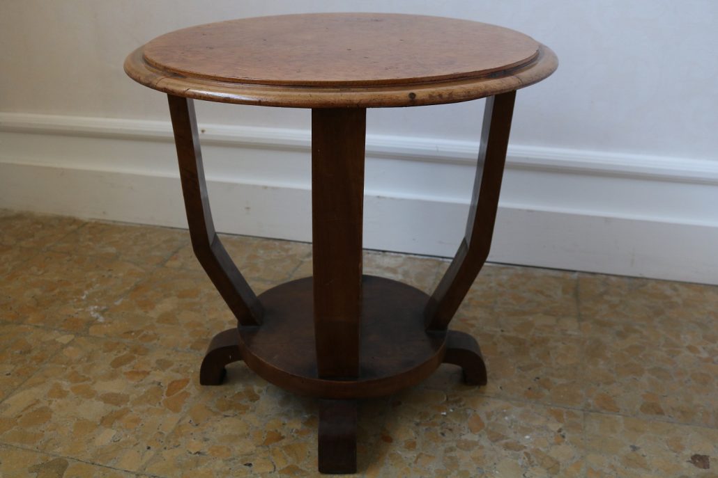 Tavolino tondo. Il piano in pregiata radica è sostenuto da quattro elementi curvi, quasi a dare l’impressione di flettersi per il peso dell’ipotetico oggetto posto al di sopra. Un secondo pianetto unisce, nella parte inferiore, i quattro elementi. Quattro piedi anch’essi curvi sostengono il tutto. La linea curva riprende perfettamente gli stilemi dello stile art déco in voga nel secondo quarto del XX Secolo. Questo stile infatti tre ispirazione da una geometria semplice, linee mosse e ampie campiture lasciano spazio alle belle essenze di un legno per lo più chiaro, a a preziose radiche. La sobrietà e la cura delle proporzioni stanno alla base di questo stile.