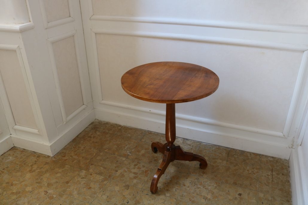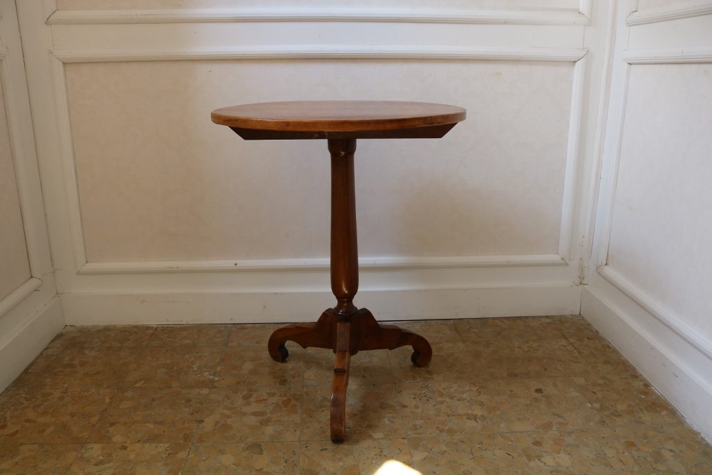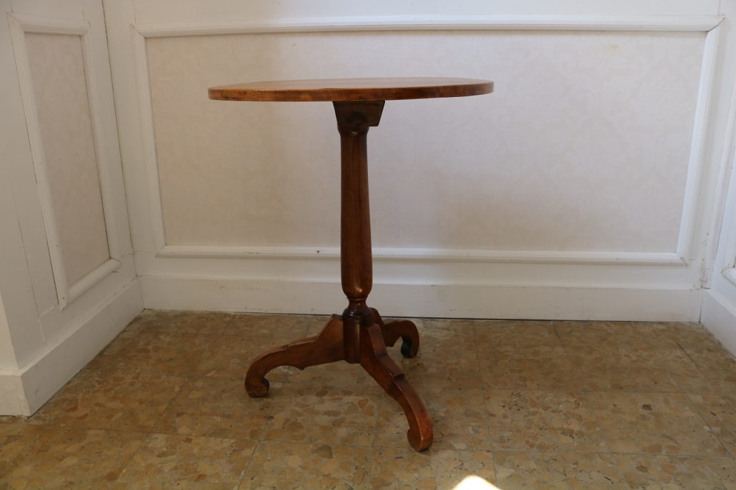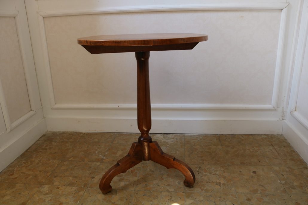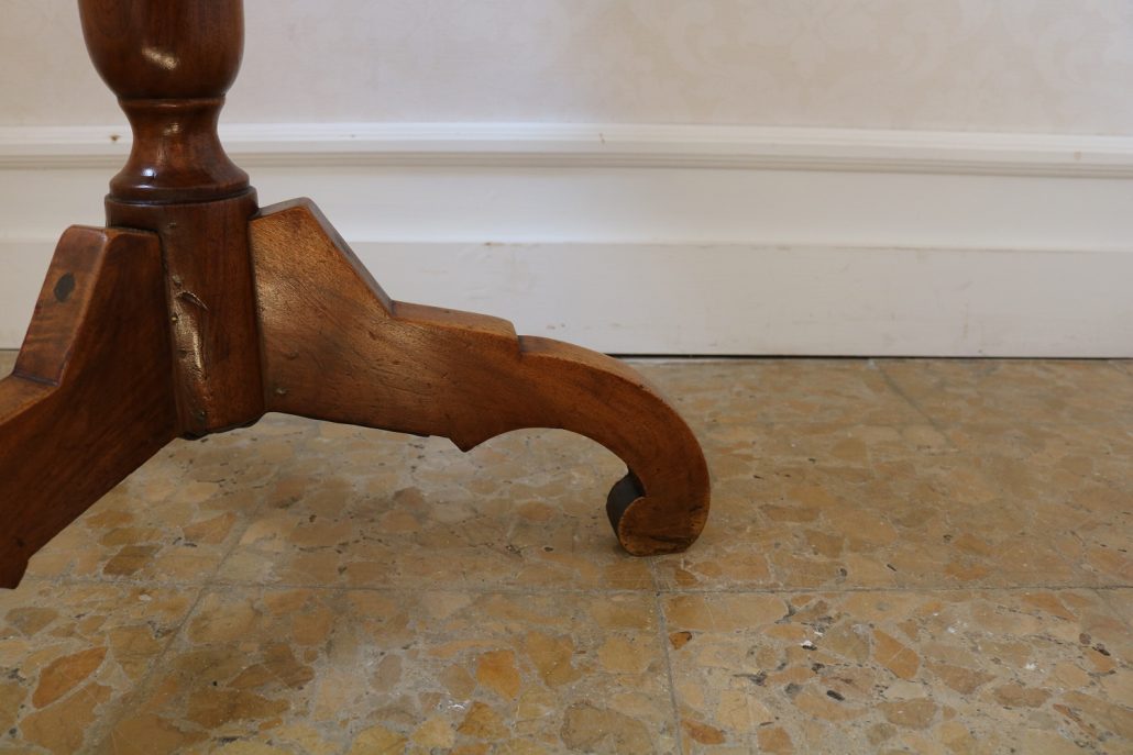 Tavolino tondo in noce. Arredo di piccole dimensioni costituito da una gamba centrale tornita poggiante su tre piedi sagomati e reggente un pianetto tondo. Il tavolino di semplicissima fattura, presenta un modello spogliato di ogni decorazione superflua, superfici lisce lasciano spazio alla nobile venatura del legno mentre le linee morbide enfatizzano l’estrema eleganza e la sobrietà ottenuta. Questo arredo rientra quindi, per tipologia stilistica e fattura alla prima metà del XIX Secolo seguendo i dettami stilistici dello stile Impero.