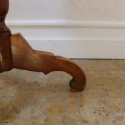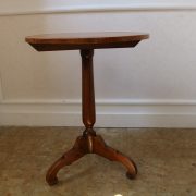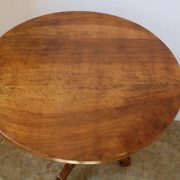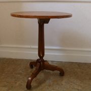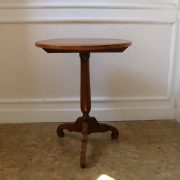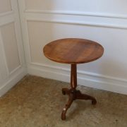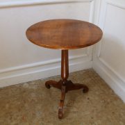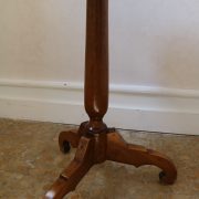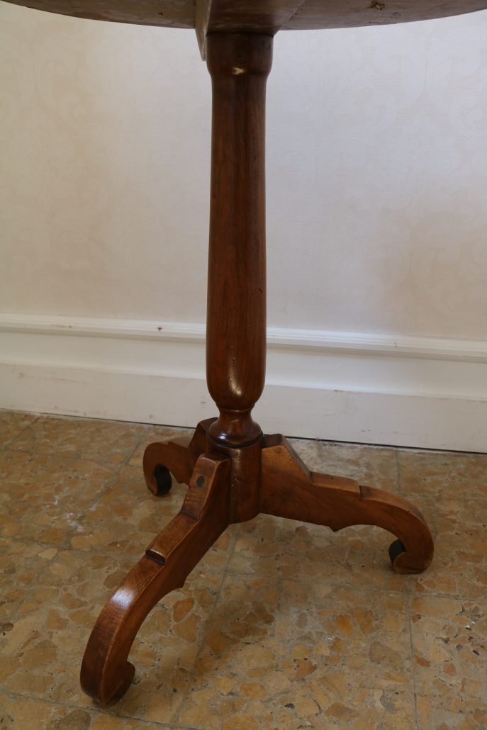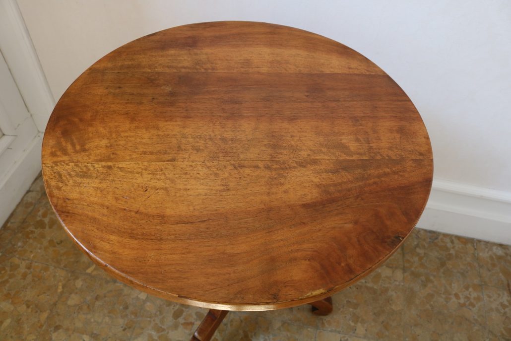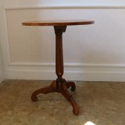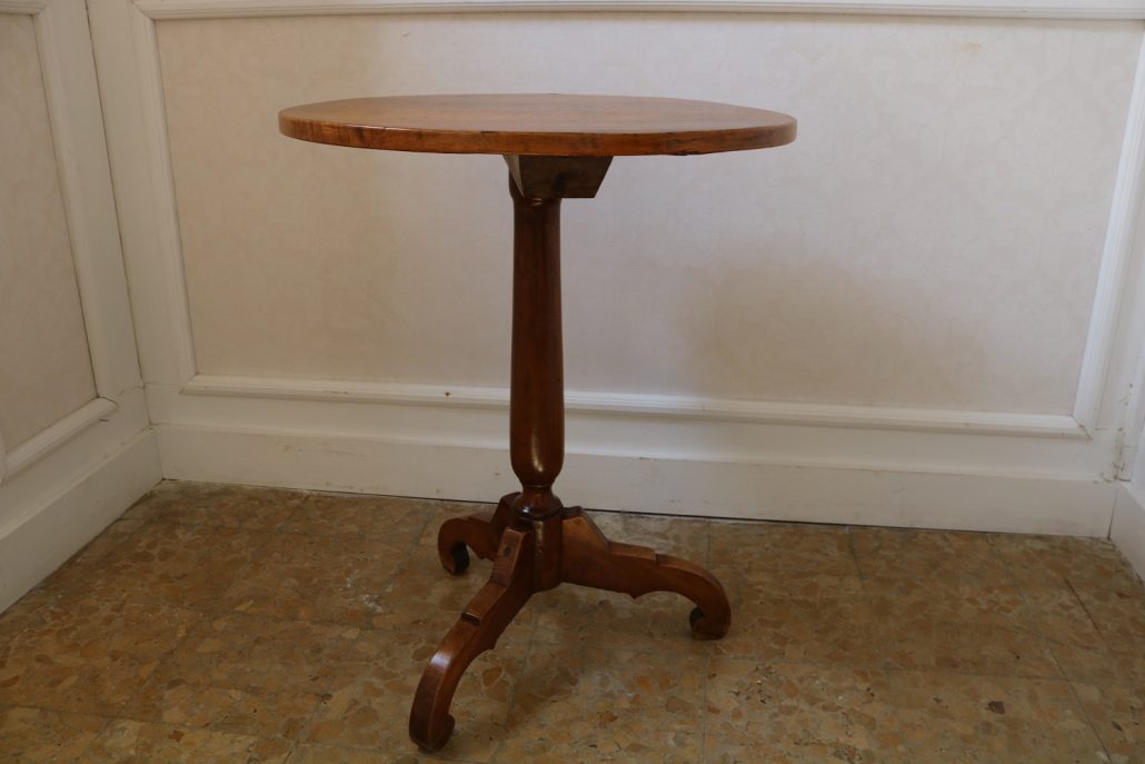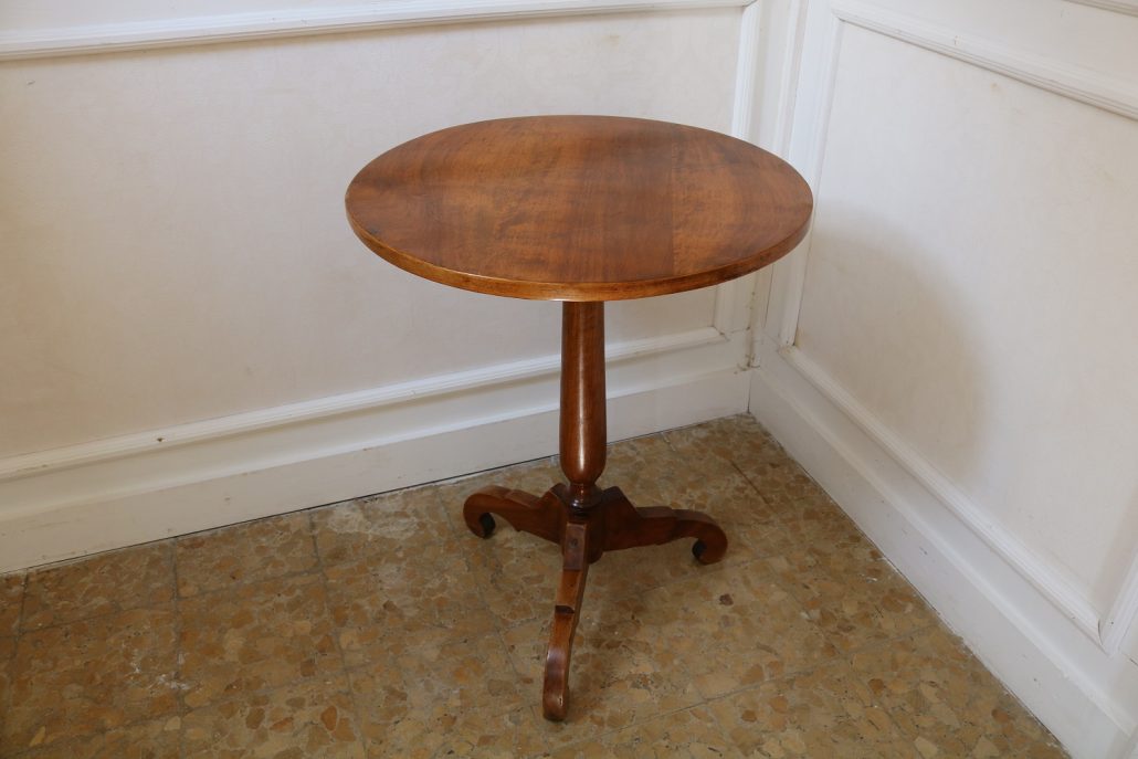 Tavolino tondo in noce. Arredo di piccole dimensioni costituito da una gamba centrale tornita poggiante su tre piedi sagomati e reggente un pianetto tondo. Il tavolino di semplicissima fattura, presenta un modello spogliato di ogni decorazione superflua, superfici lisce lasciano spazio alla nobile venatura del legno mentre le linee morbide enfatizzano l’estrema eleganza e la sobrietà ottenuta. Questo arredo rientra quindi, per tipologia stilistica e fattura alla prima metà del XIX Secolo seguendo i dettami stilistici dello stile Impero.