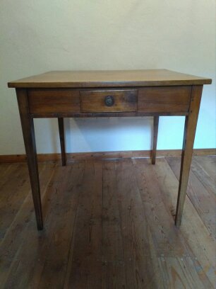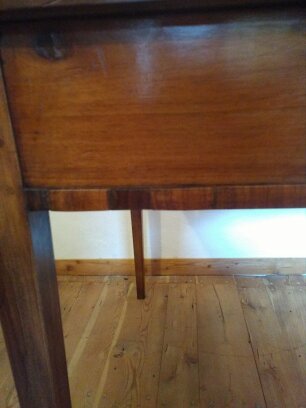 Lo stile neoclassico, più comunemente conosciuto come Luigi XVI, nel suo primo sviluppo, era caratterizzato proprio dalla ricerca delle proporzioni, dalla bellezza e ricercatezza dei materiali, dalla leggerezza delle forme .Questo tavolo ne fa trasparire tutte le caratteristiche e presenta varie possibilità di utilizzo, in quanto si presta ad una facile collocazione, cucina, soggiorno, ufficio; probabilmente la sua funzione iniziale era quella di tavolo da gioco, come testimoniano i piccoli cassettini presenti in ogni lato.