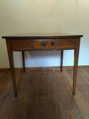Tavolo in ciliegio massello conquattro gambe a obelisco rovesciato, quattro cassettini, uno in ogni fascia laterale, piano quadrato con intarsio centrale a stella in noce. Questo arredo presenta linee pulite e semplici tipiche dello stile neoclassico. L’eleganza è data dai particolari come la cornicetta nella parte inferiore delle fasce posta con la venatura in verticale, l’intarsio sul piano con una stella, e dalle belle proporzioni.