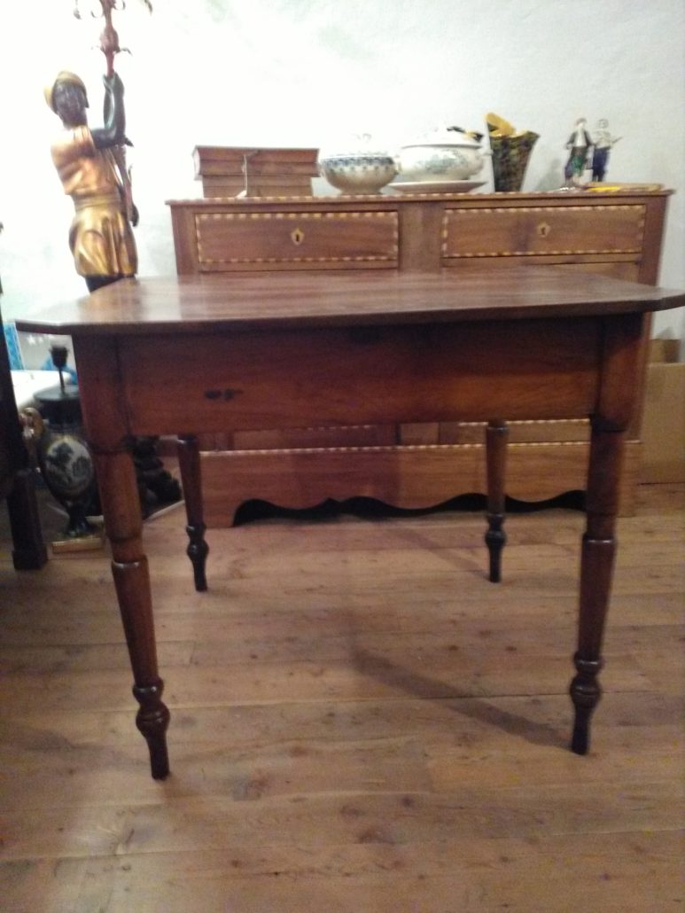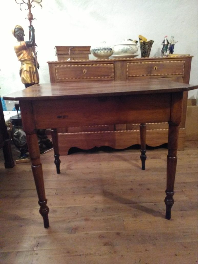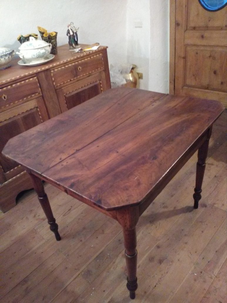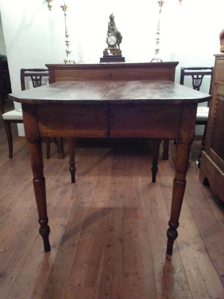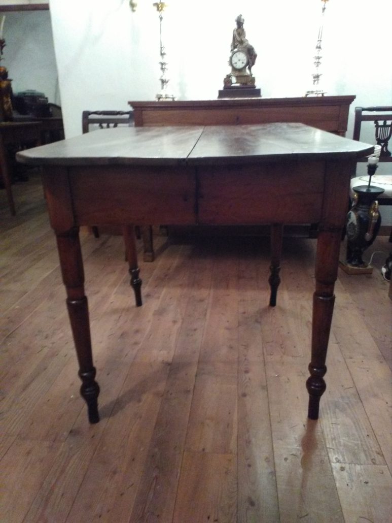 Tavolo allungabile in noce massello. Quattro gambe tornite innestate in alte fasce, piano smussato agli angoli,