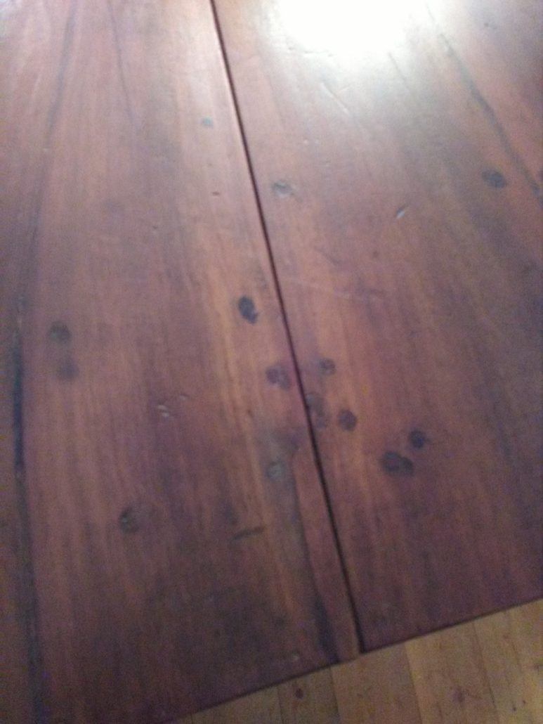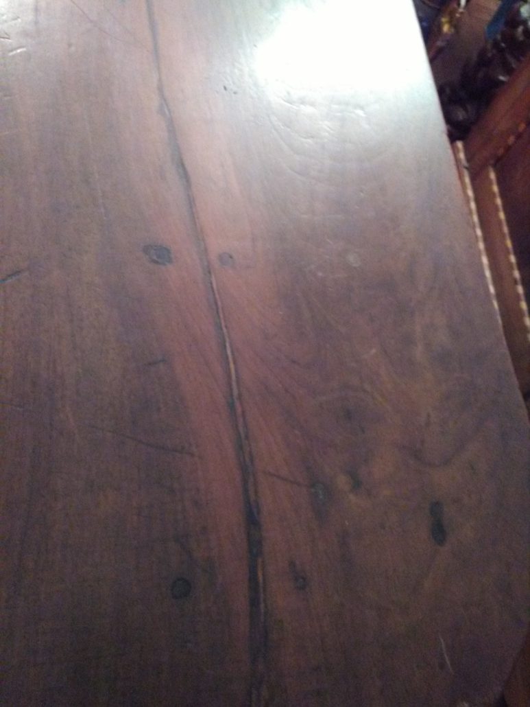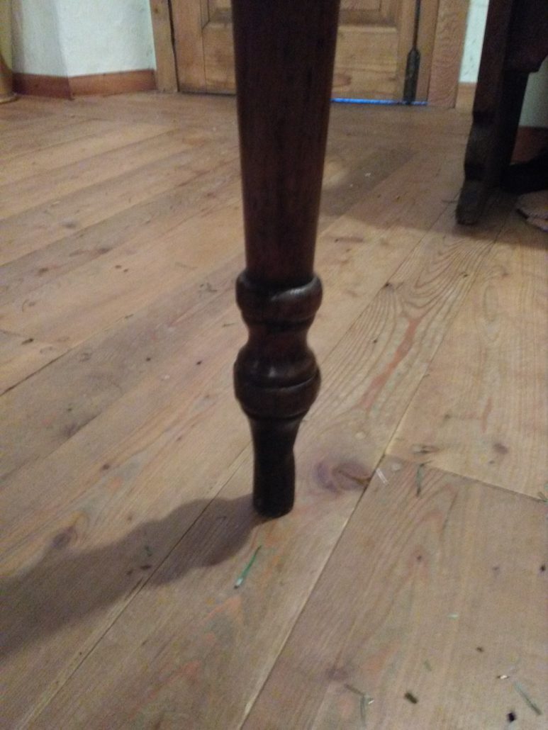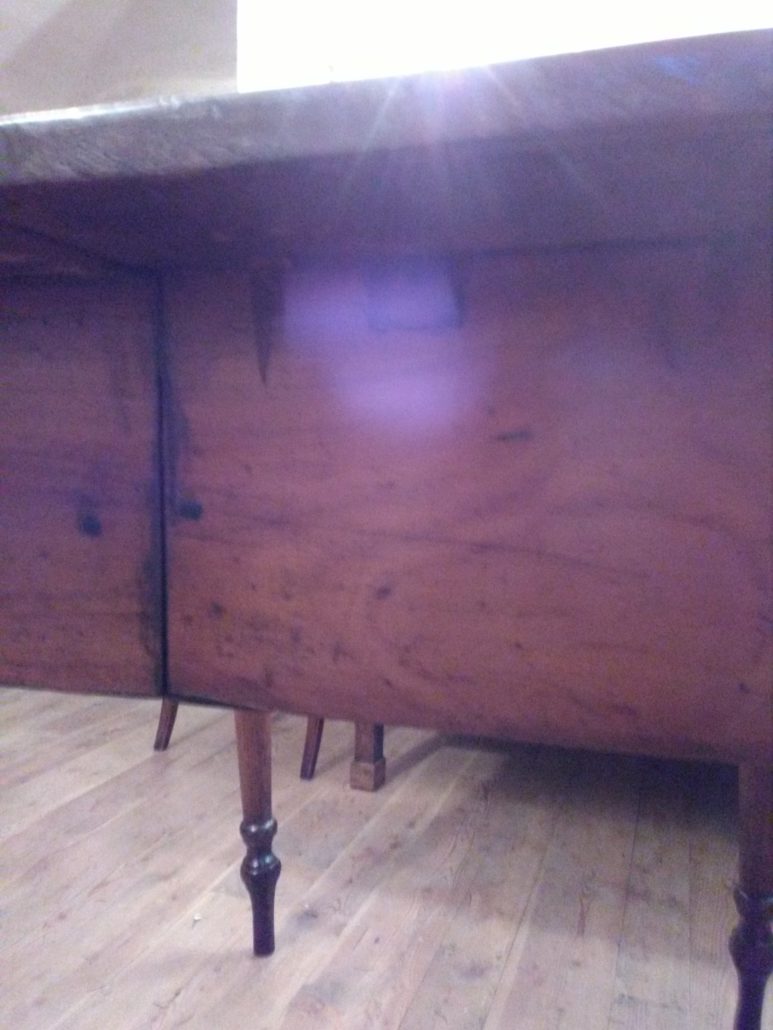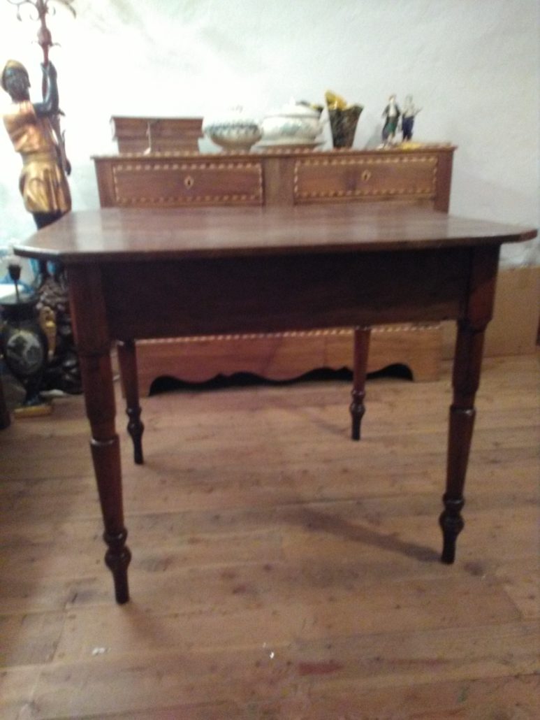 Tavolo allungabile in noce massello. Quattro gambe tornite innestate in alte fasce, piano smussato agli angoli,