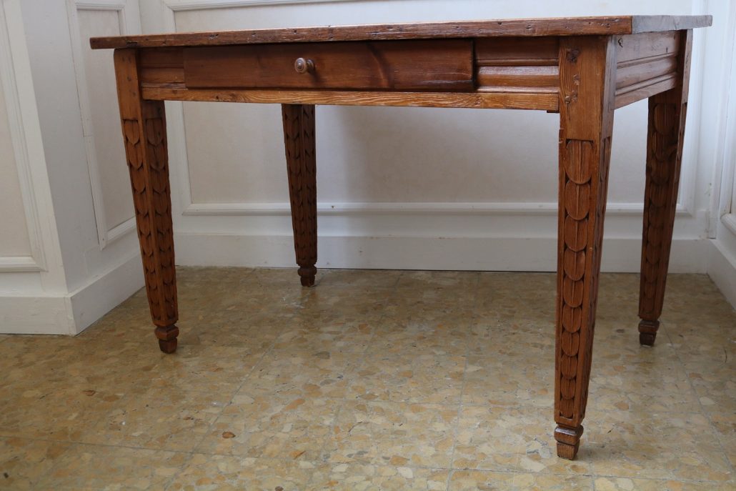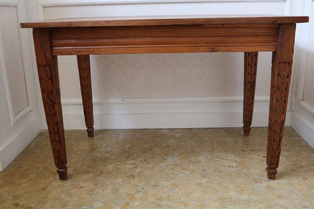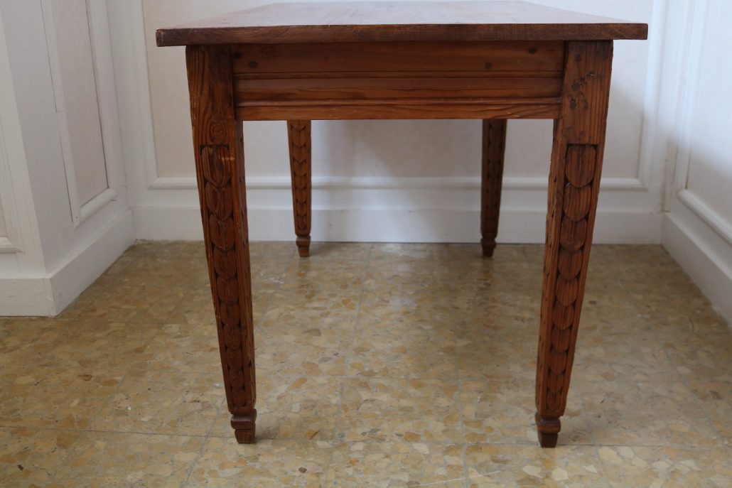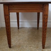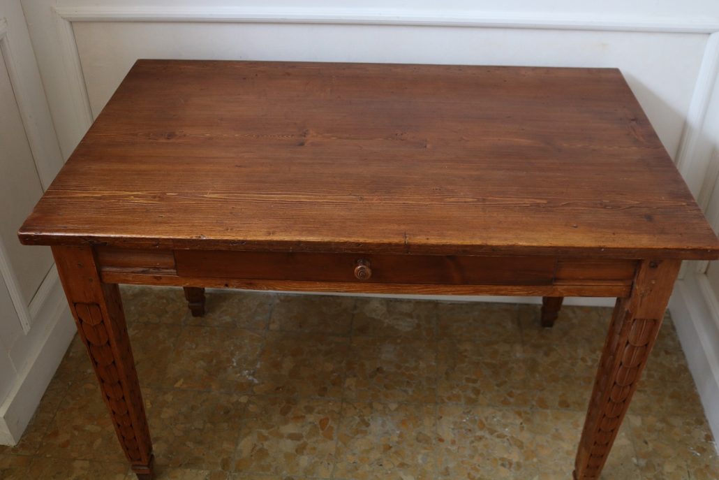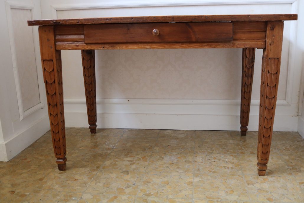 Tavolo costituito da quattro gambe a obelisco rovesciato, intagliate con motivo ricorrente a foglie stilizzate, desinenti alla base con piedino. Fasce sottopiano modanate con grande cassetto nella parte frontale. Piana aggettante di semplice fattura. Il mobile presenta una tipologia costruttiva tipica nell’ultimo quarto del XVIII Secolo che unita allo stile della decorazione collocano questo arredo in area Lombardo-Veneto. Di belle proporzioni e di minuziosa fattura nell’intaglio, questo tavolo, racchiude in se il gusto dello stile Luigi XVI.