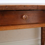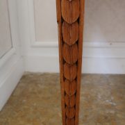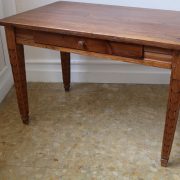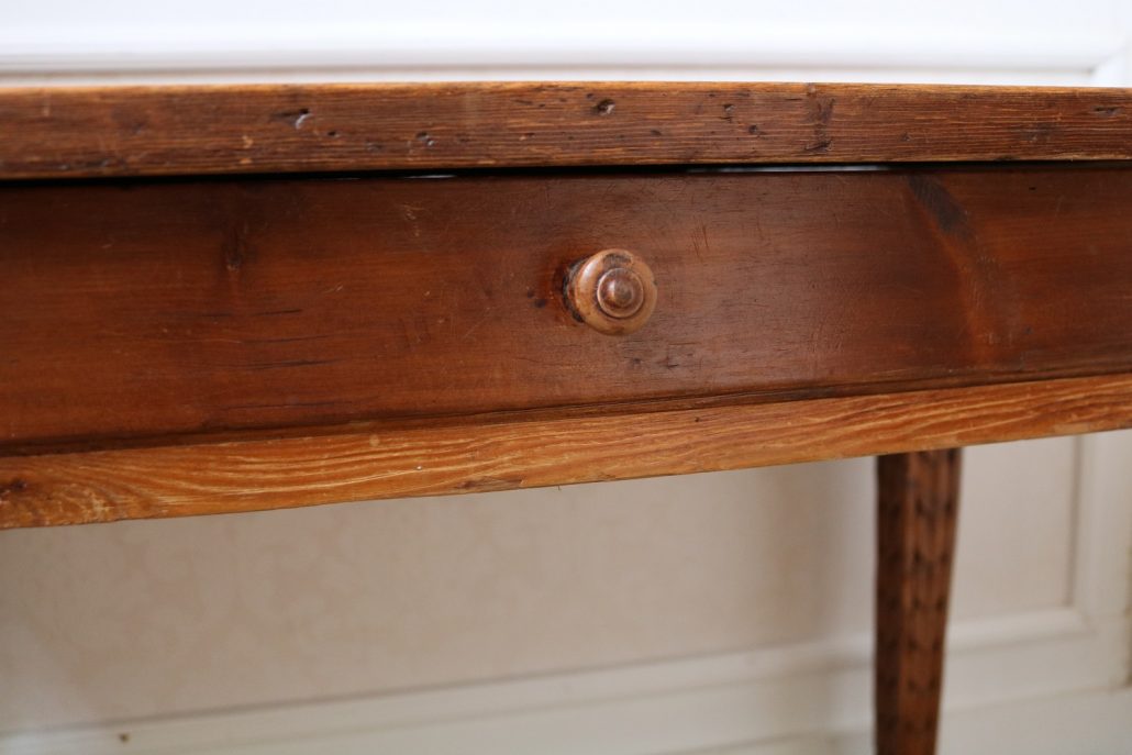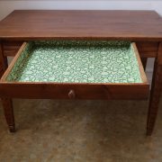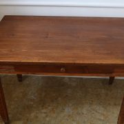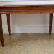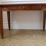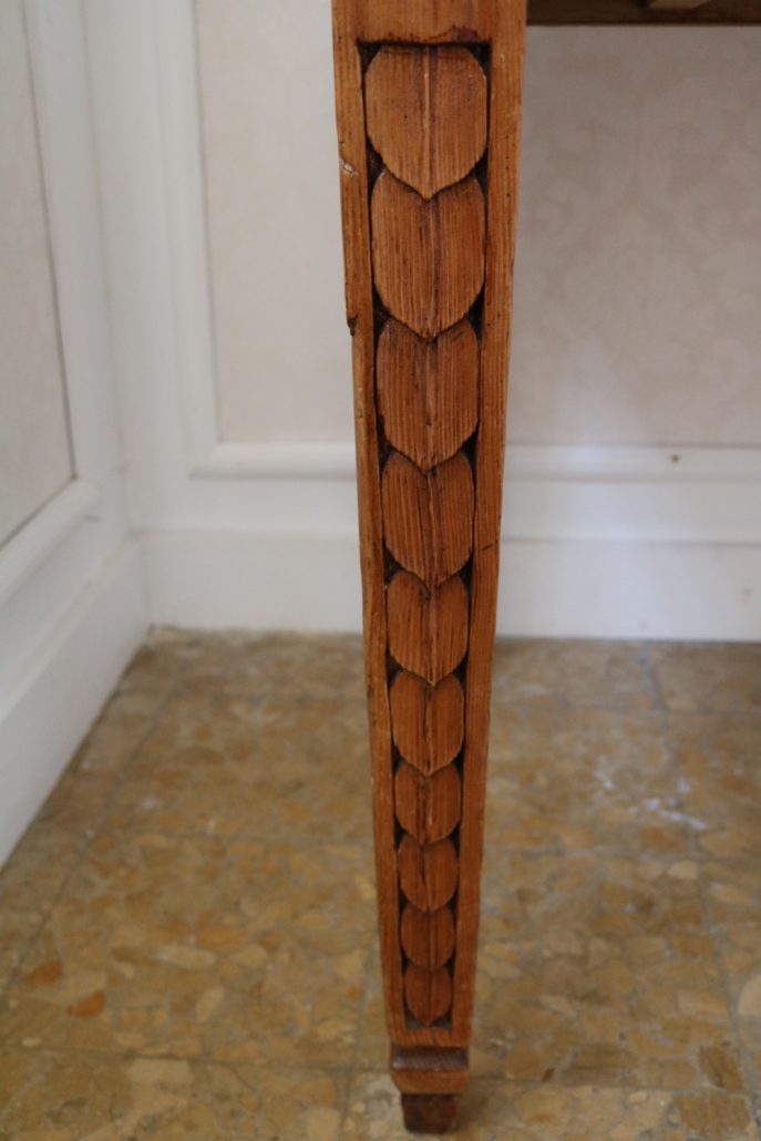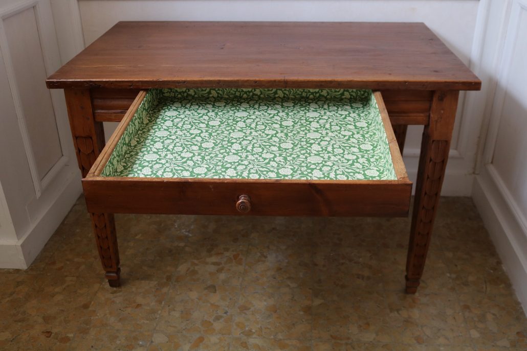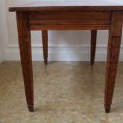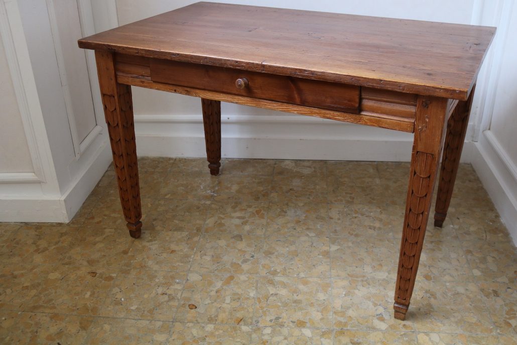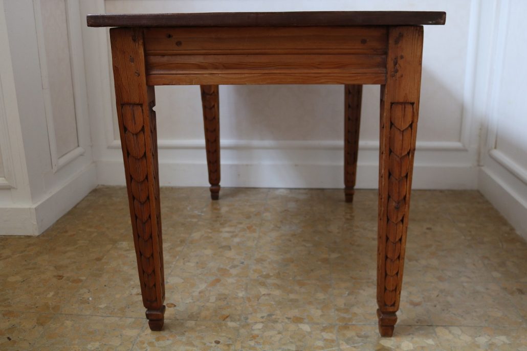 Tavolo costituito da quattro gambe a obelisco rovesciato, intagliate con motivo ricorrente a foglie stilizzate, desinenti alla base con piedino. Fasce sottopiano modanate con grande cassetto nella parte frontale. Piana aggettante di semplice fattura. Il mobile presenta una tipologia costruttiva tipica nell’ultimo quarto del XVIII Secolo che unita allo stile della decorazione collocano questo arredo in area Lombardo-Veneto. Di belle proporzioni e di minuziosa fattura nell’intaglio, questo tavolo, racchiude in se il gusto dello stile Luigi XVI.