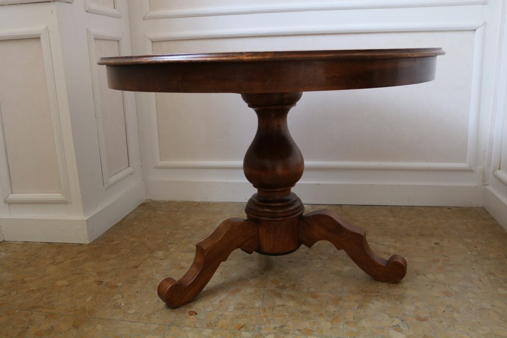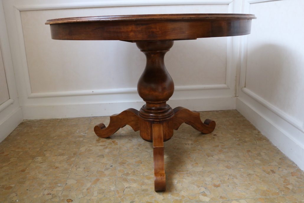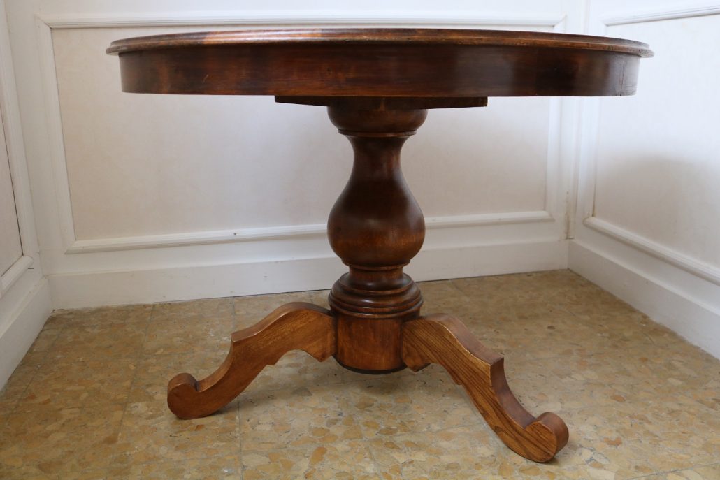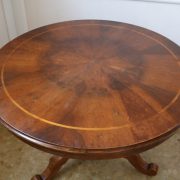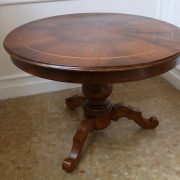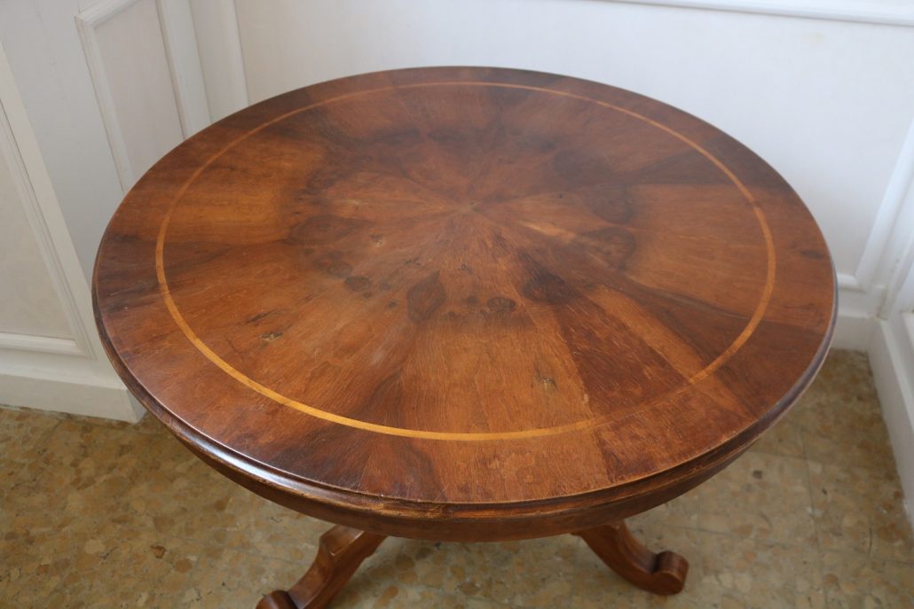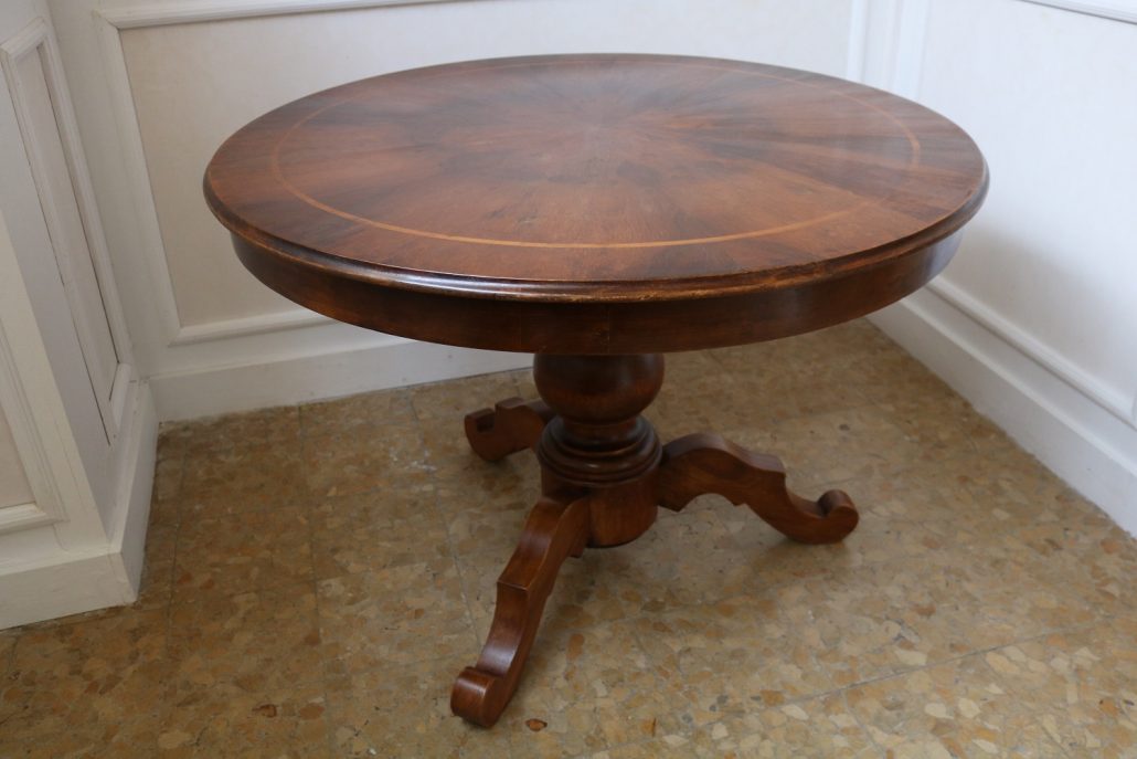 Tavolo di forma tonda in noce. Arredo costituito da una piana tonda, lavorata con venatura posta a raggera ed arricchita da una larga filettatura in acero a correre adiacente al perimetro creando un piacevole contrasto. Una fascia a tamburo rafforza otticamente lo spessore della piana leggermente aggettante e terminante con una lieve modanatura. La gamba centrale tornita è sostenuta da tre piedi sagomati a mensola. Elegante nella sua sobrietà, questo tavolo presenta in forme e proporzioni un modello Luigi Filippo di metà XIX Secolo, molto in voga , ma la tecnica costruttiva lo pongono nei primi decenni del XX Secolo.