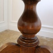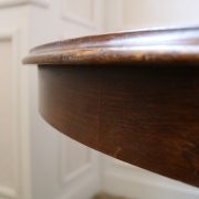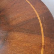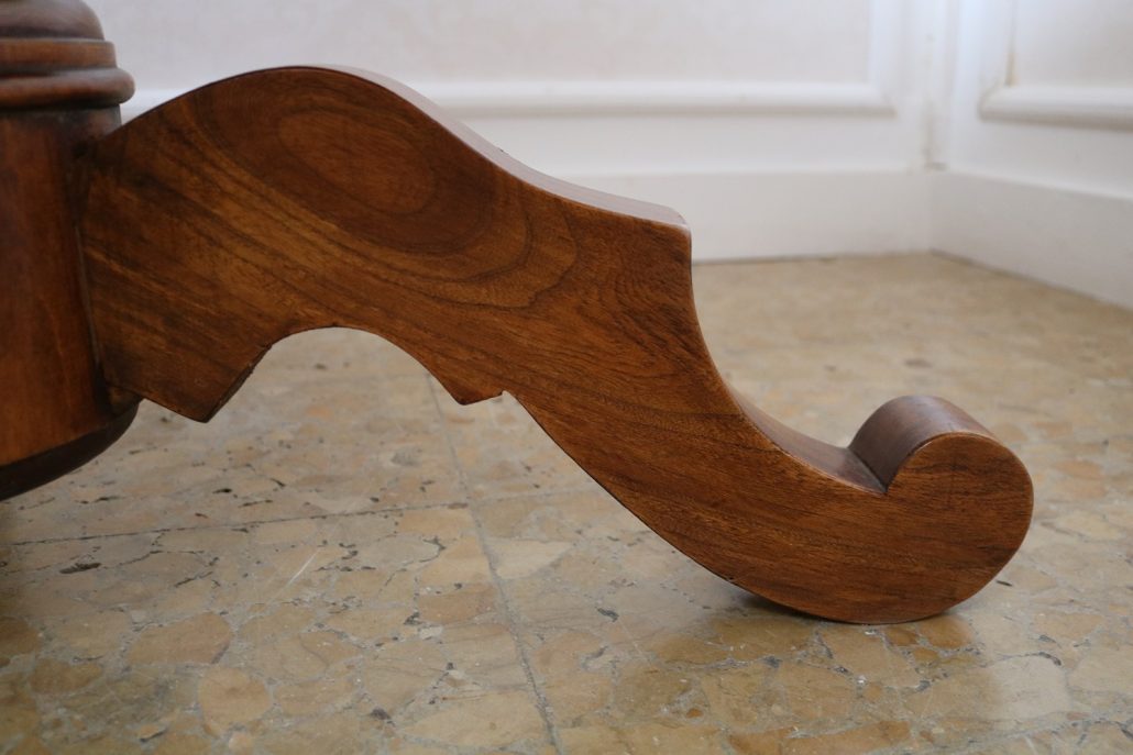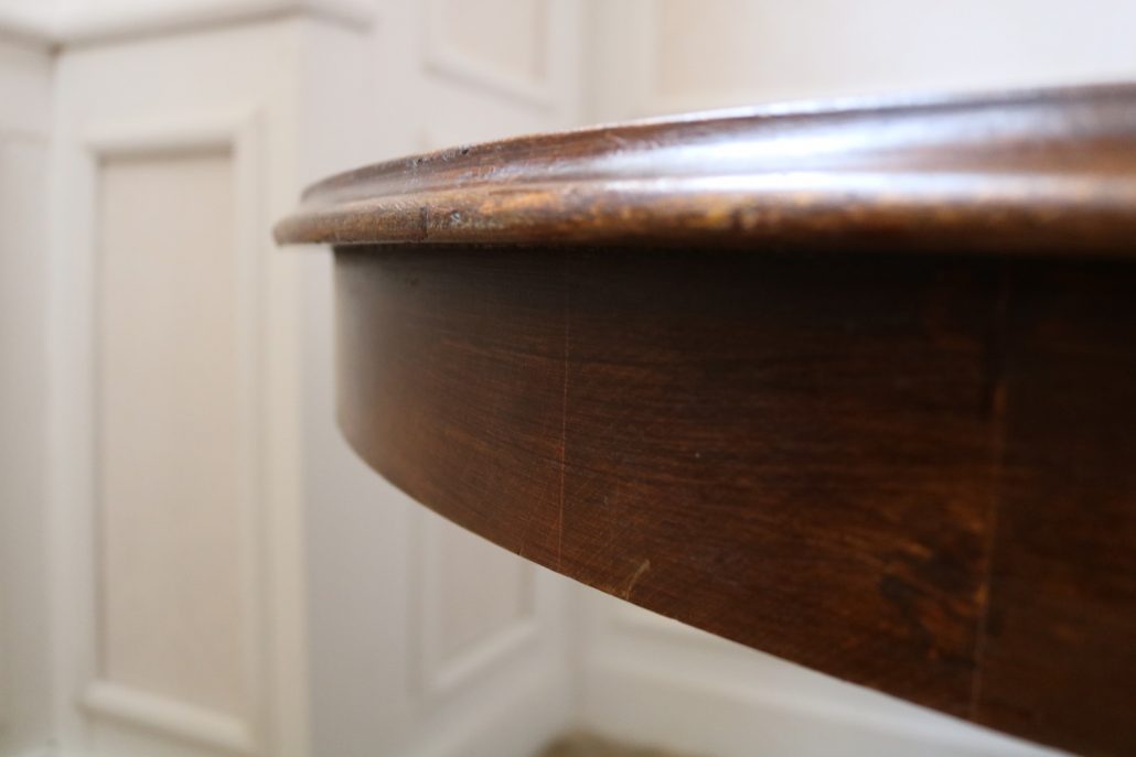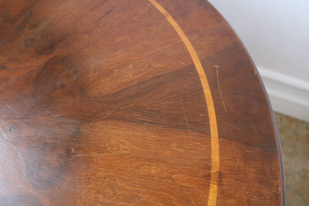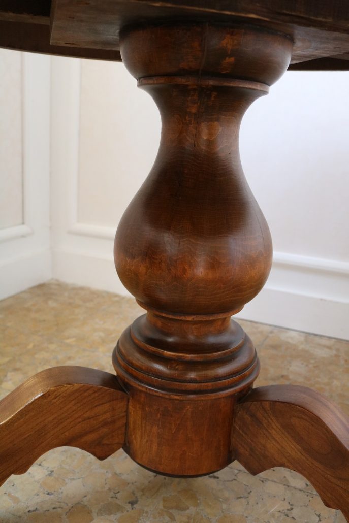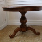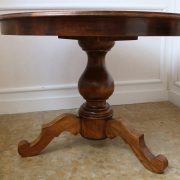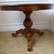 Tavolo di forma tonda in noce. Arredo costituito da una piana tonda, lavorata con venatura posta a raggera ed arricchita da una larga filettatura in acero a correre adiacente al perimetro creando un piacevole contrasto. Una fascia a tamburo rafforza otticamente lo spessore della piana leggermente aggettante e terminante con una lieve modanatura. La gamba centrale tornita è sostenuta da tre piedi sagomati a mensola. Elegante nella sua sobrietà, questo tavolo presenta in forme e proporzioni un modello Luigi Filippo di metà XIX Secolo, molto in voga , ma la tecnica costruttiva lo pongono nei primi decenni del XX Secolo.