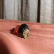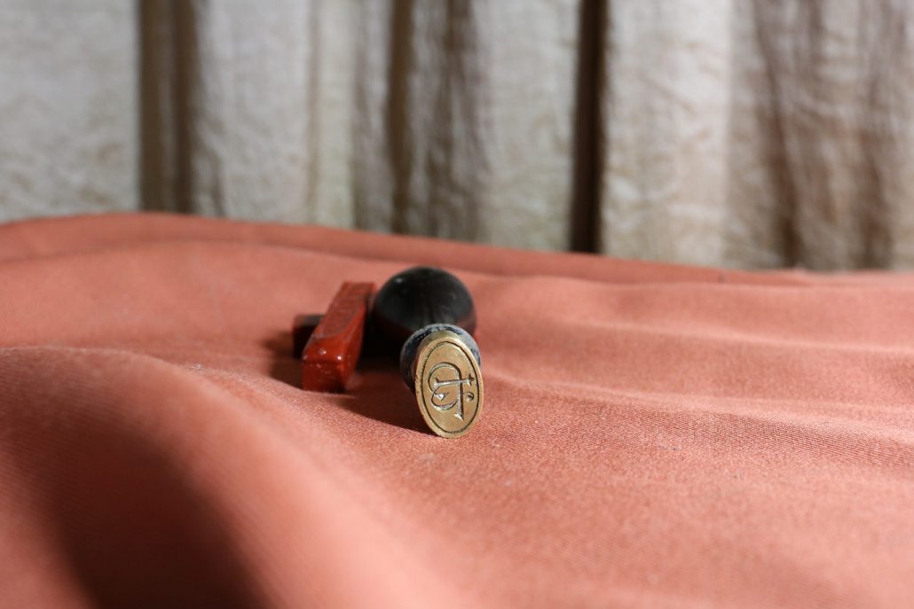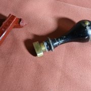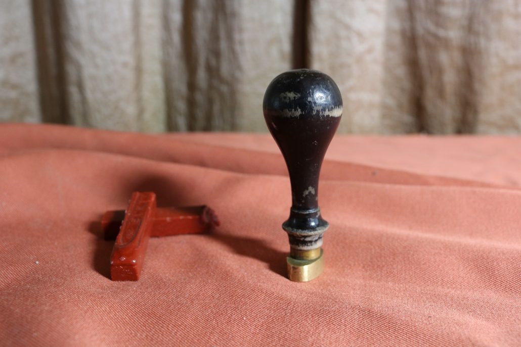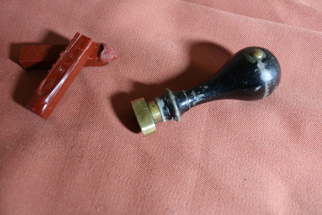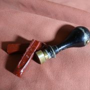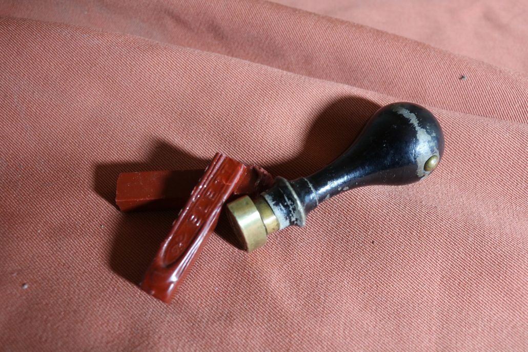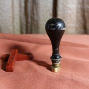 Timbro in legno e bronzo con cartiglio raffigurante la lettera B. L’impugnatura è costituta da una parte in legno ebanizzato e consente di sostenere il timbro per effettuare la dovuta pressione sul cilindro in bronzo ed imprimere quindi il sigillo nella cera.