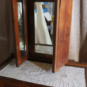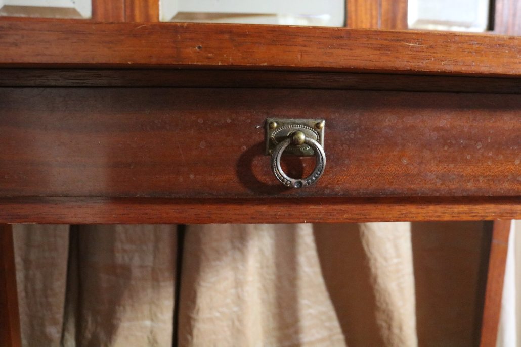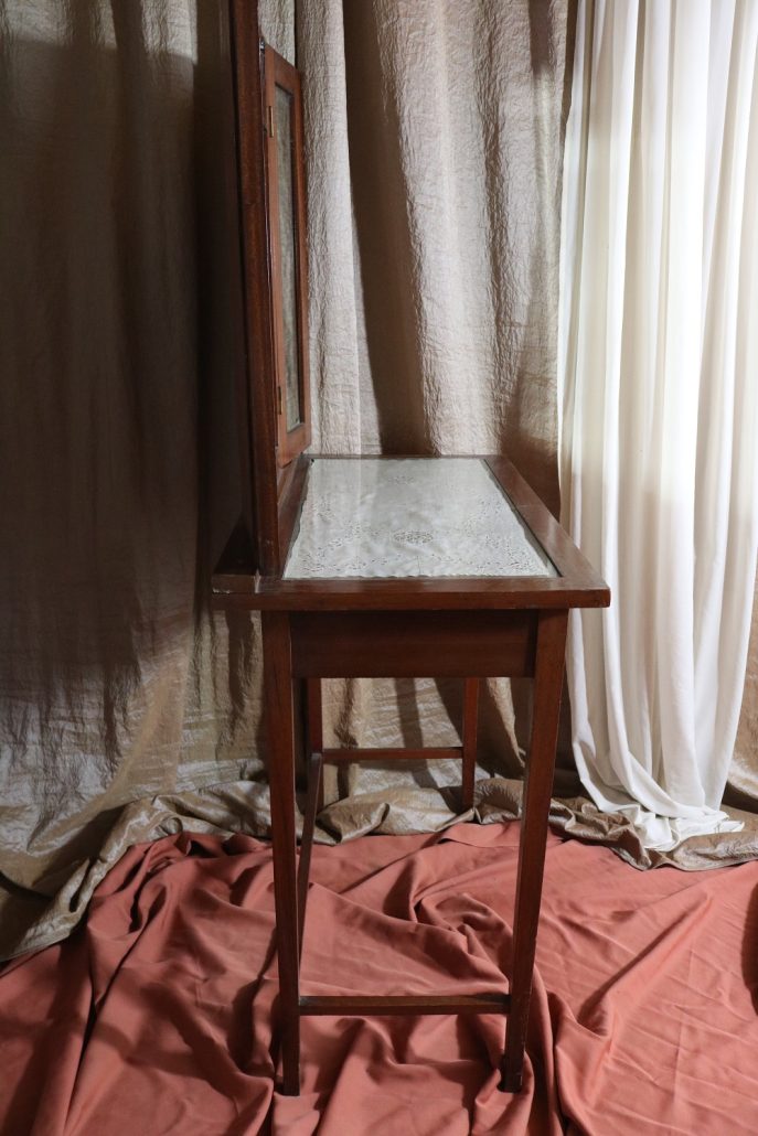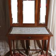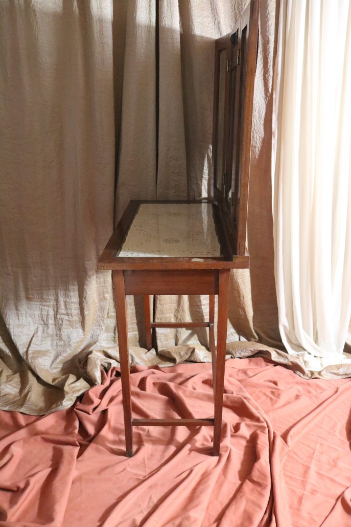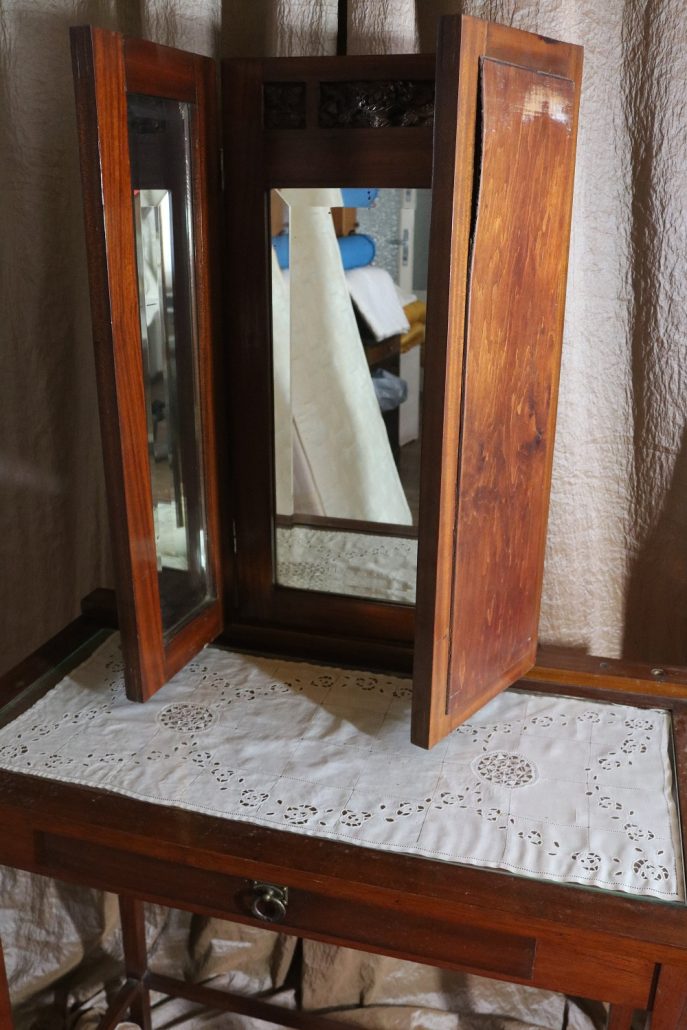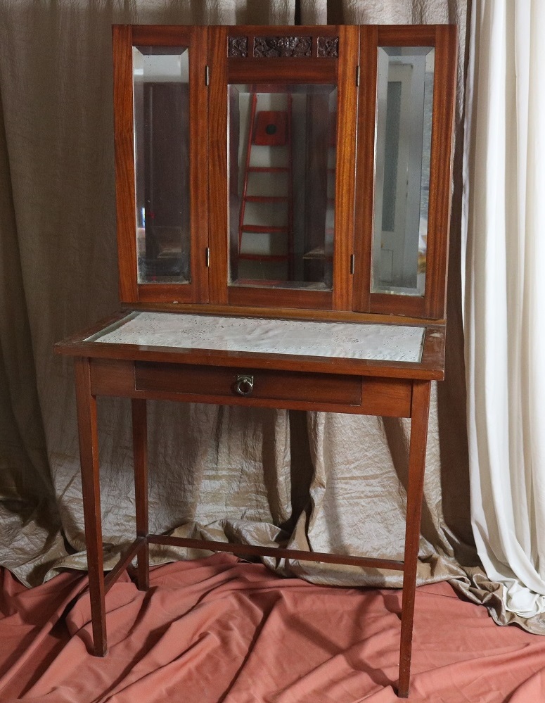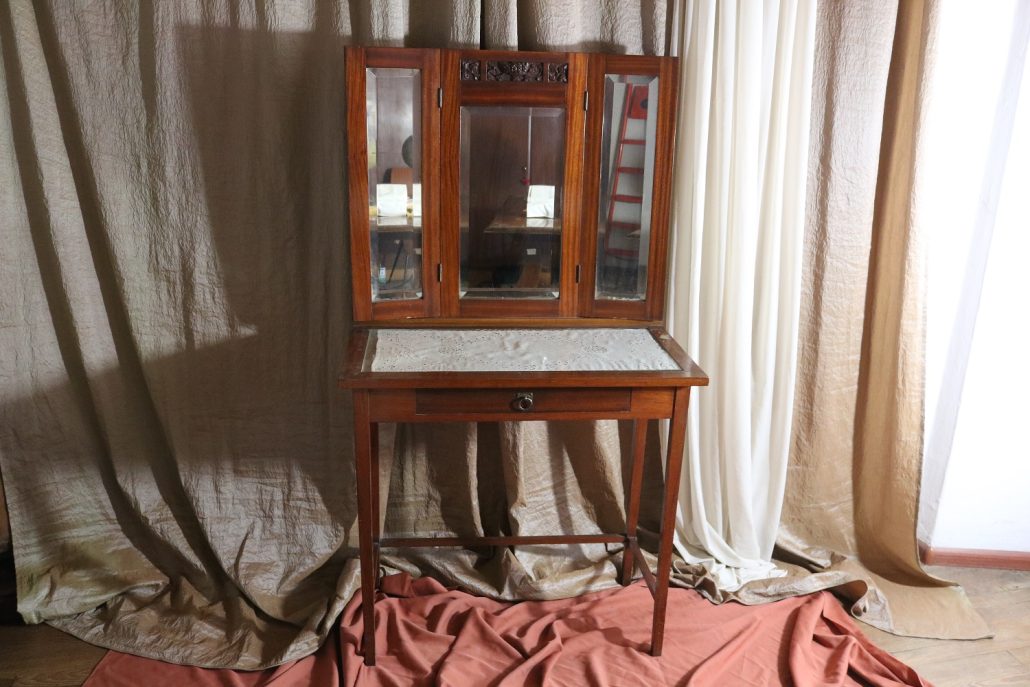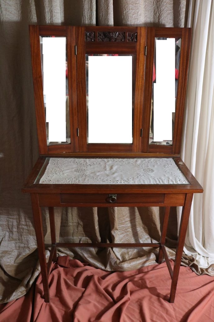 A sormontare il piccolo mobile uno specchio diviso in tre parti di cui quella centrale più ampia e decorata con un fregio a bassorilievo intagliato con fiori e foglie.