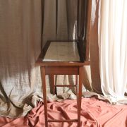 Quattro gambe mosse rastremate verso il basso e unite tra loro da traversi sorreggono una piana leggermente aggettante con al centro pianetto in vetro (sostituito a probabile marmo in restauro precedente).