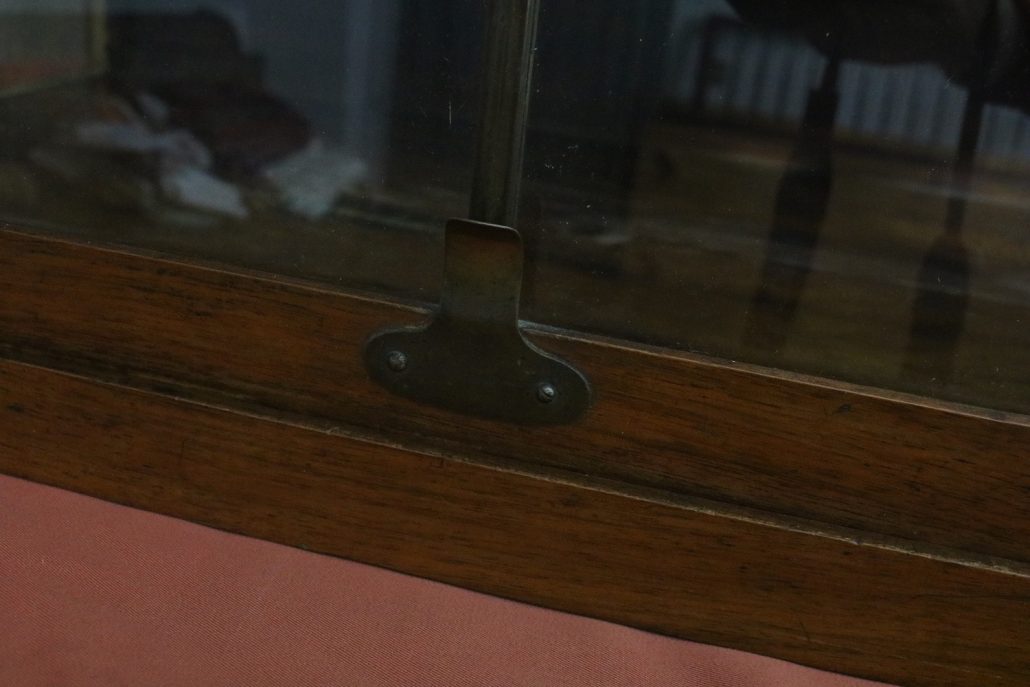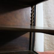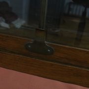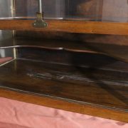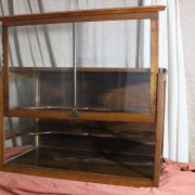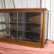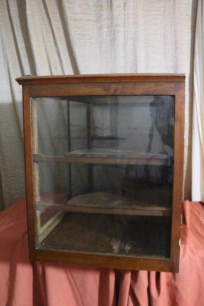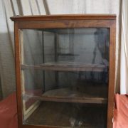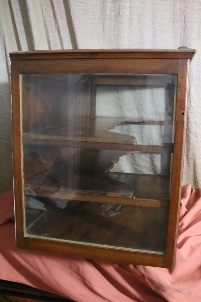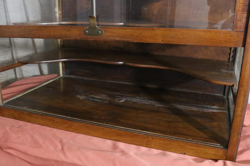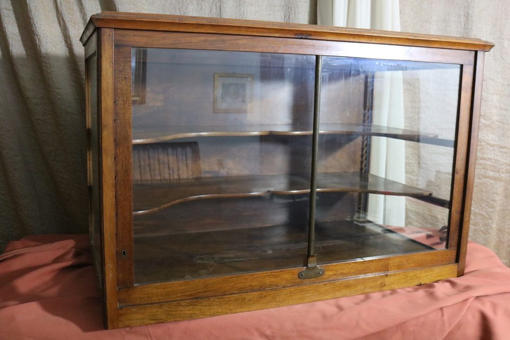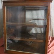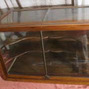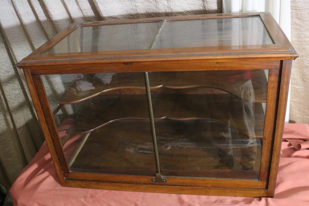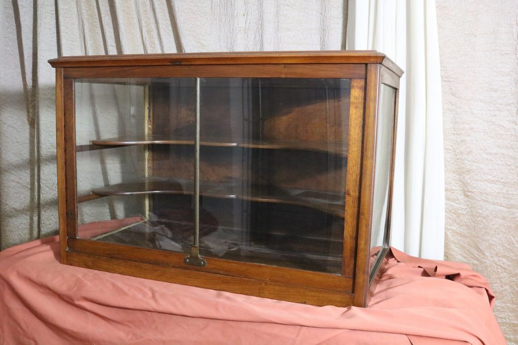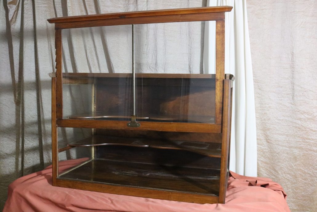 Vetrinetta da appoggio in ciliegio, mobile espositivo di forma a parallelepipedo caratterizzata da tre lati con vetro racchiusi da una semplice intelaiatura. Unica decorazione la cornice a civetta a delimitare la parte superiore leggermente aggettante. Frontalmente il mobile è munito di un’anta scorrevole verso l’alto per poter accedere all’interno della vetrinetta. Lo schienale in legno fa da sfondo a due ripiani sagomati regolabili in altezza mediante un sistema a rastrelliera. Il mobile presenta una piccola serratura la cui chiave è mancante. Questo arredo, molto particolare, trovava collocazione in studi medici o in farmacie. La sua semplicità nella forma denota proprio un uso più lavorativo che decorativo. Di bella proporzione, la sua linearità lo rende perfetto per esporre oggetti o collezioni.