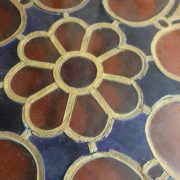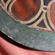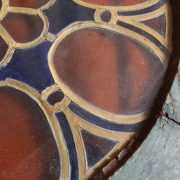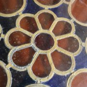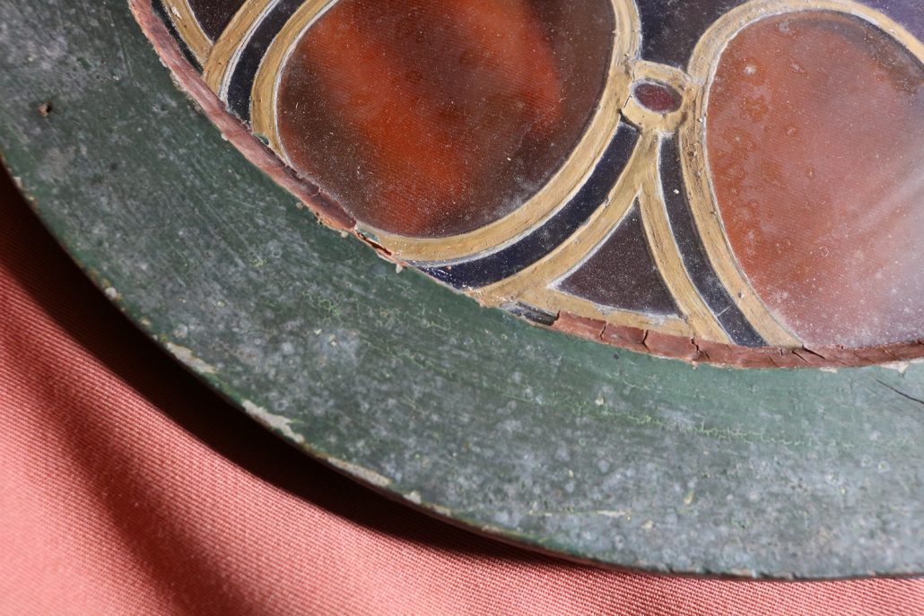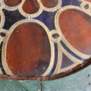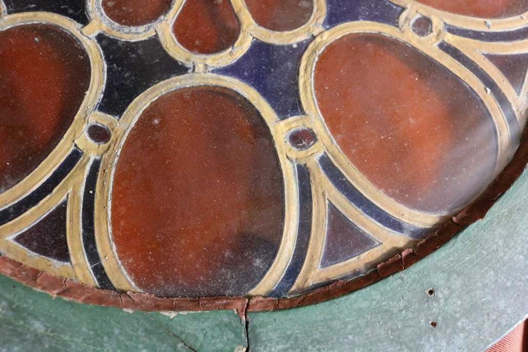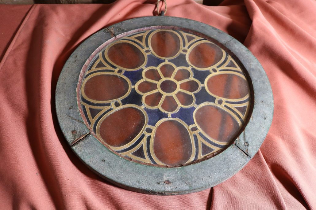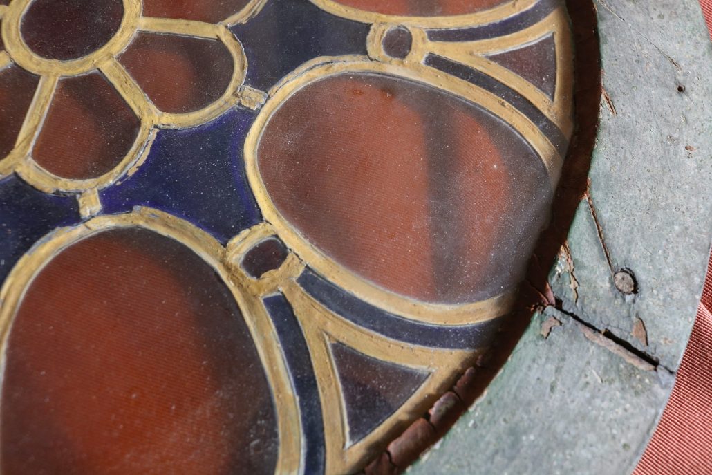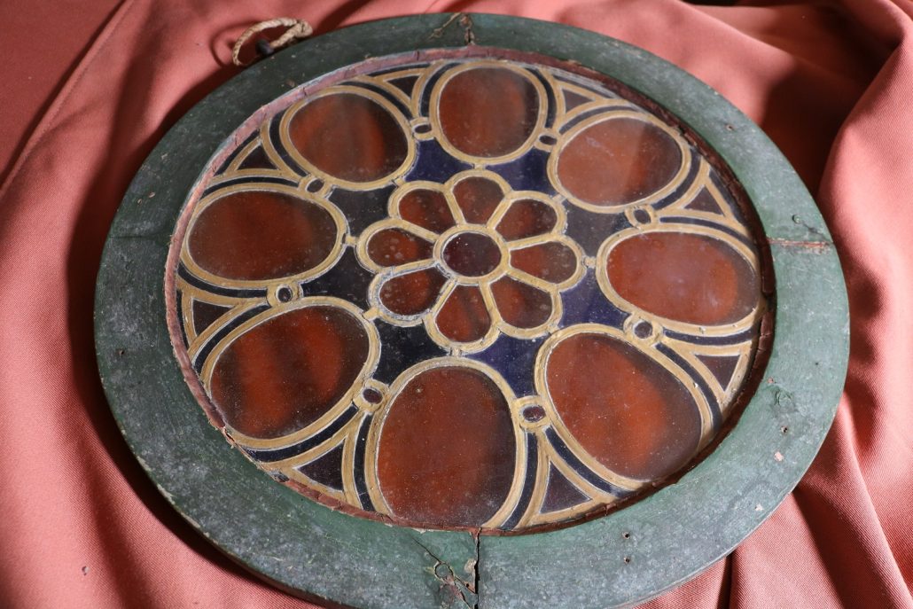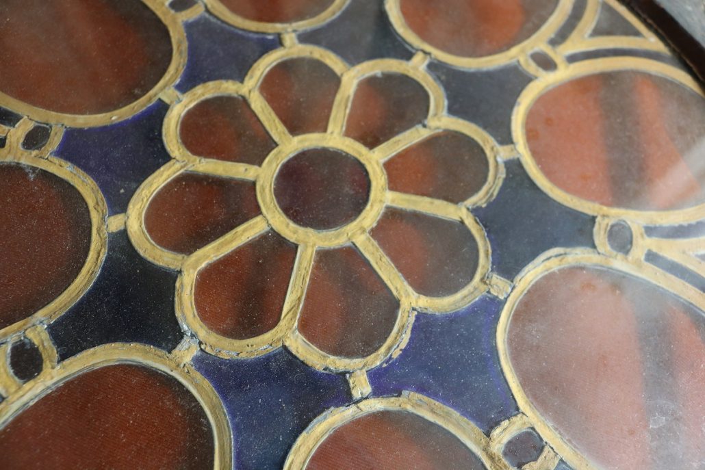 Vetro da finestra tondo composto da vetri colorati blu trasparenti e decorati con un motivo a nastro di colore giallo ocra.